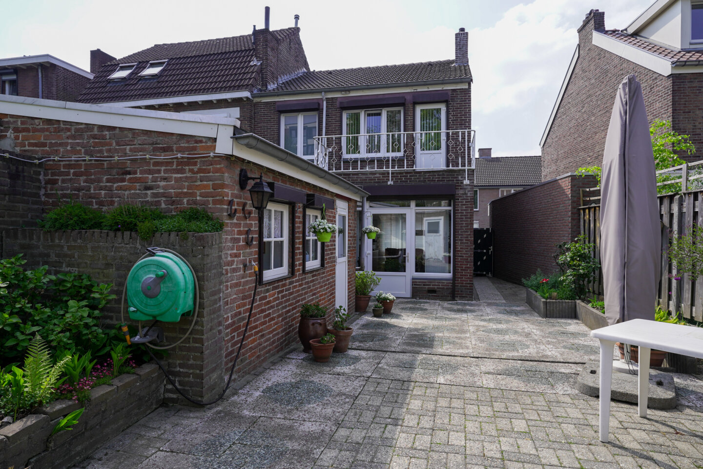 Ruim terras, beplanting en een hobbykas.