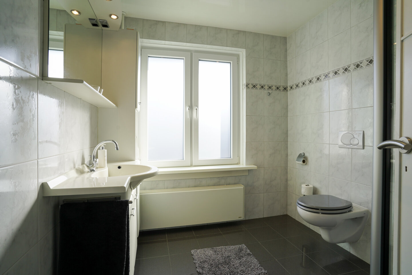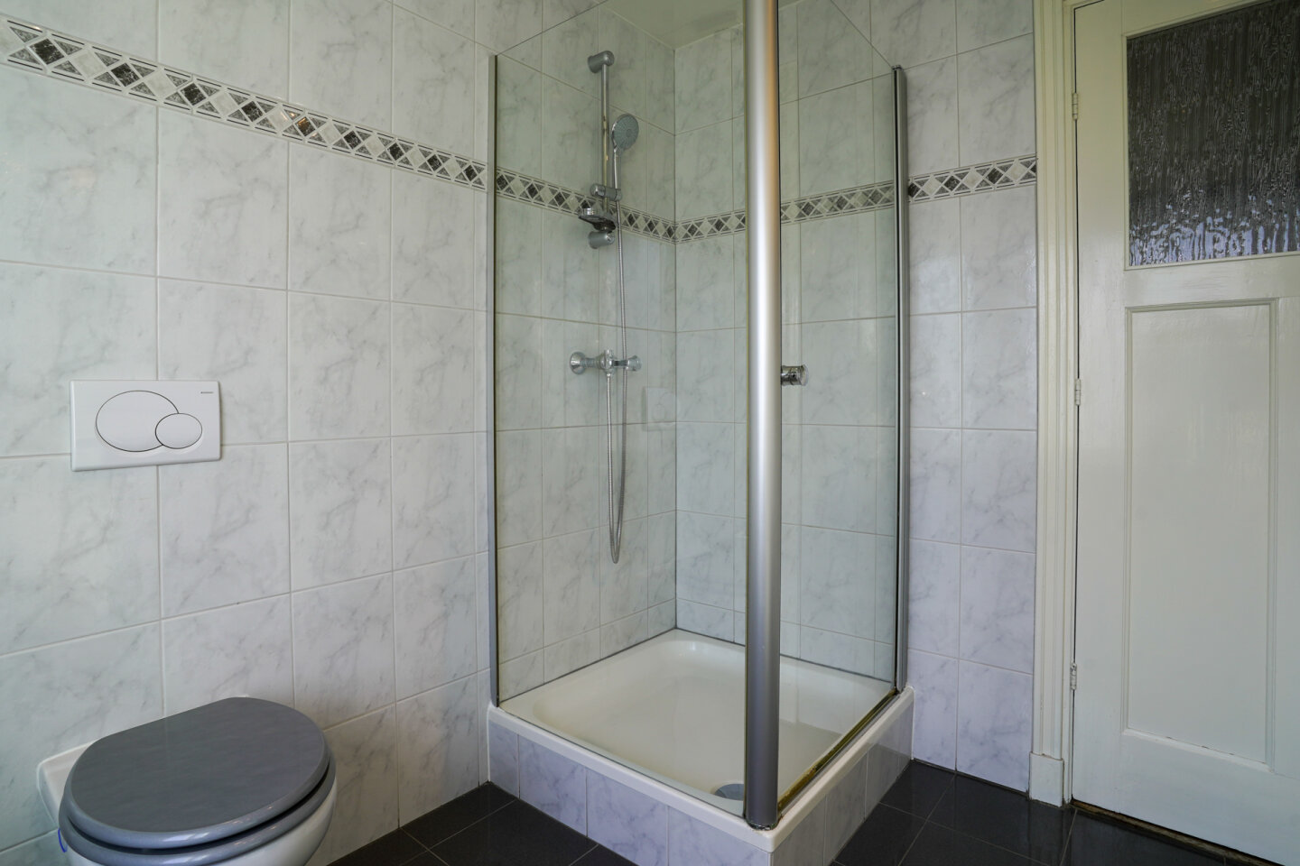Badkamer(5,7m2). Een nette, goed onderhouden badkamer voorzien van tweede toilet, douche en wastafelmeubel.