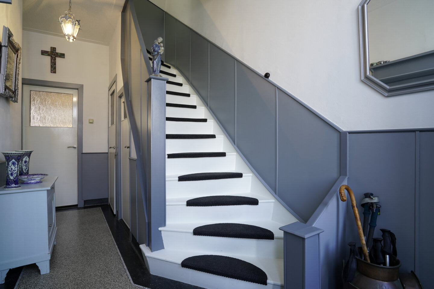 Trap naar de eerste verdieping en toegang naar de keuken.