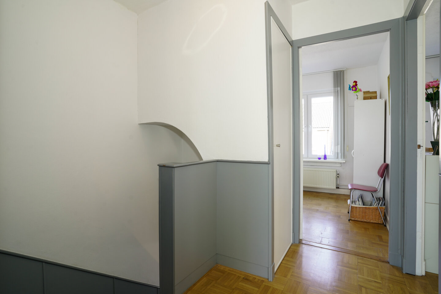 Overloop met toegang naar drie slaapkamers en de badkamer. Een vaste trap biedt toegang naar de tweede verdieping.