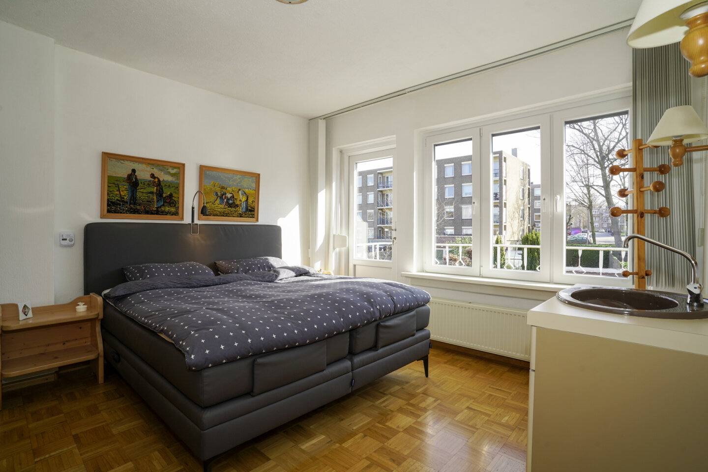 Slaapkamer I (14m2) gelegen aan de achterzijde van de woning en biedt toegang naar het balkon.