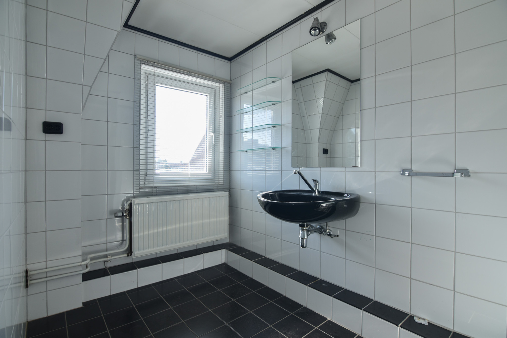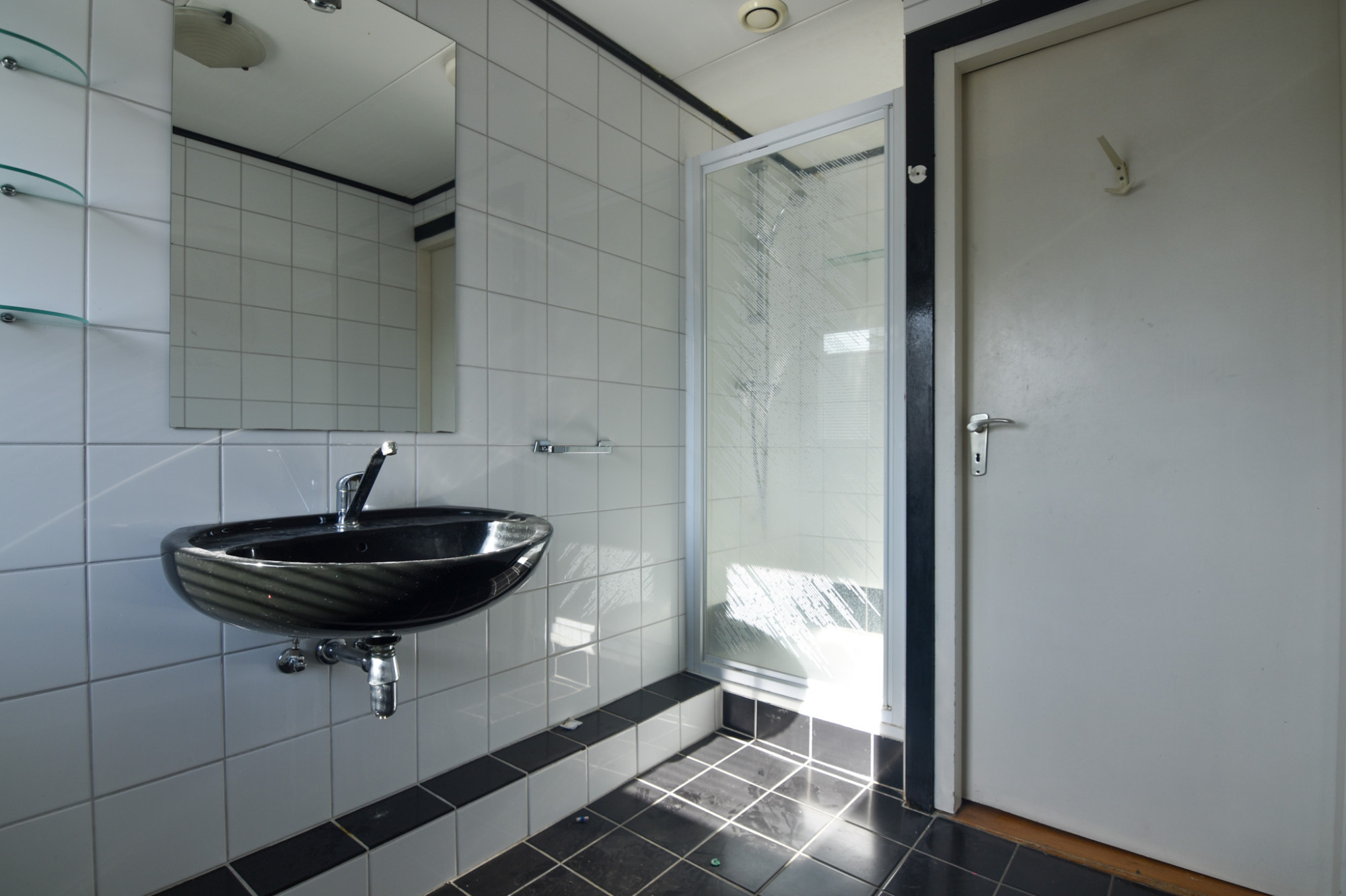 De betegelde badkamer (3,35 m x 1,72 m) is v.v. vaste wastafel en douche