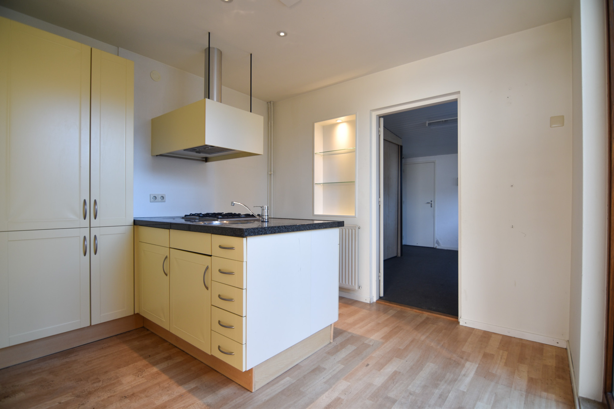 De keuken (3,10 m x 2,87 m) met installatie en apparatuur t.w.: vaatwasser, 4 pits gaskookplaat, afzuigkap en koelkast. Vanuit de keuken heeft men toegang tot bijkeuken, de bijkeuken (4,26 m x 3,10 m) met vaste kastenwand, aansluiting voor witgoedapparatuur biedt toegang tot toiletruimte, berging en tuin. Inpandig te bereiken ruime berging (3,51 m x 2,79 m) met deur naar tuin