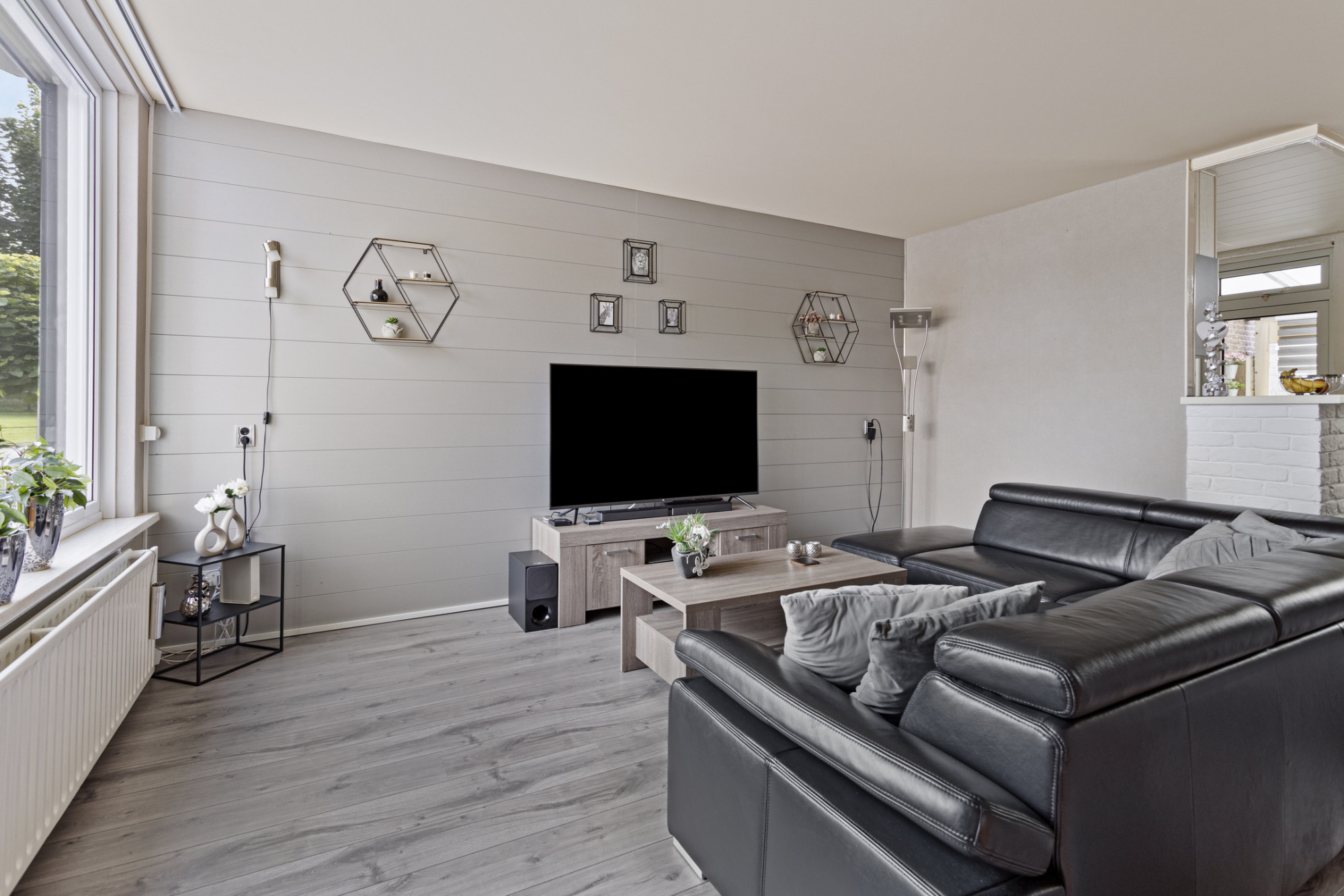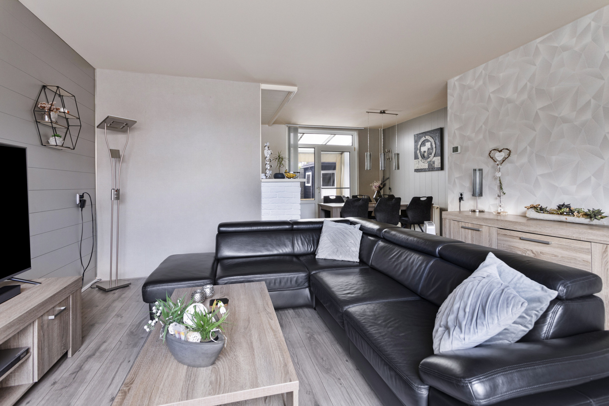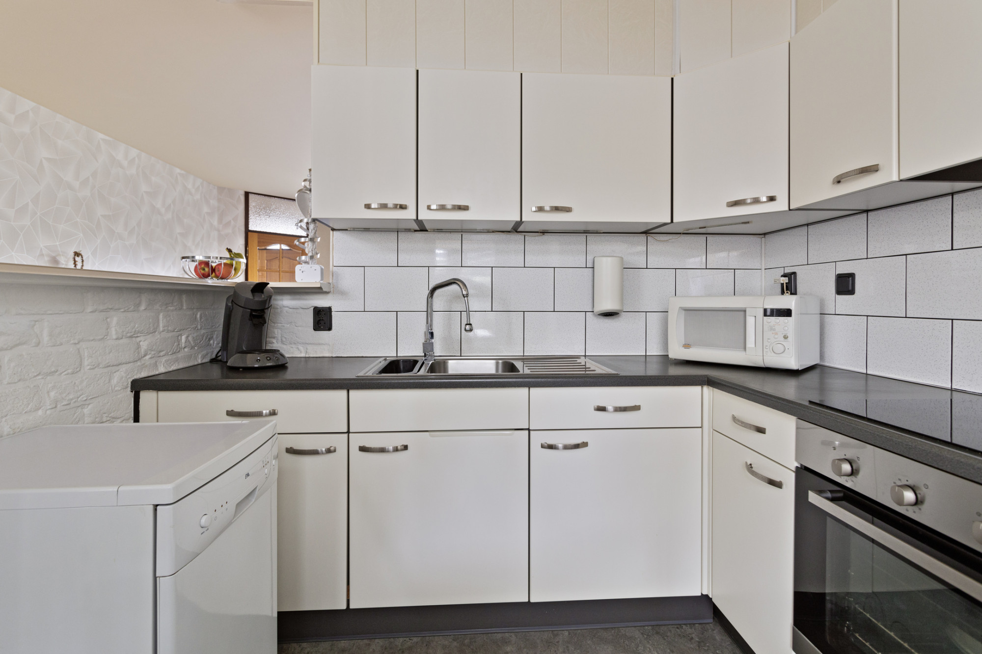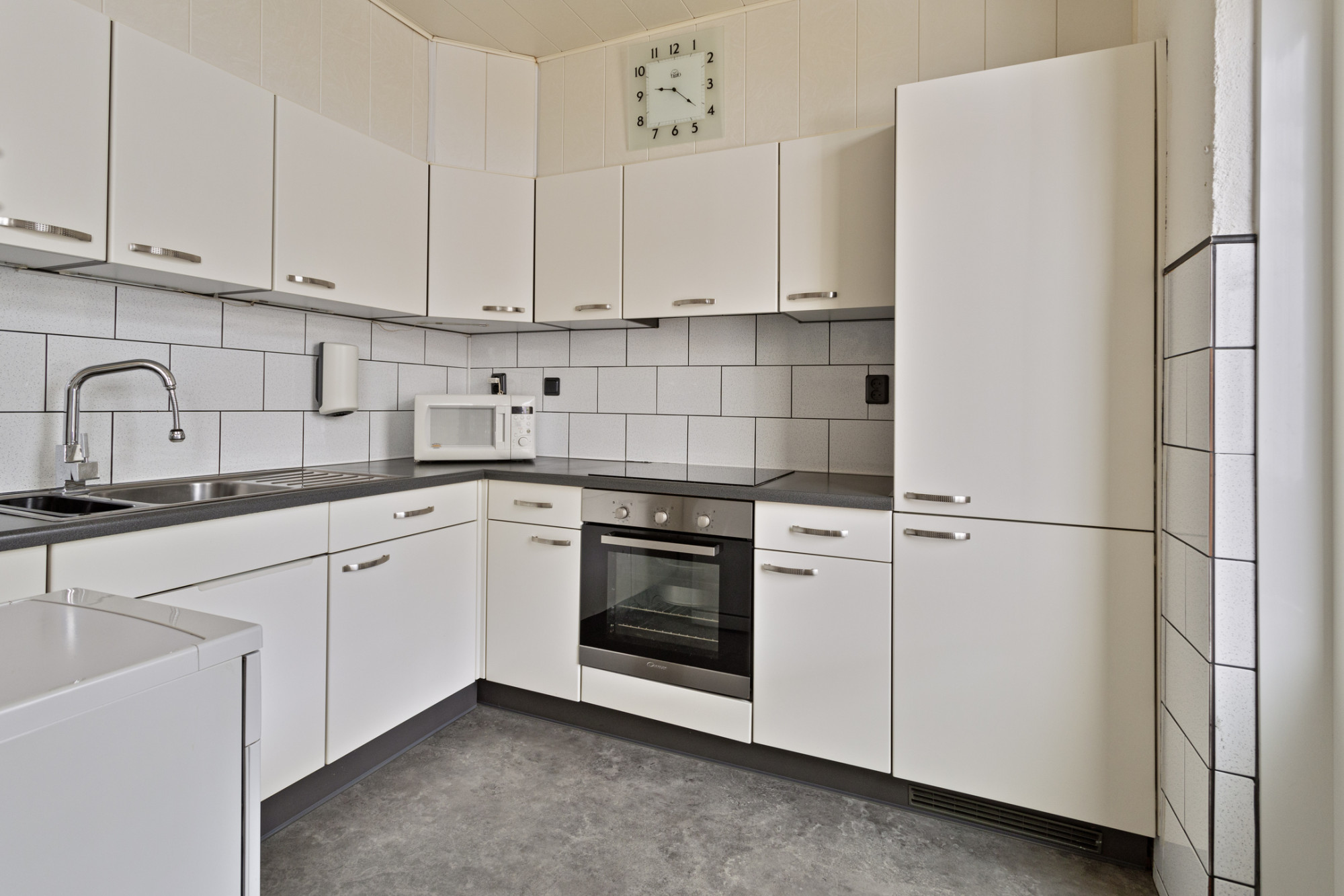 Half open keuken met in hoekvorm opgestelde keukeninstallatie met apparatuur te weten: inductie kookplaat, oven, afzuigkap, vriezer, koelkast en stand-alone vaatwasser.