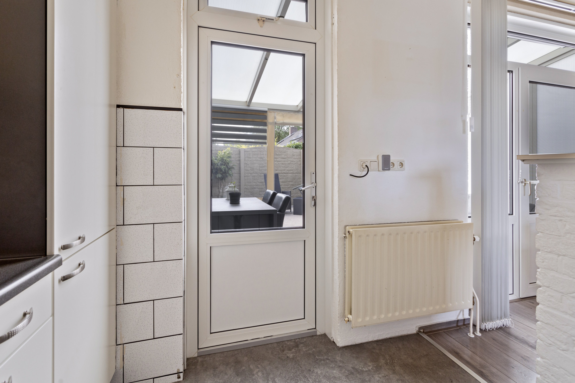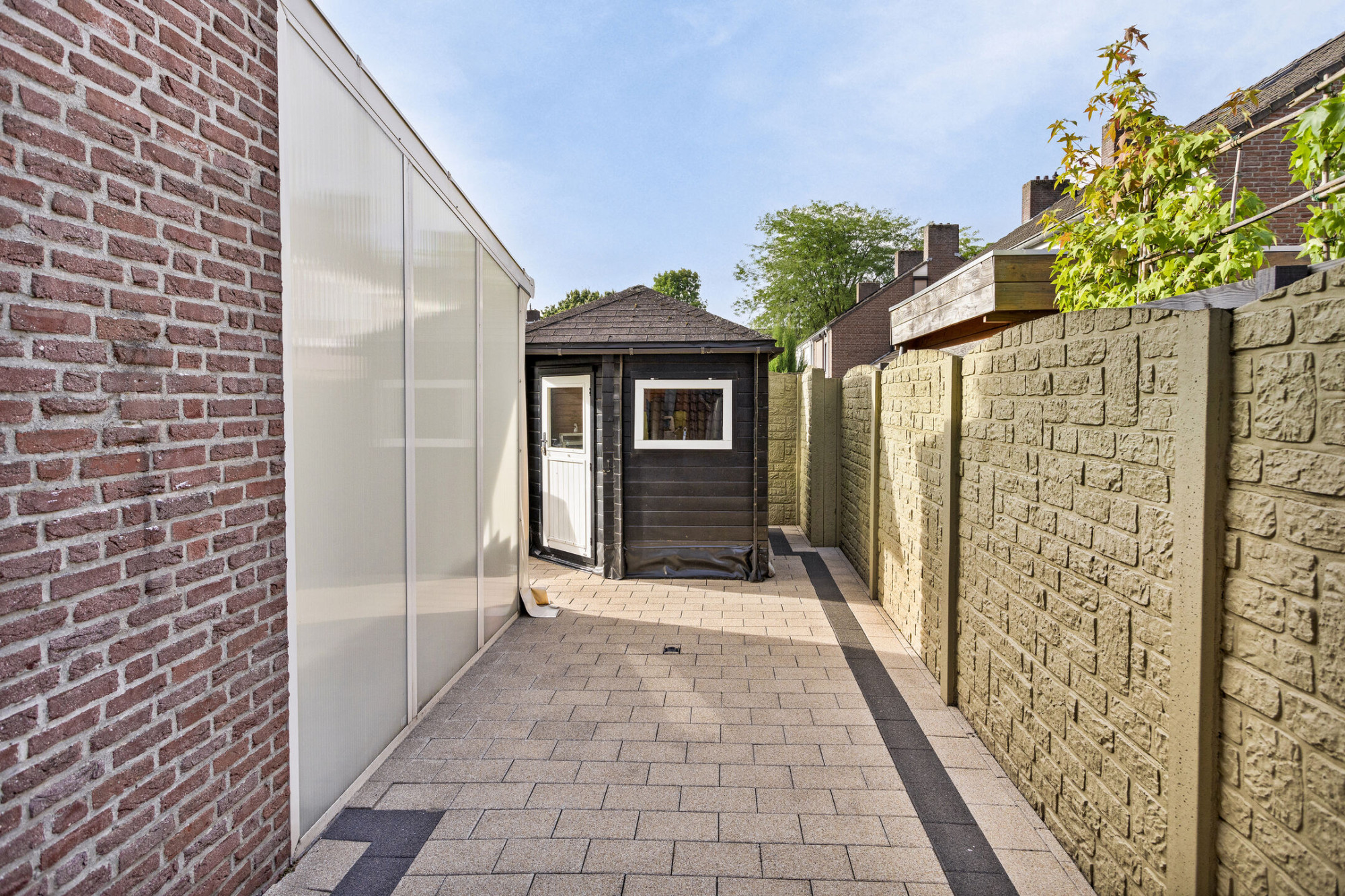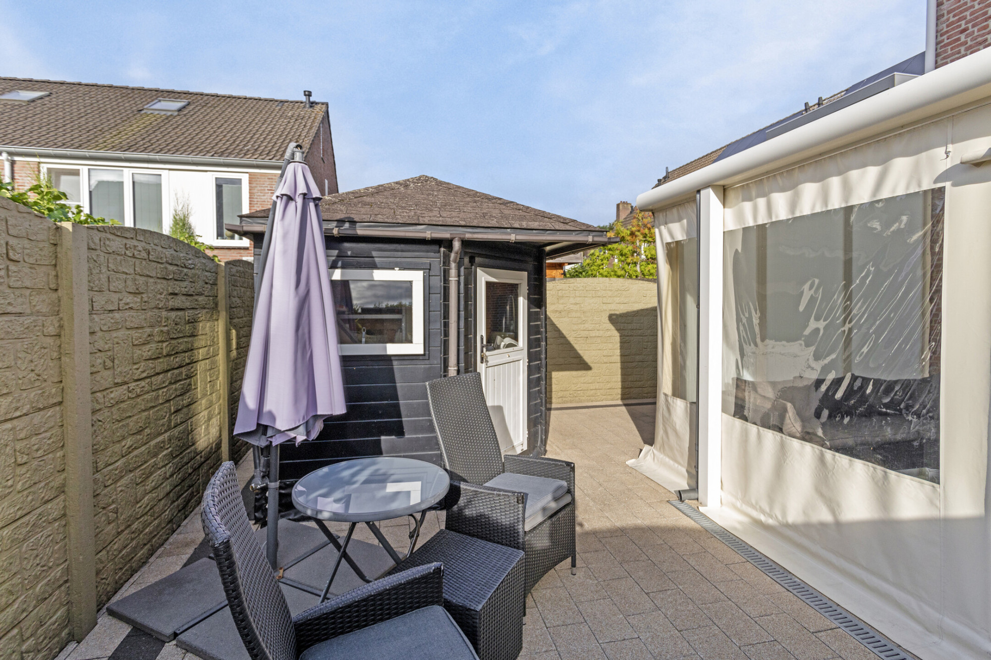 Achtertuin met terras, tuinberging, sierbeton afscheiding en toegang naar garage.