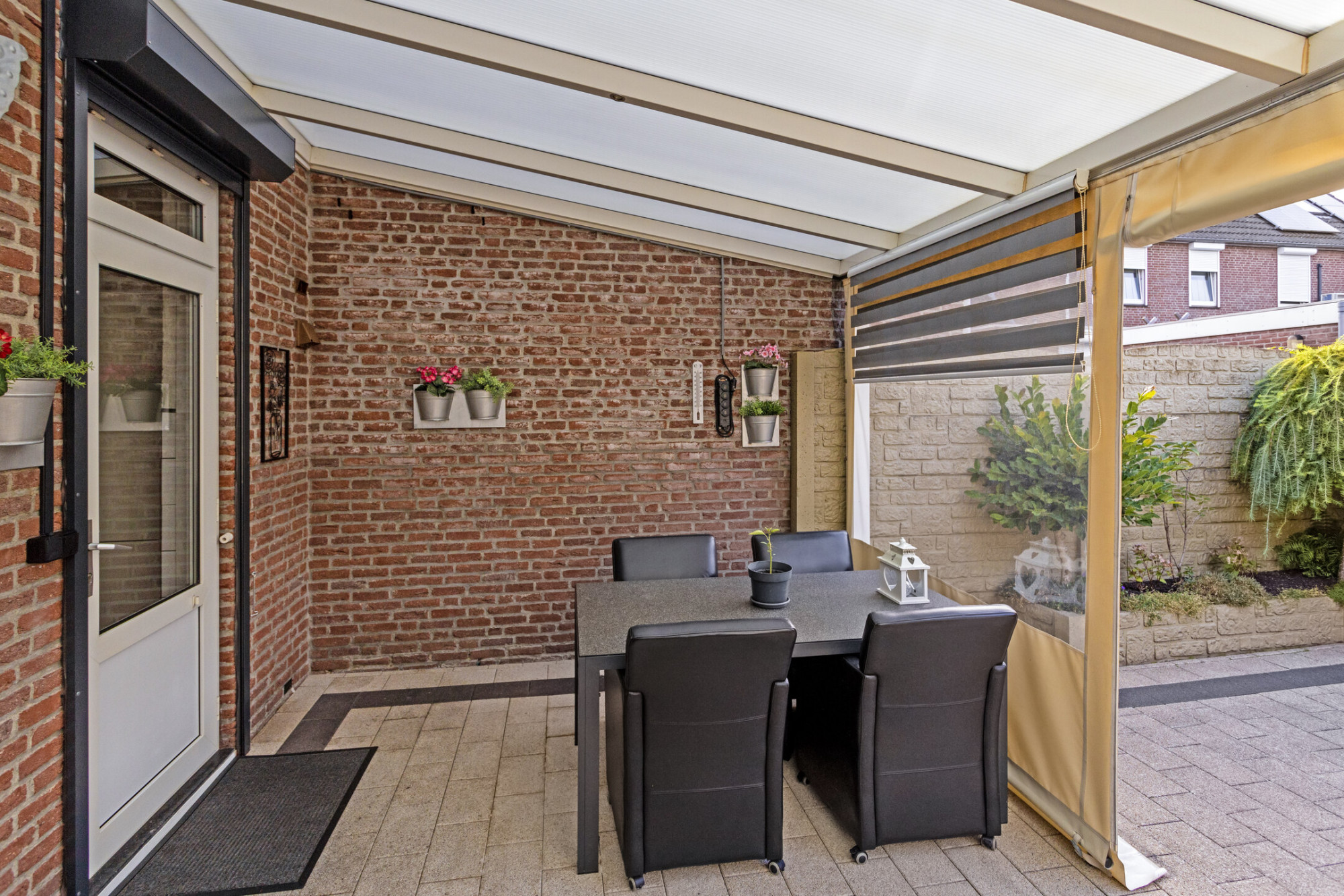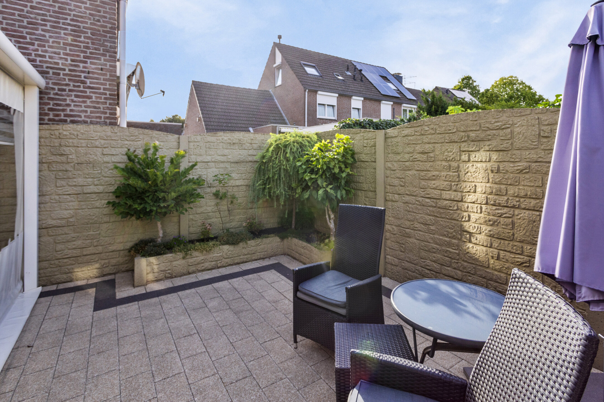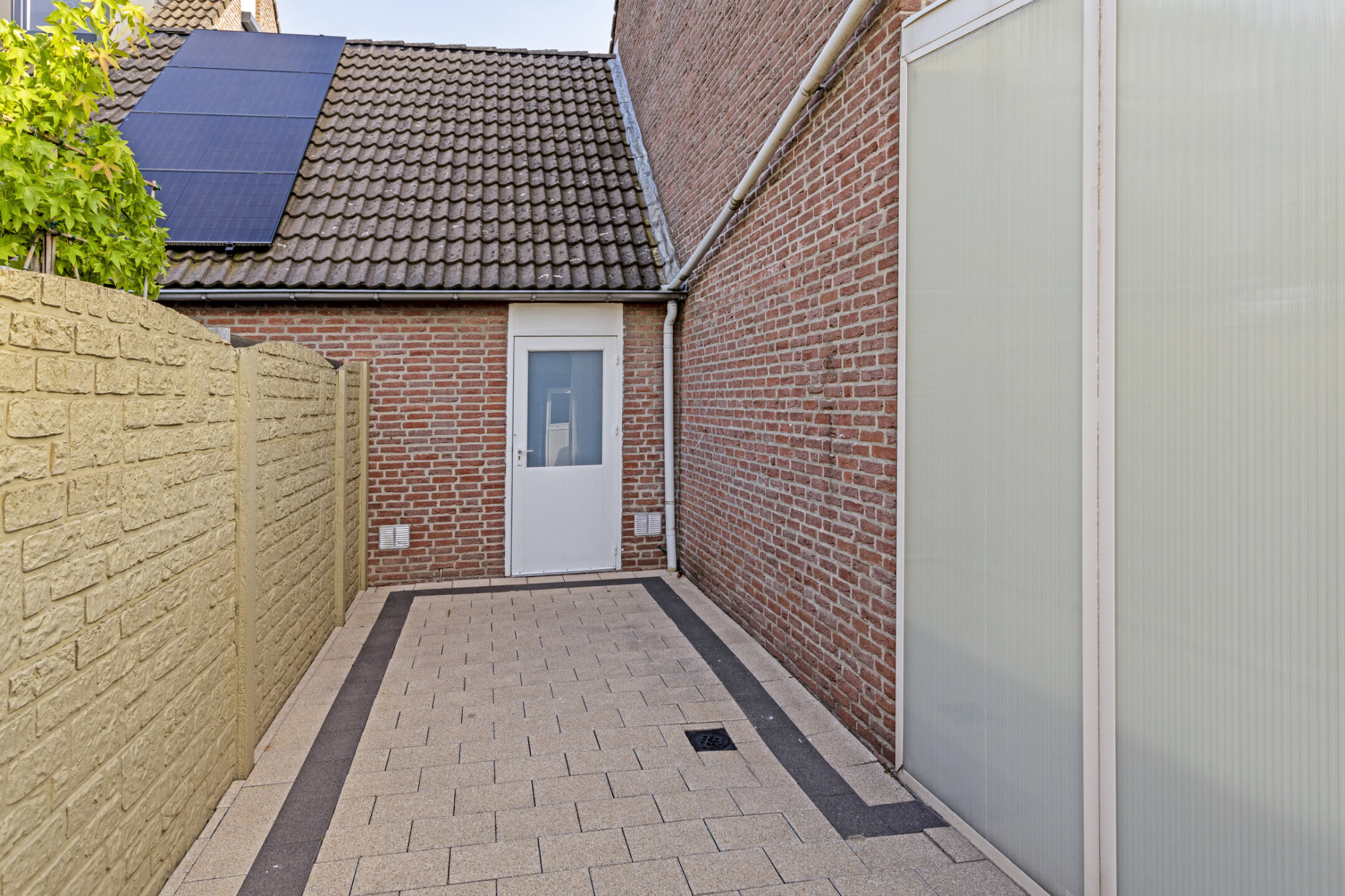 Achtertuin met terras, tuinberging, sierbeton afscheiding en toegang naar garage.
