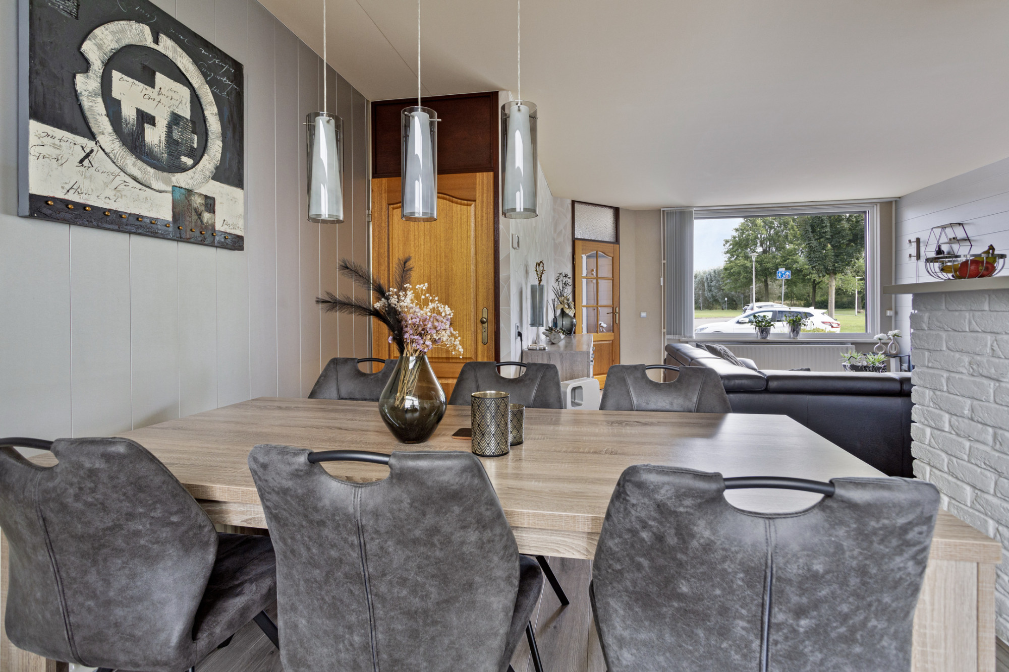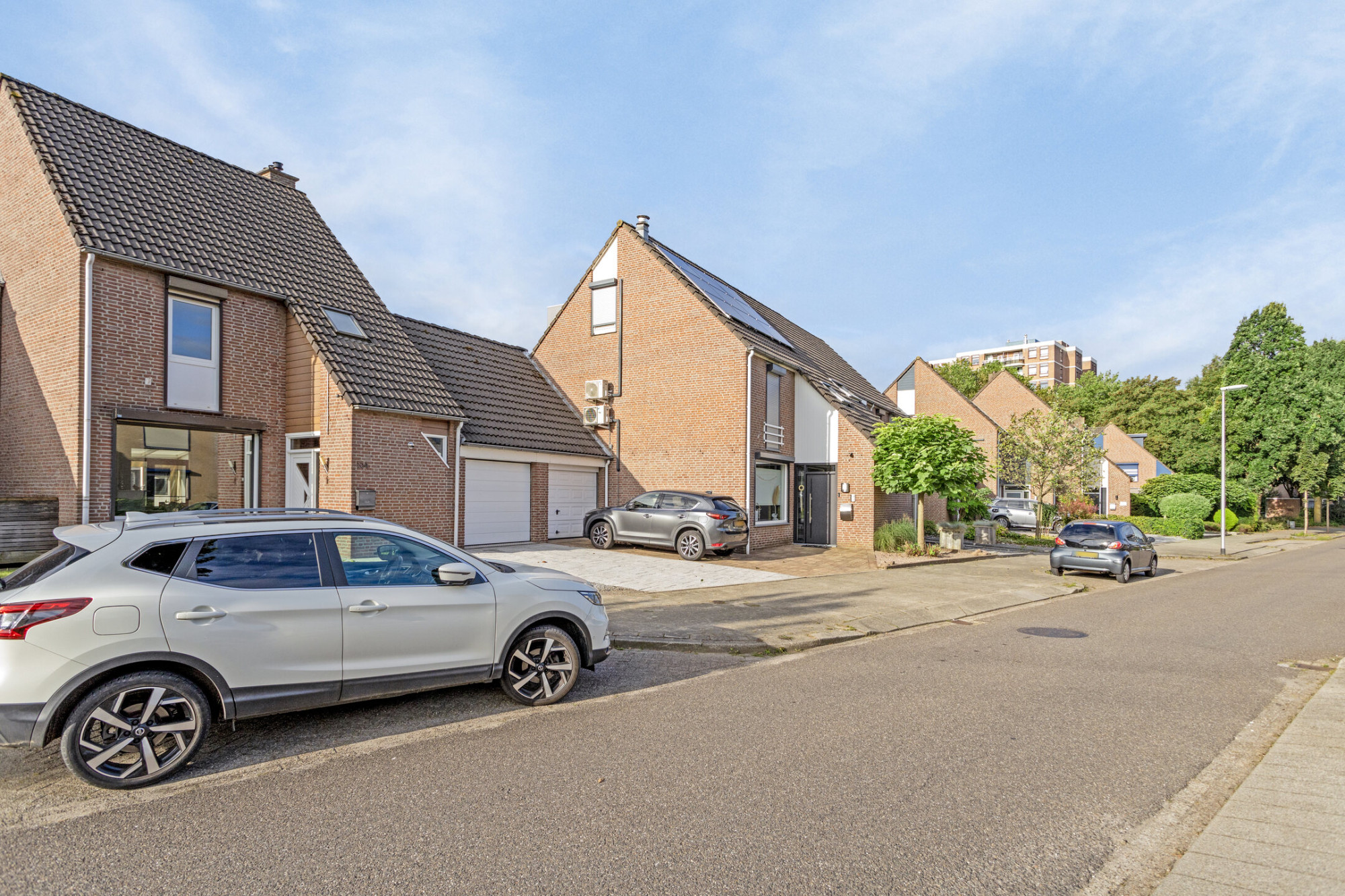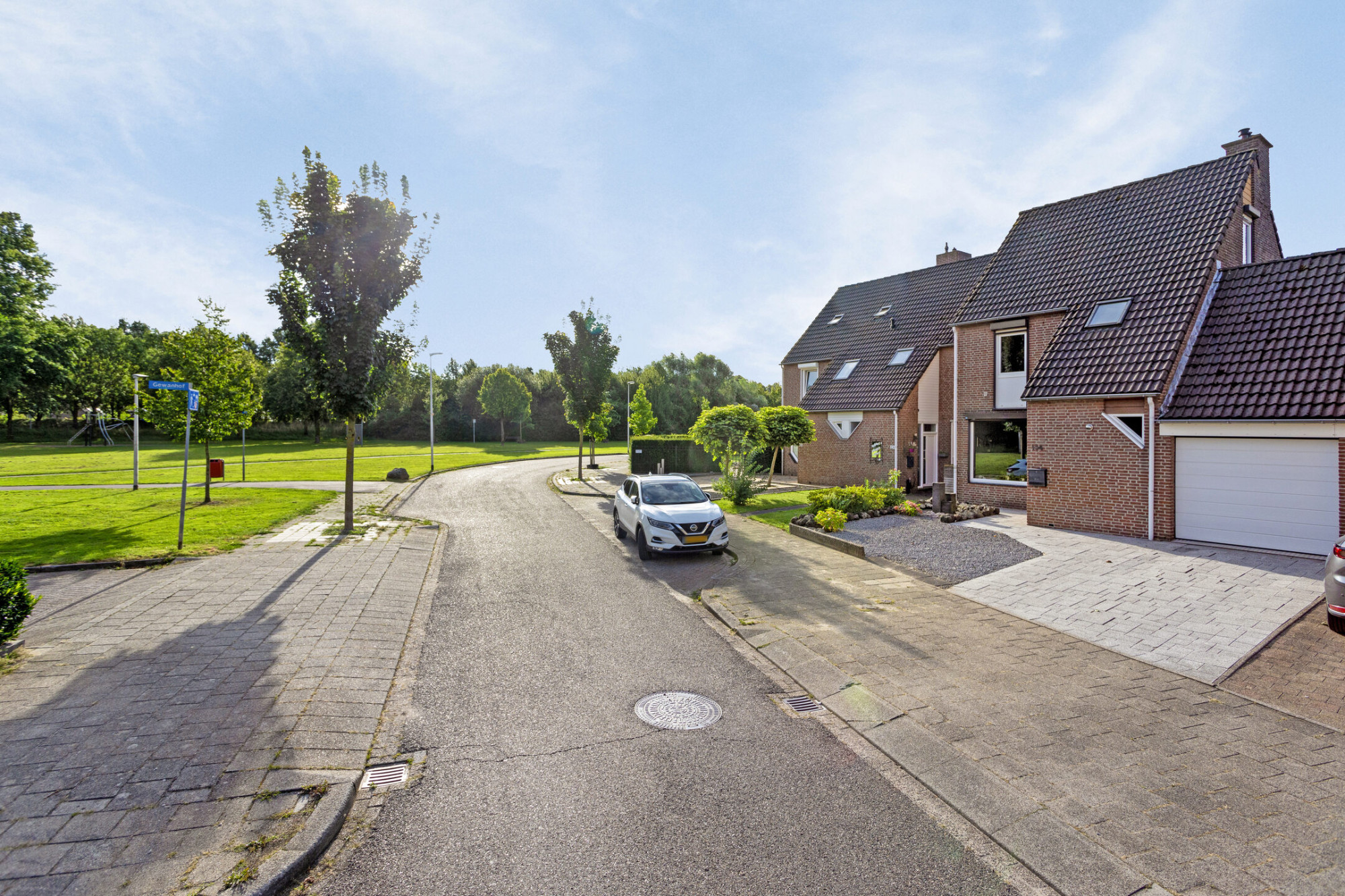 Voortuin met ruime inrit naar garage en entree.