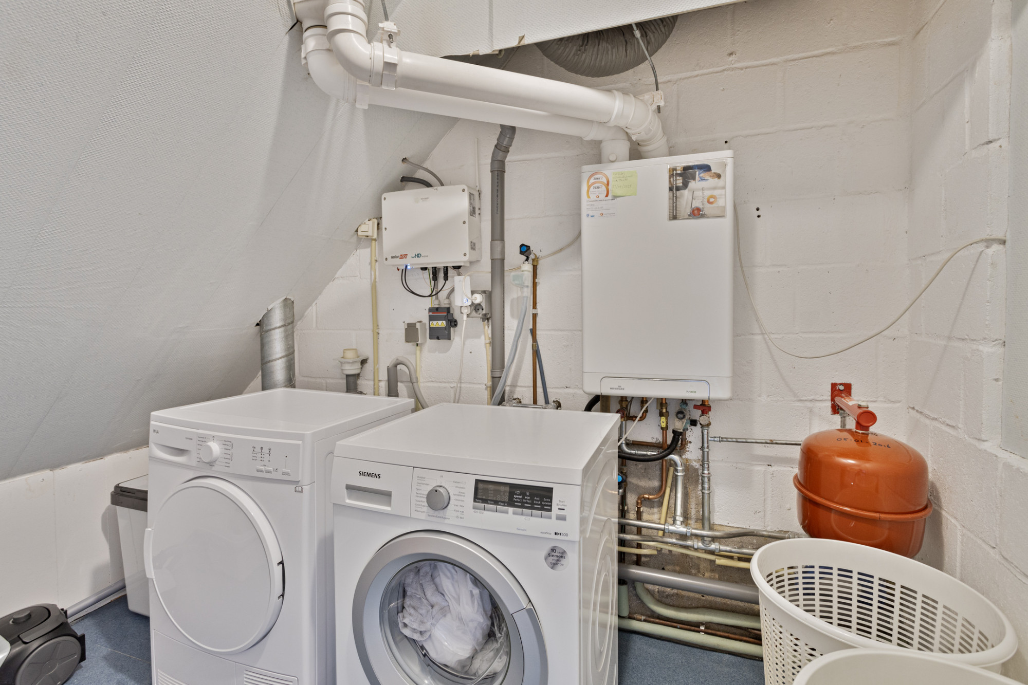 Technische ruimte/berging/witgoedruimte met opstelling CV combi installatie (Intergas HR, 2016, eigendom) en witgoedaansluitingen.