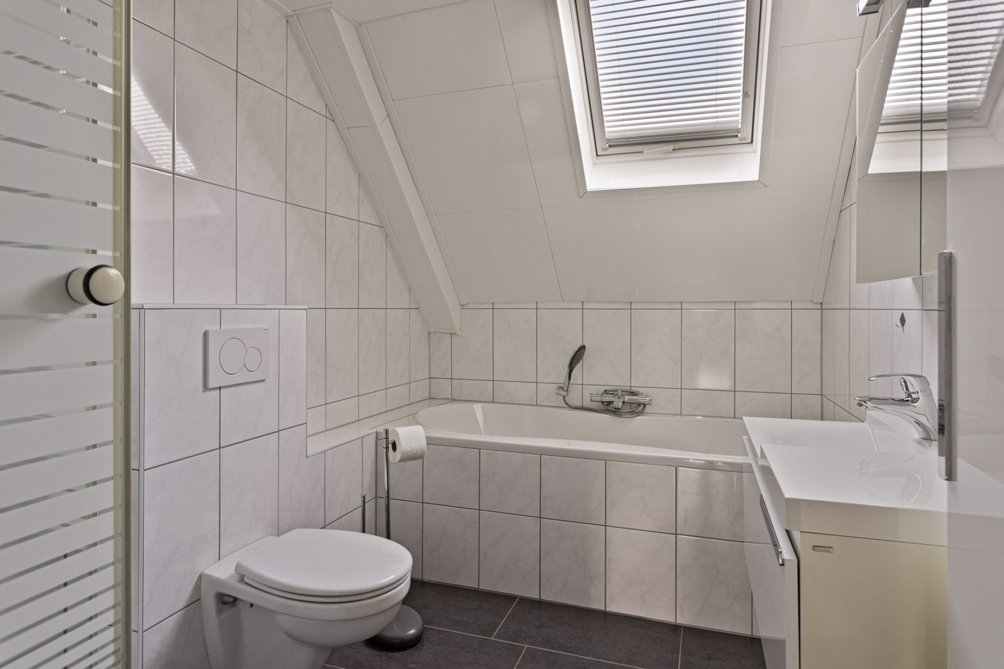 Geheel betegelde badkamer (3.50 x 2.16 m)(in 2014 vernieuwd) voorzien van dakraam, ligbad, douche, vaste wastafel met badmeubel, design radiator en zwevend toilet.