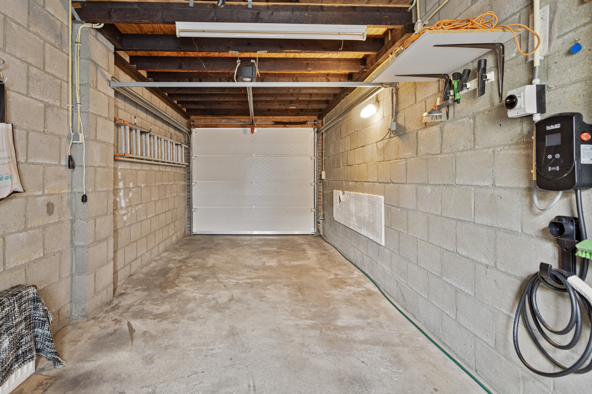 Garage (6.57 x 2.70 m) met elektrisch bedienbare sectionaalpoort en toegang tot ruime vliering.
