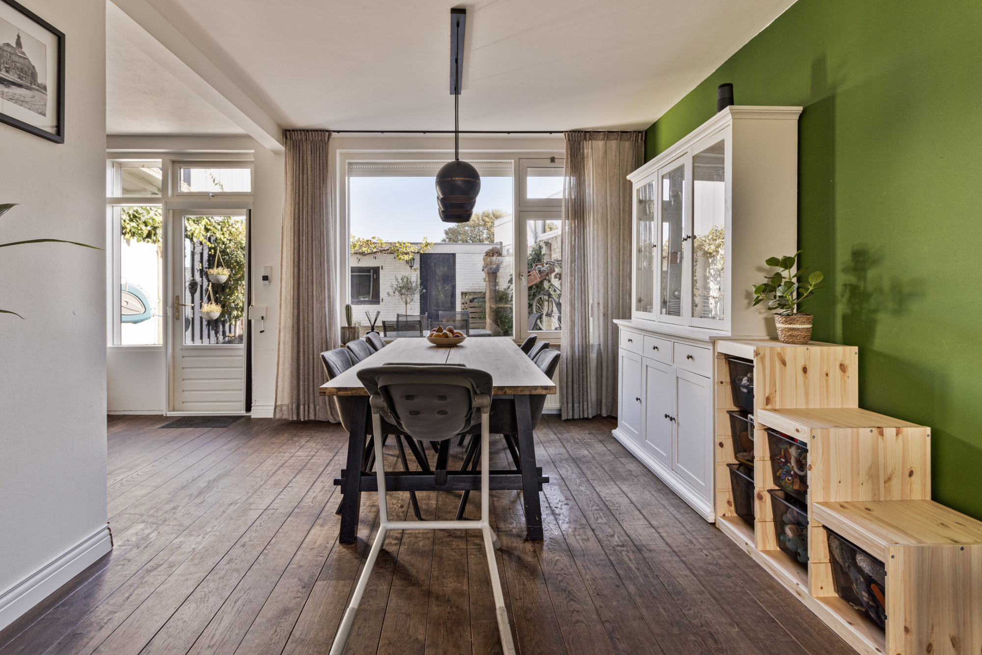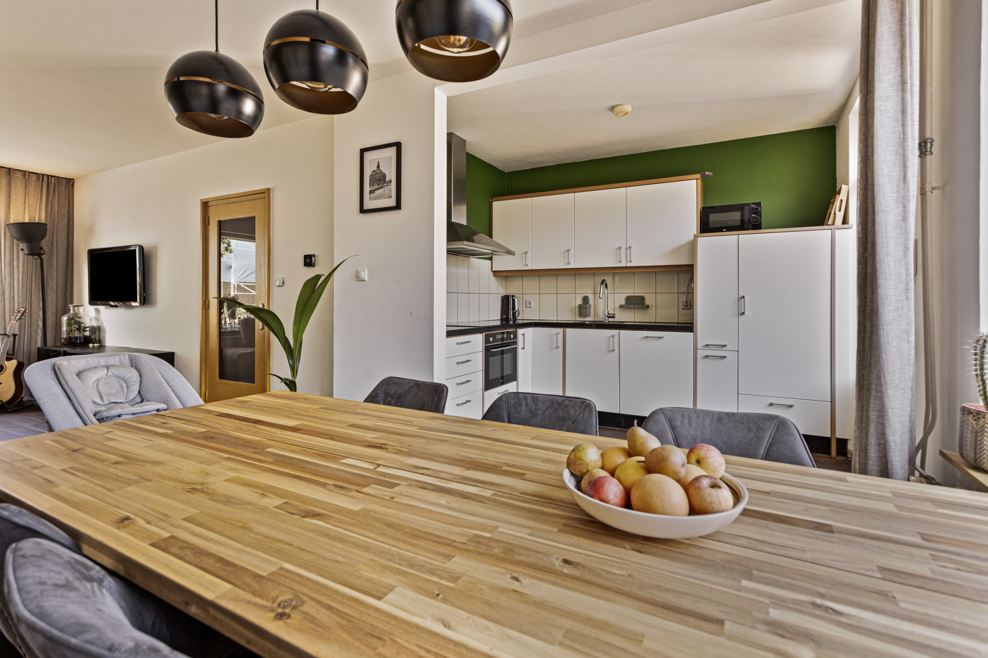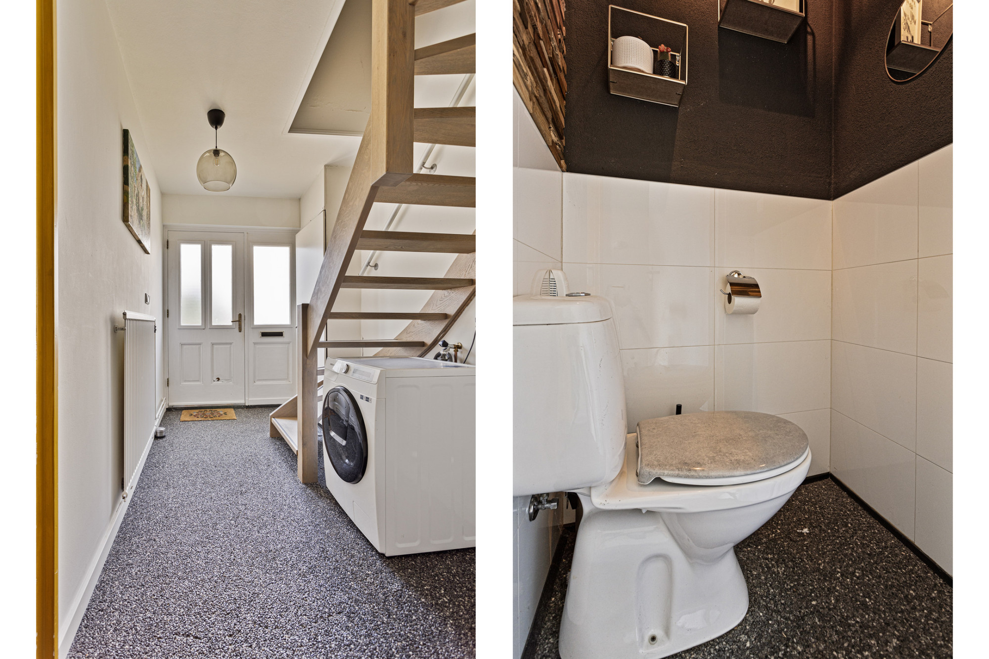 Hal met meterkast, verdiepingstrap en toiletruimte. Onder de trap is er een aansluiting voor de wasapparatuur. Doorzon woonkamer met houten vloerdelen en halfopen keuken voorzien van een keukeninstallatie met diverse inbouwapparatuur.