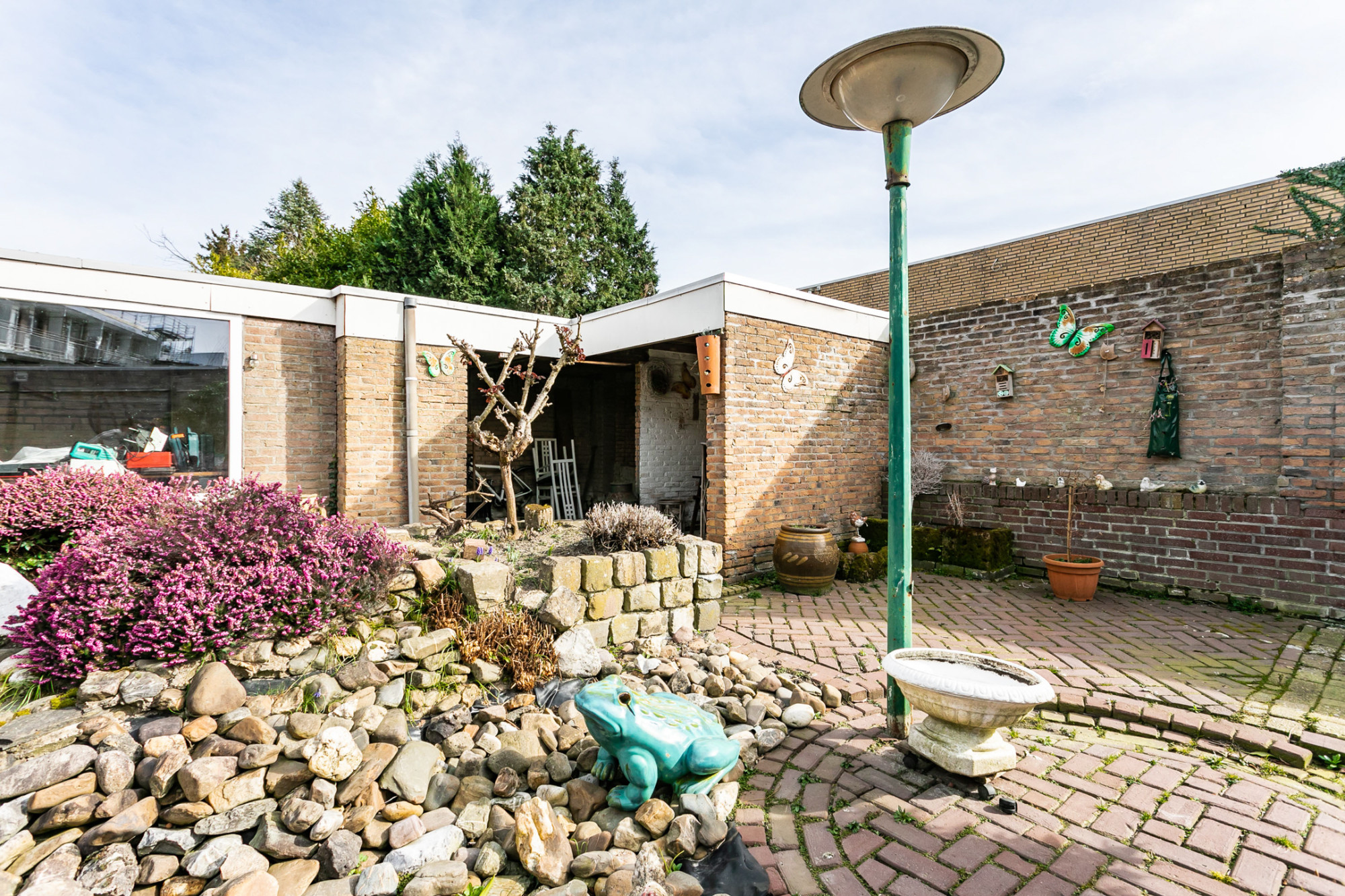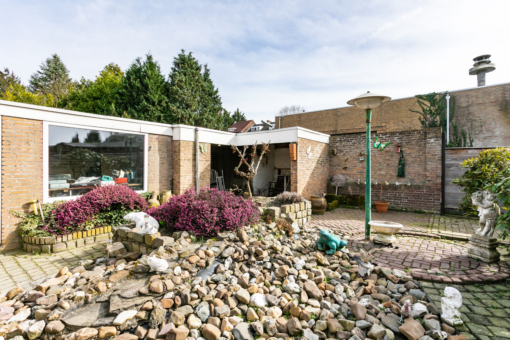 Royale onderhoudsvriendelijke achtertuin, gesitueerd op het zuiden, voorzien van een ruime beklinkerde terrassen, overdekte zithoek en veel privacy. Borders met aanplanting, een tuinberging met uitstortgootsteen en toegang tot de garage.