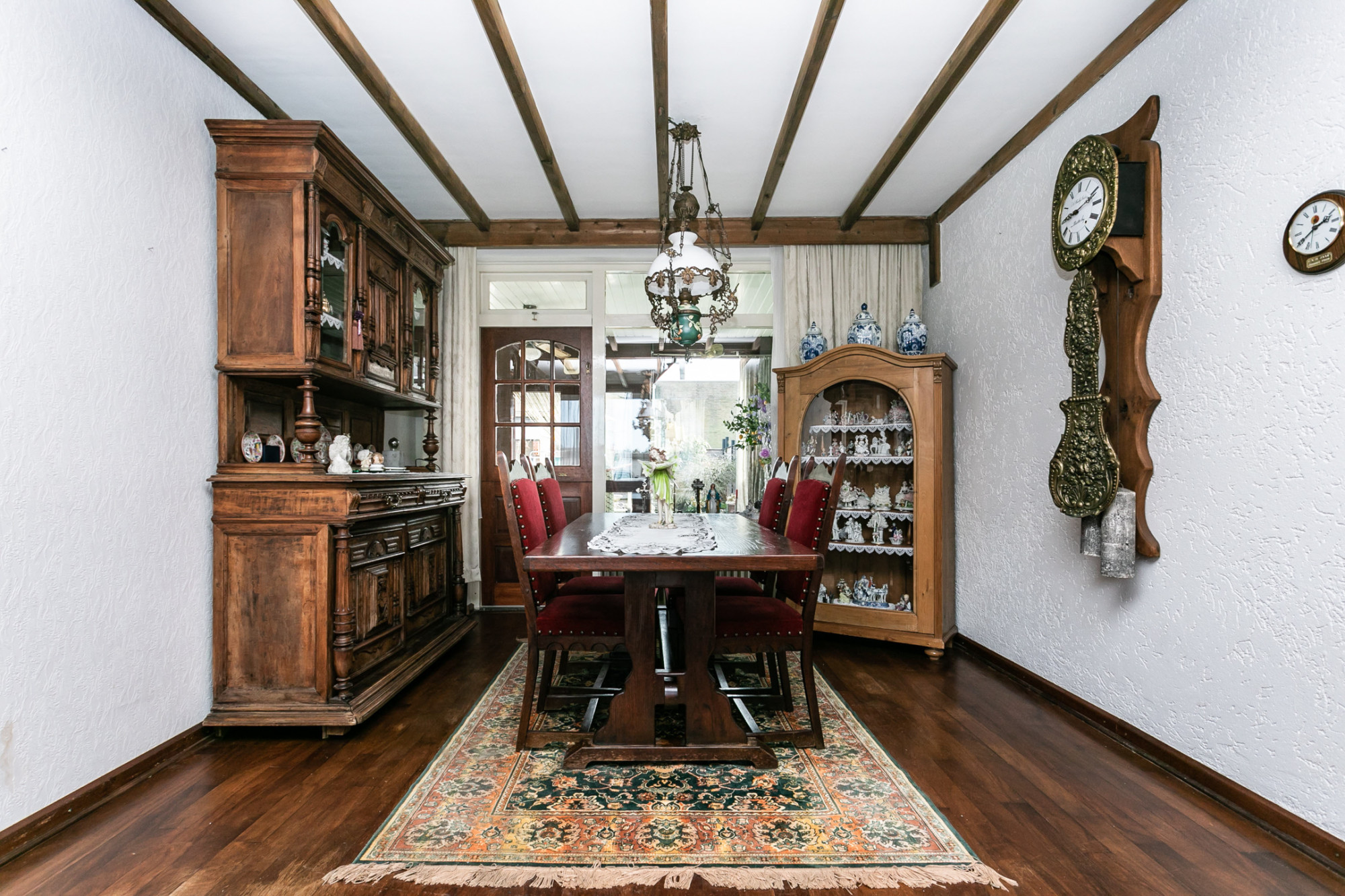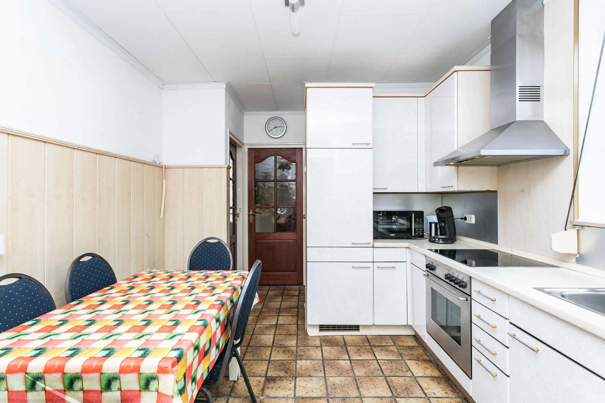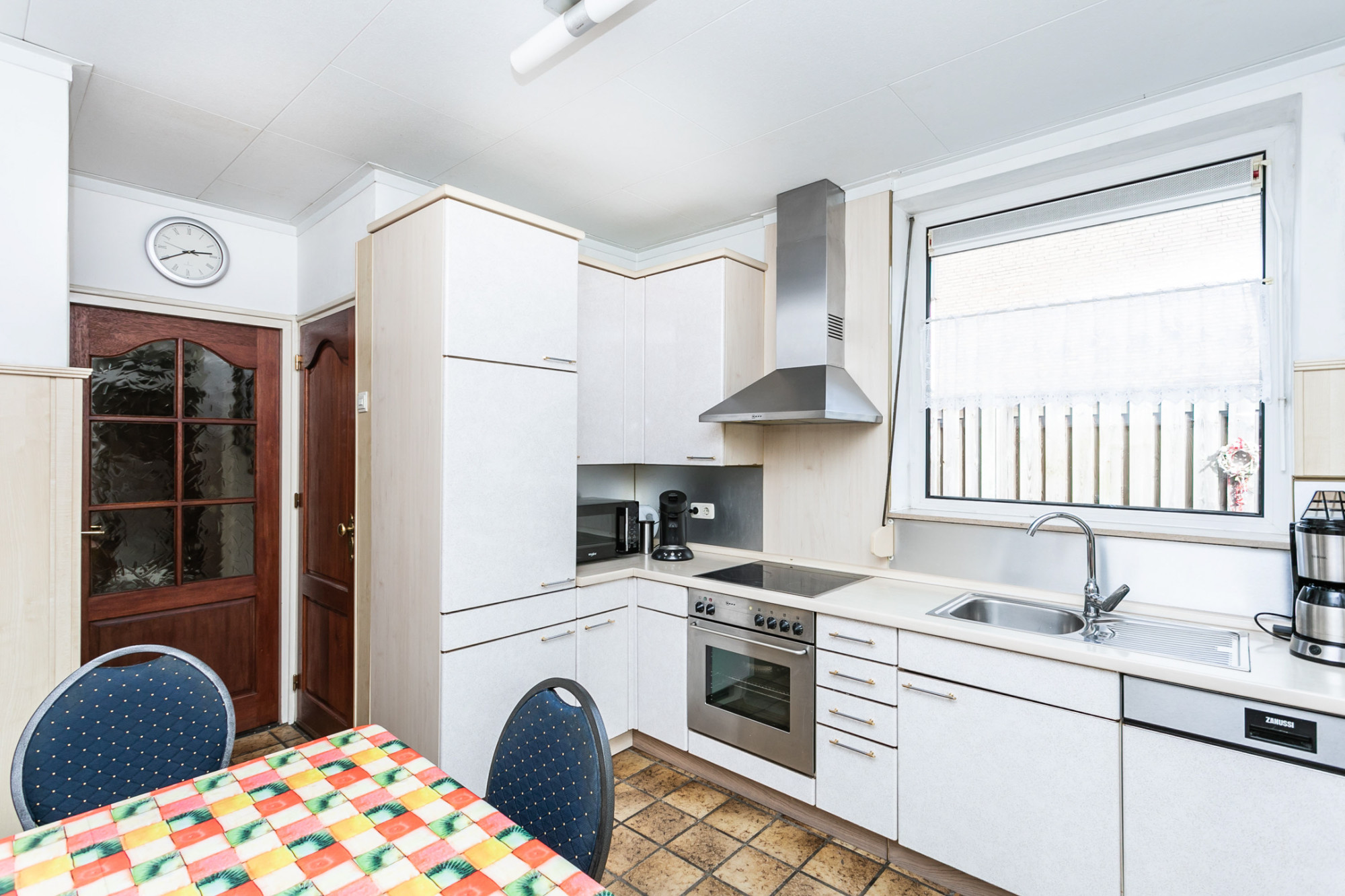 De gesloten keuken is uitgerust met een praktische hoekopstelling en inbouwapparatuur. Handige extra’s zoals een trapkast en een provisiekelder zorgen voor volop opbergruimte.
