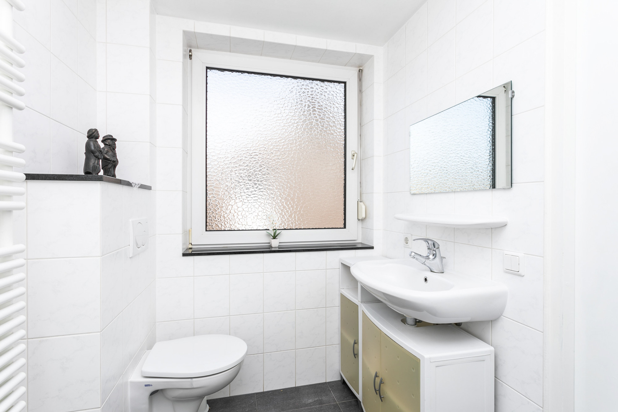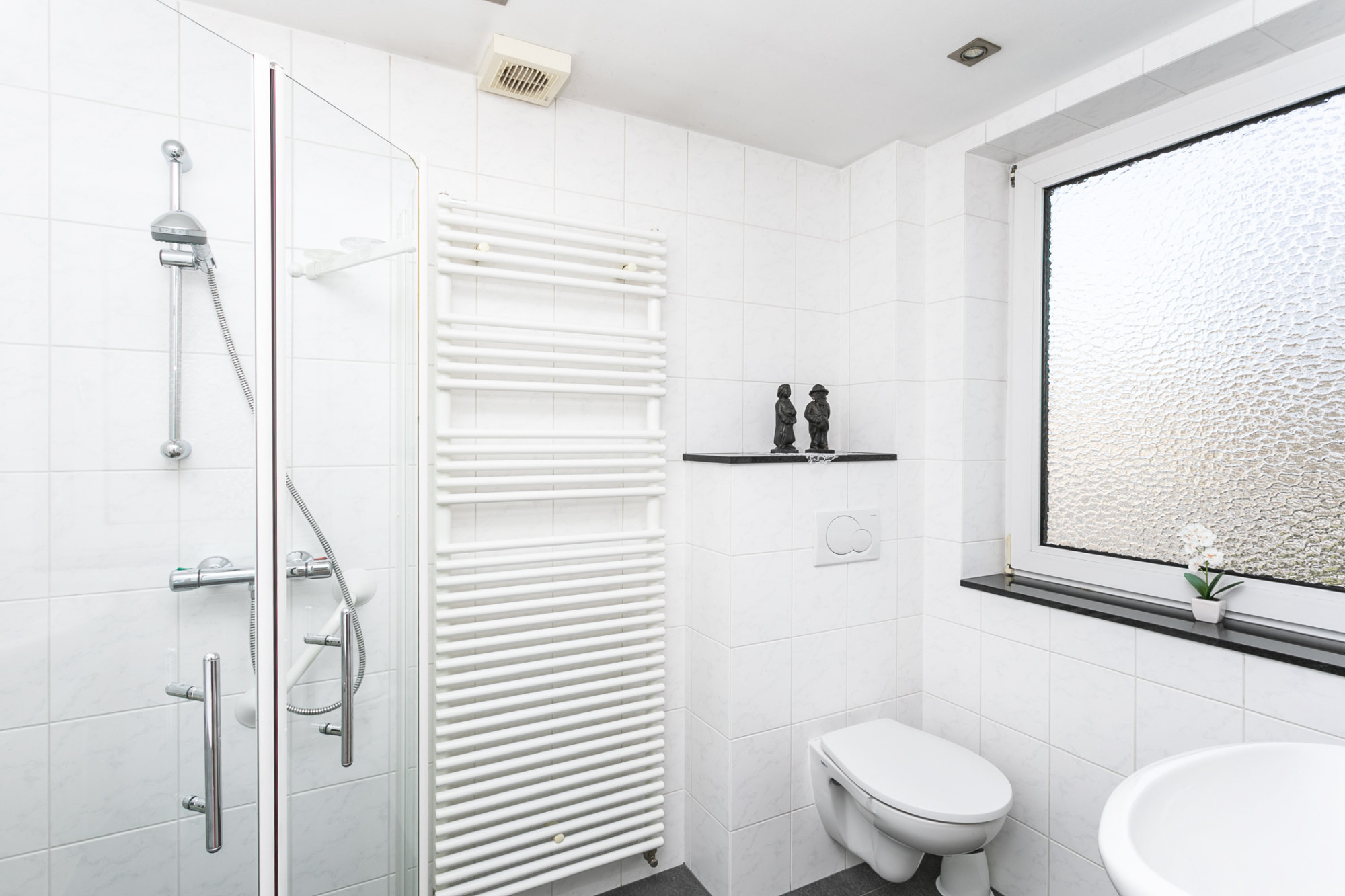 De geheel betegelde badkamer, linksvoor op de verdieping, is voorzien van een inloopdouche / vaste wastafel / een badkamermeubel / designradiator / witgoedaansluitingen voor wasmachine/droger en een tweede toilet.