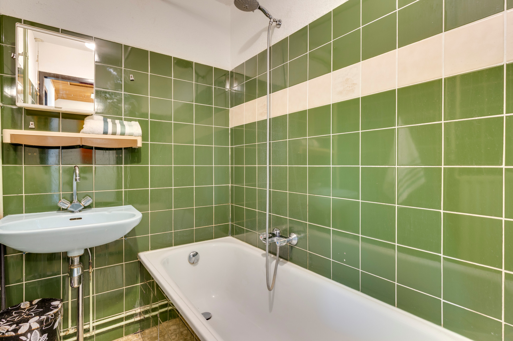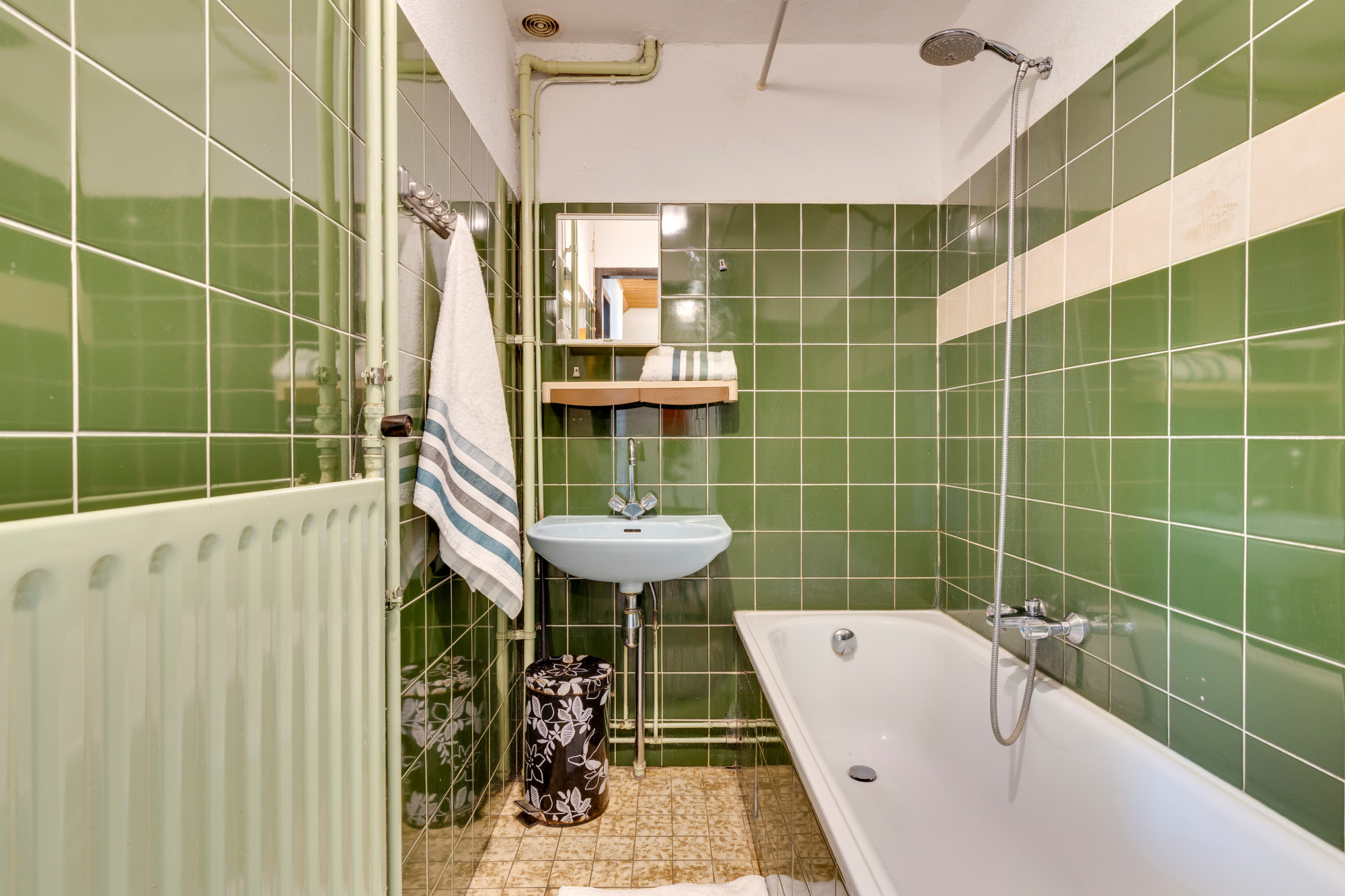 Betegelde eenvoudige badkamer v.v. vaste wastafel en ligbad.
