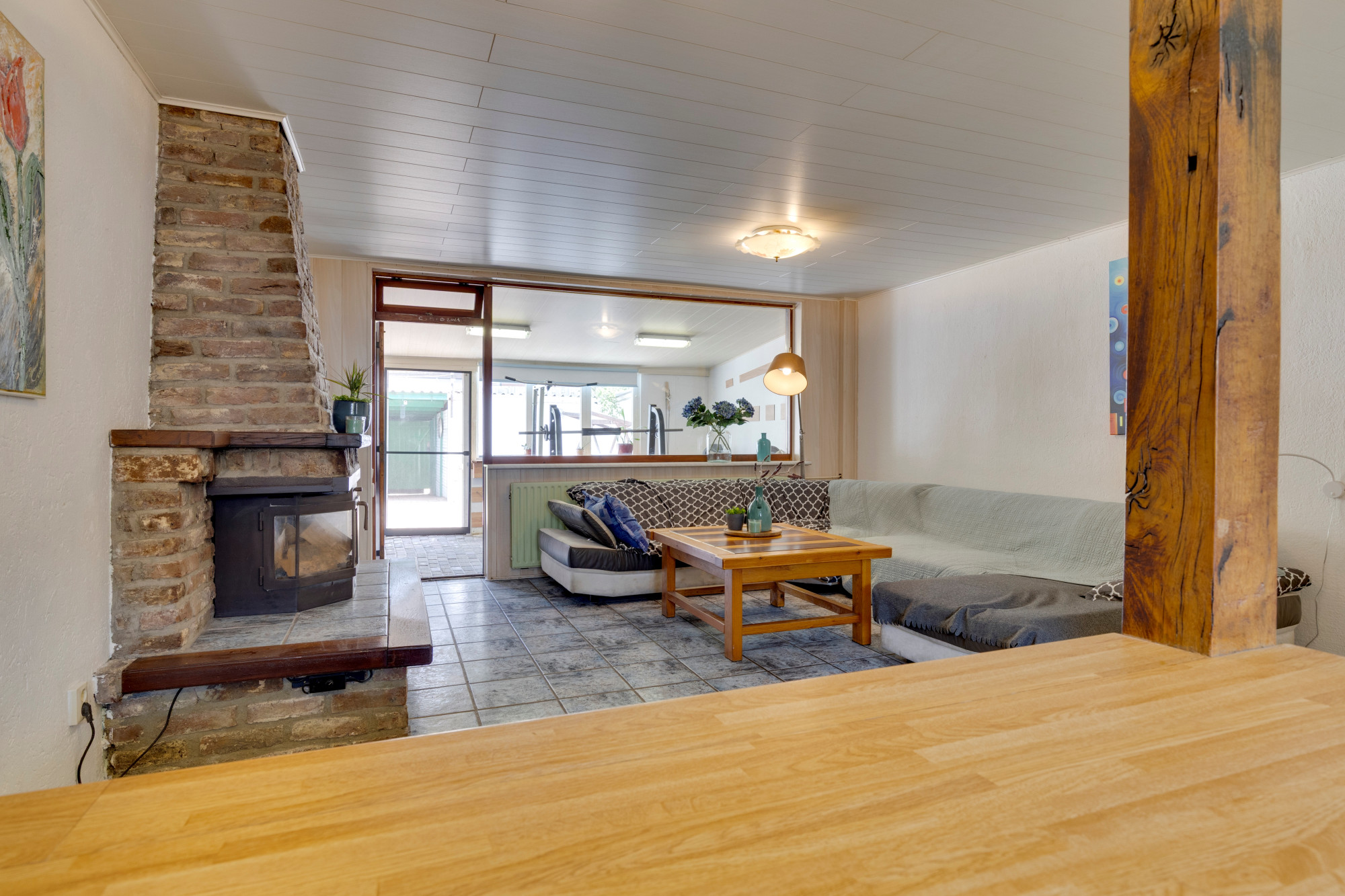 Via de hal bereikt u de ruime open keuken v.v. tegelvloer en aanbouwinstallatie incl. apparatuur, te weten, gaskookplaat, wasemkap, oven en losse koelkast. Royale woonkamer met plavuizenvloer en open haardpartij. Via de woonkamer heeft men toegang tot de serre (eenvoudig).