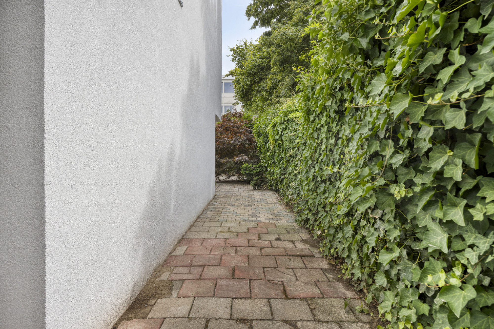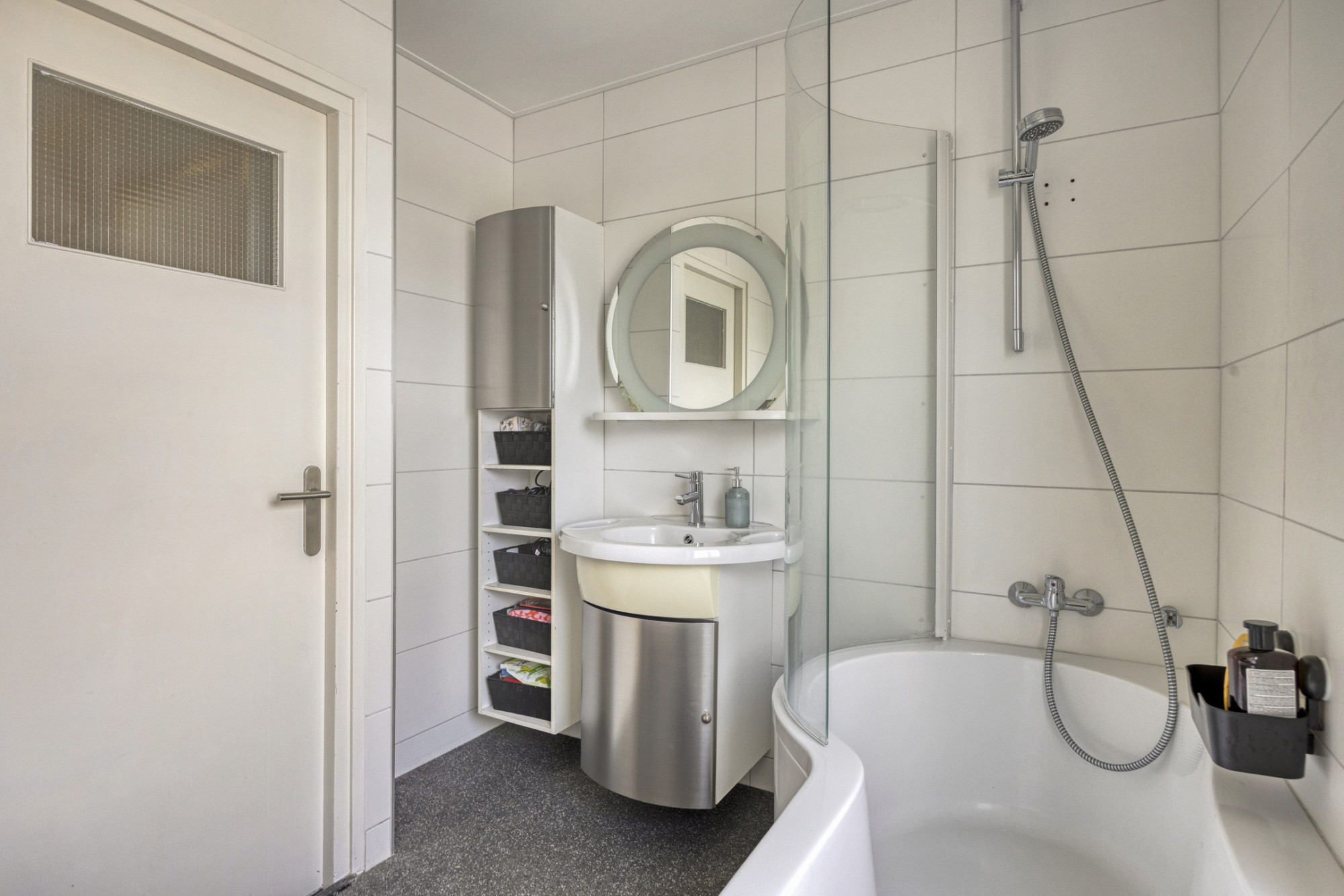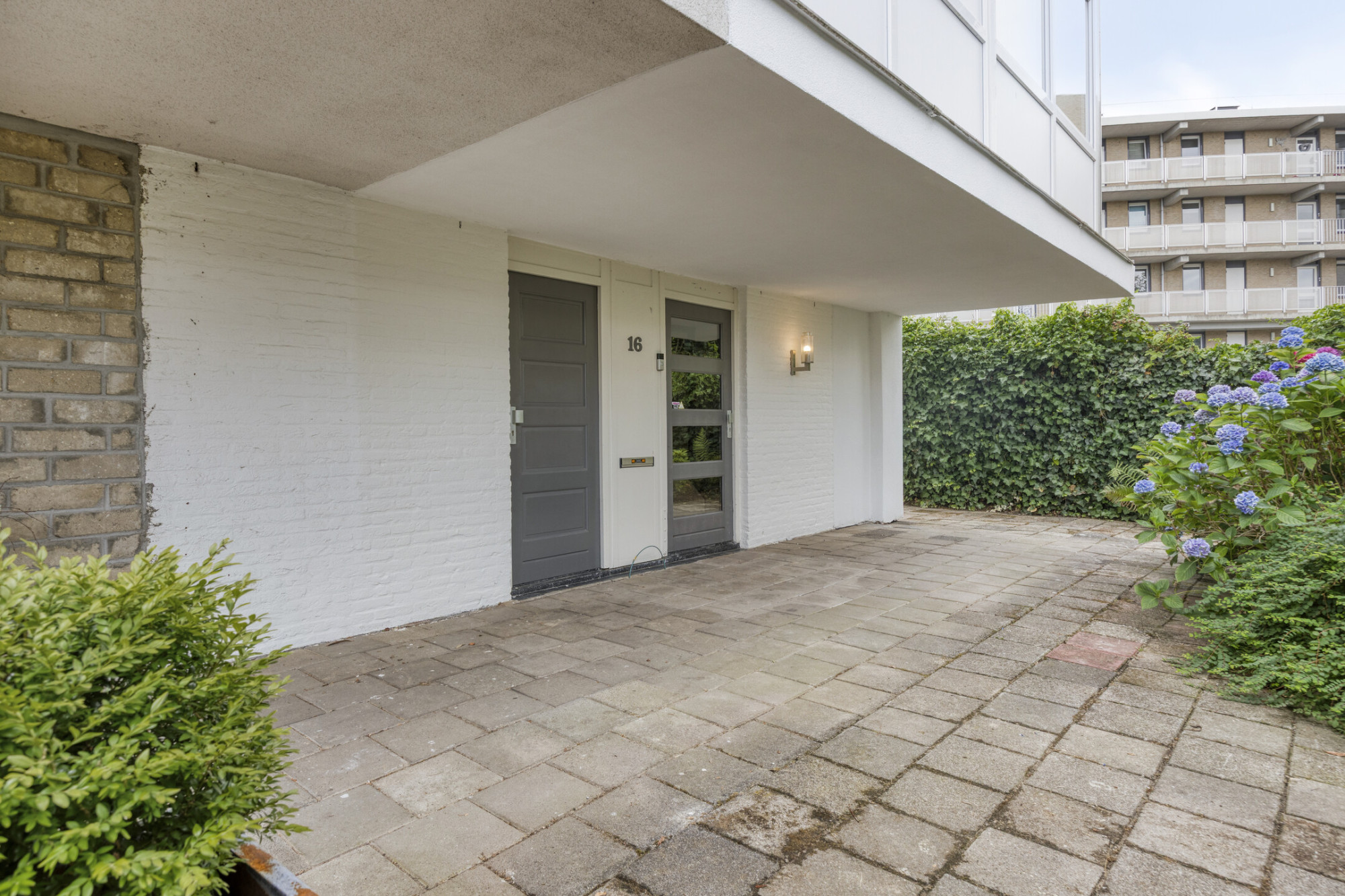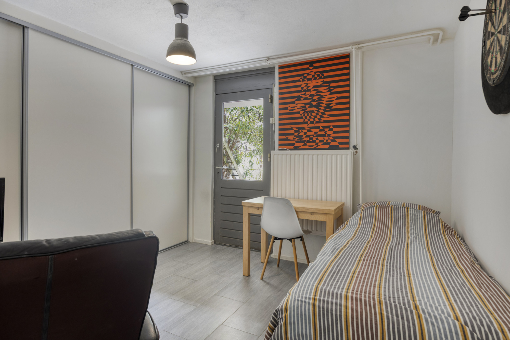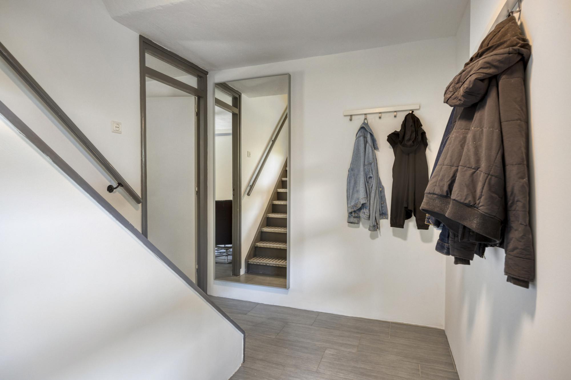 Overdekte entree. Hal met verdiepingstrap. Bergruimte met opstelplaats cv installatie (Nefit HR, 2018 eigendom) en wasapparatuur. Werk/logeerkamer met inbouwkastenwand en toegangsdeur naar de achtertuin. De achtertuin is nagenoeg geheel betegeld en beschikt over een terras en een zij-ingang naar de voorzijde van de woning.