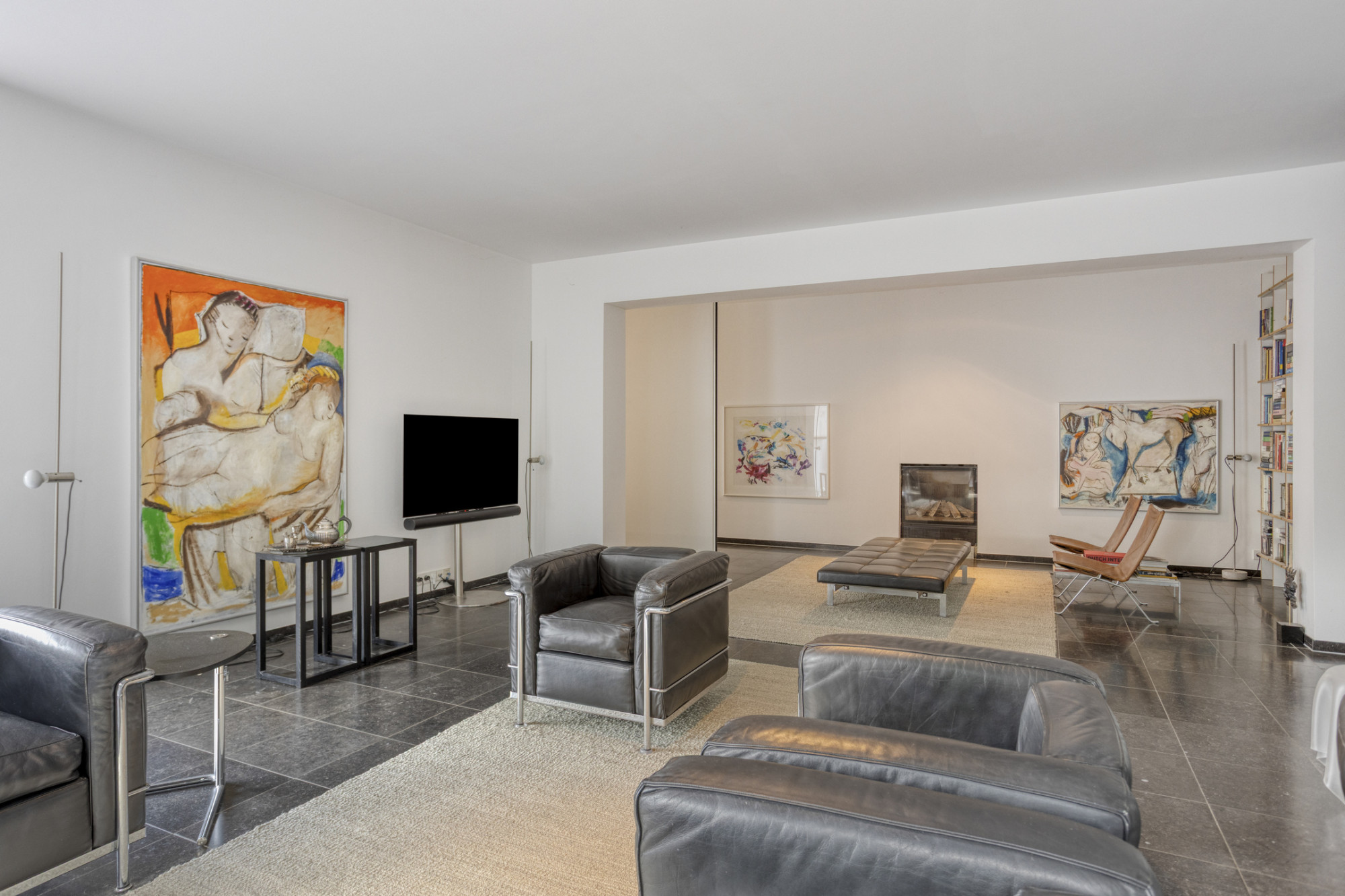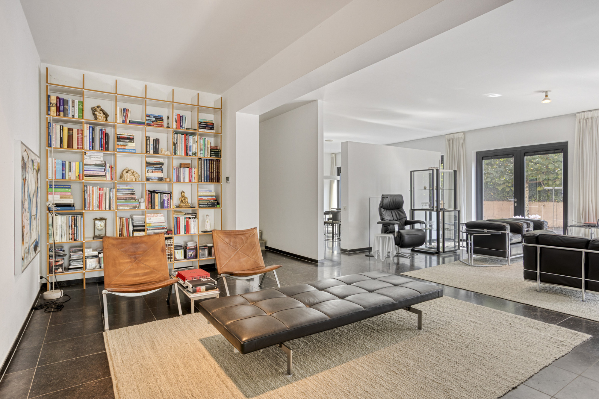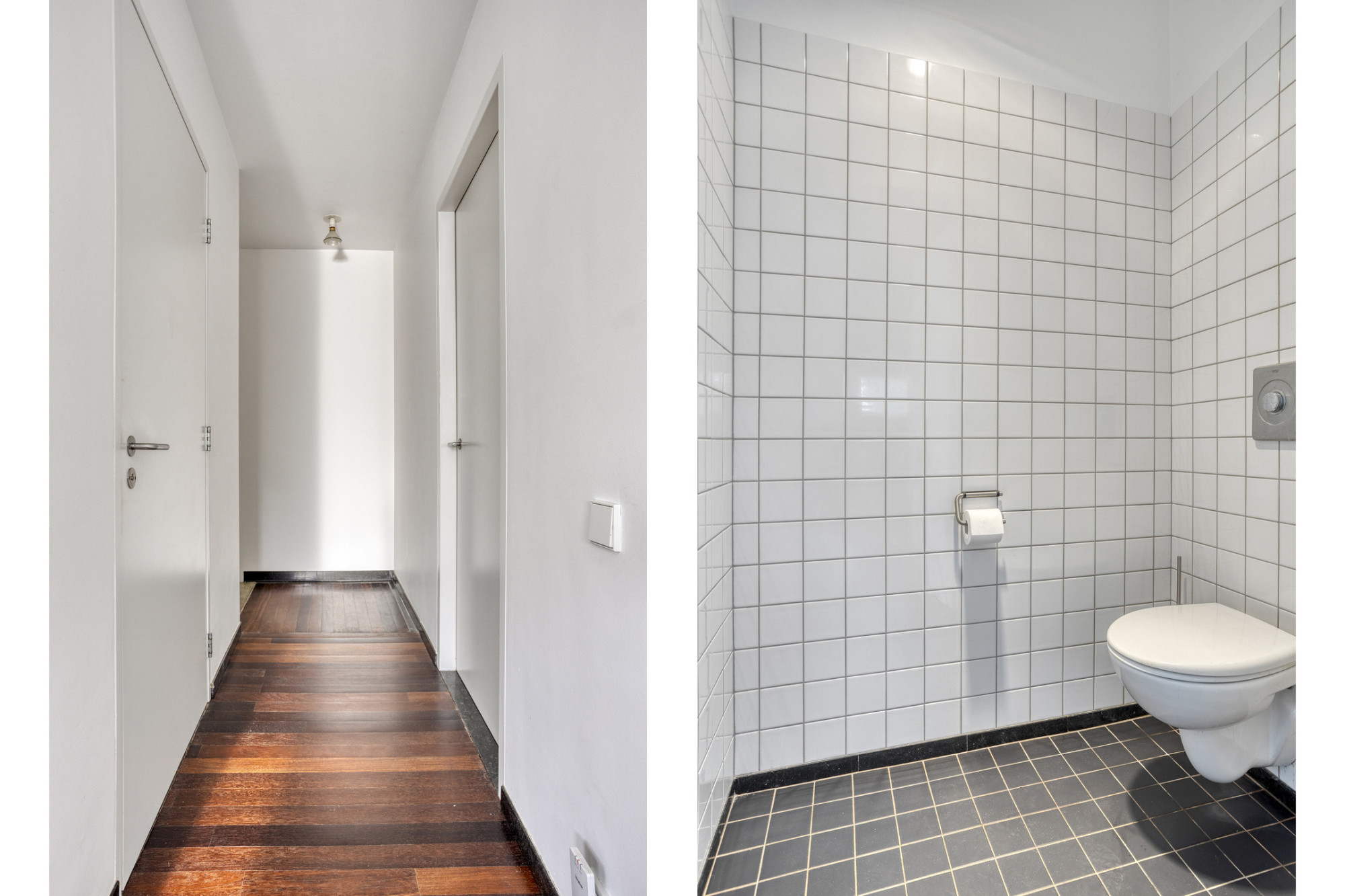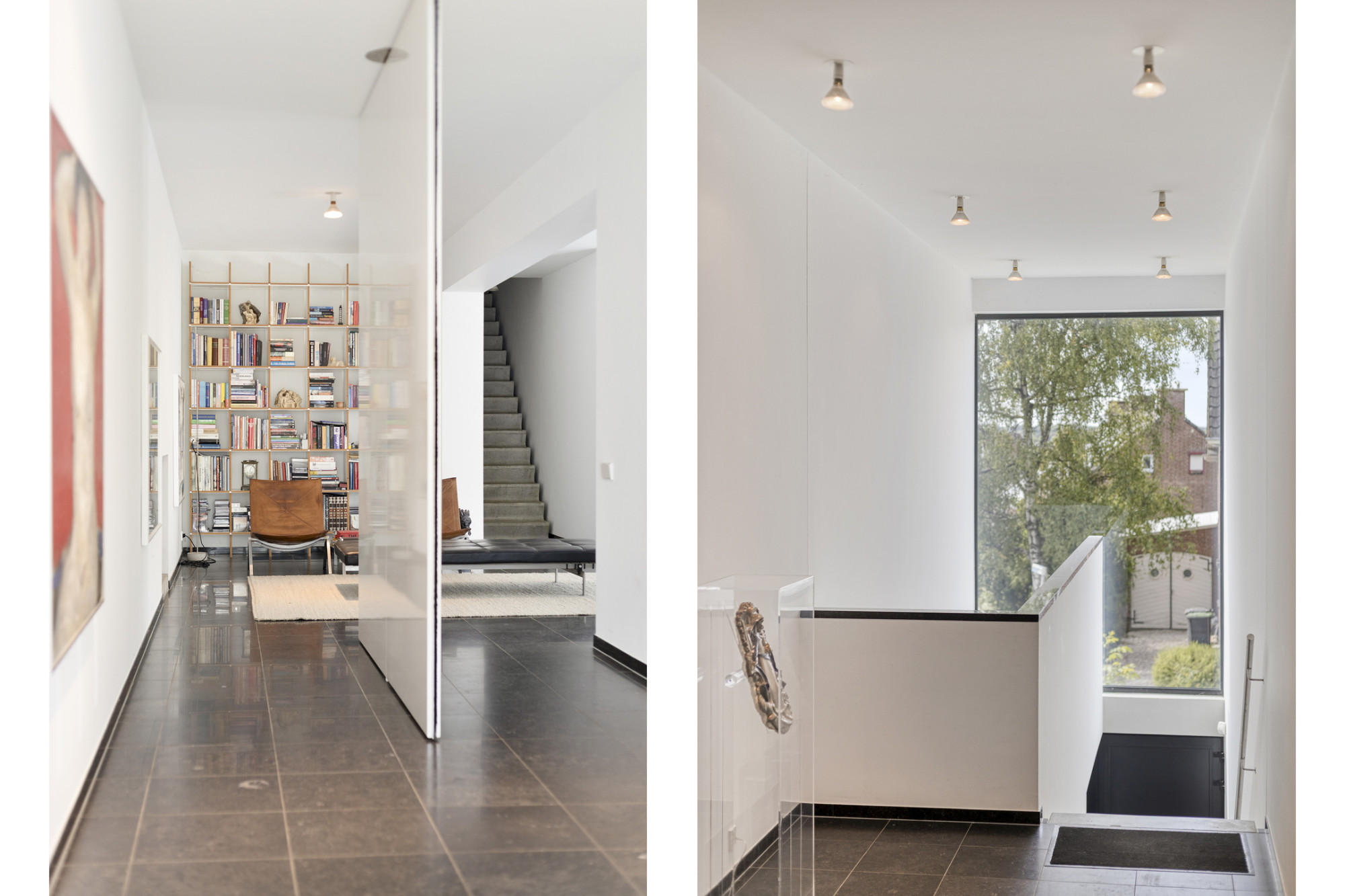 Middels de riante hal (5.34 x 2.31 m) met vide met 6.20 meter hoge plafond en betonnen trap toegang tot de hal van de leefruimte.
