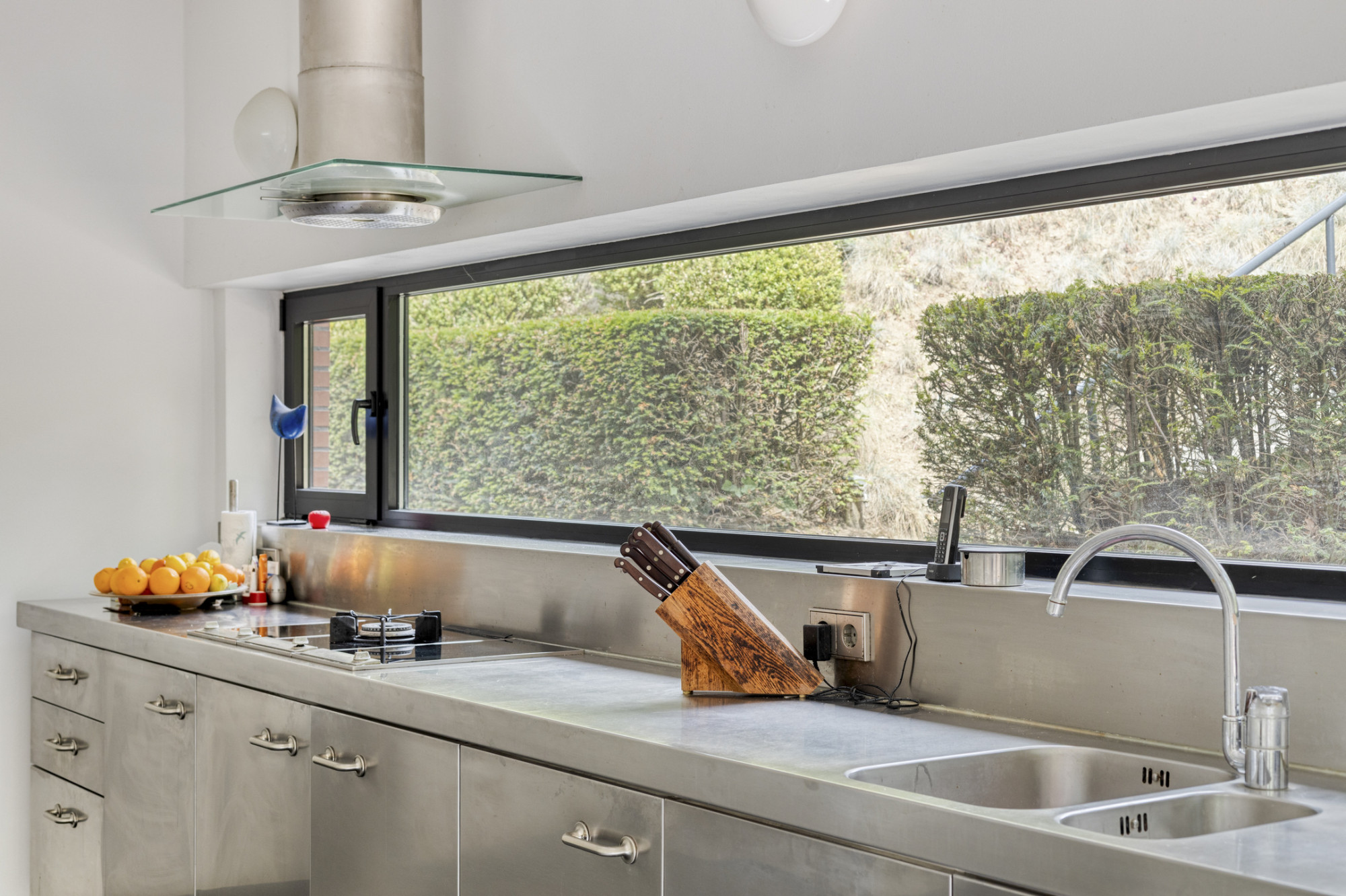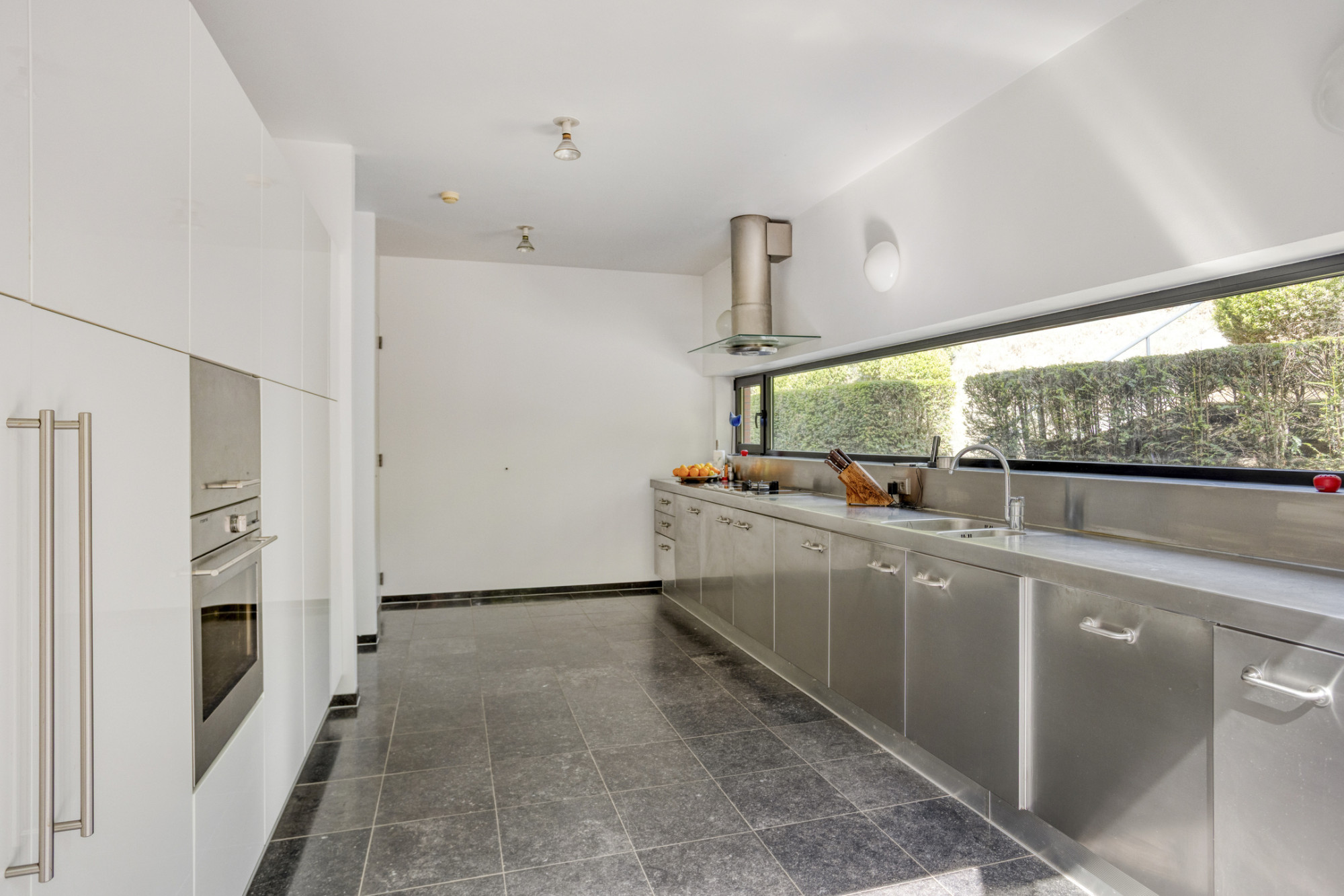 Keuken (5.87 x 3.21 m) met luxe Berloni RVS keukeninstallatie voorzien van ruime bergkasten, inbouwapparatuur te weten, 2 keramische kookplaten, teppanyaki plaat en gas wokbrander, afzuigkap en vaatwasser; separate witte kasten/apparatenwand met wederom voldoende bergruimte, inbouwapparatuur te weten: hoge druk stoomoven, hete-lucht-oven, koelkast en separate vrieskast. Vanuit de keuken toegang tot de bijkeuken met witgoed aansluiting.