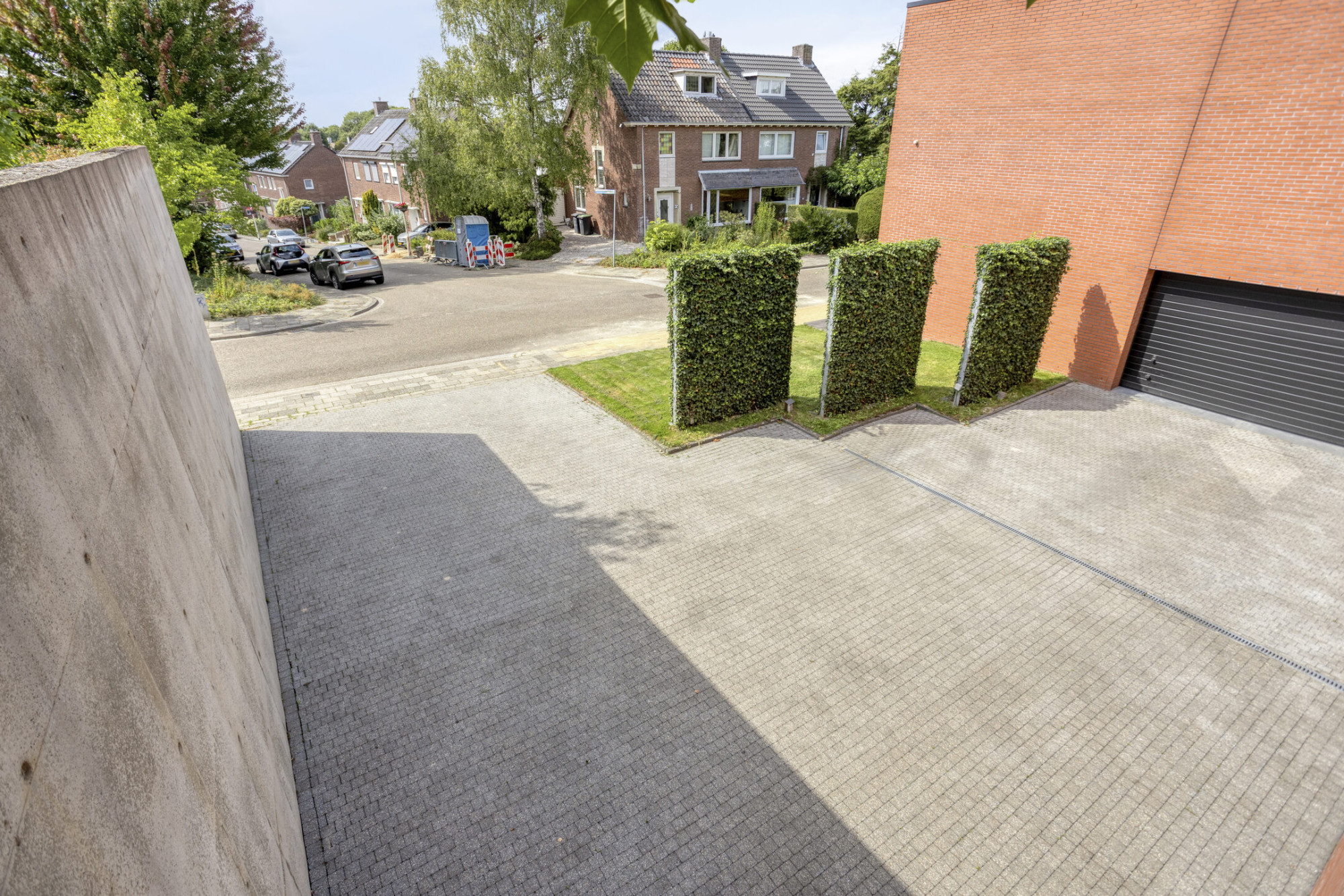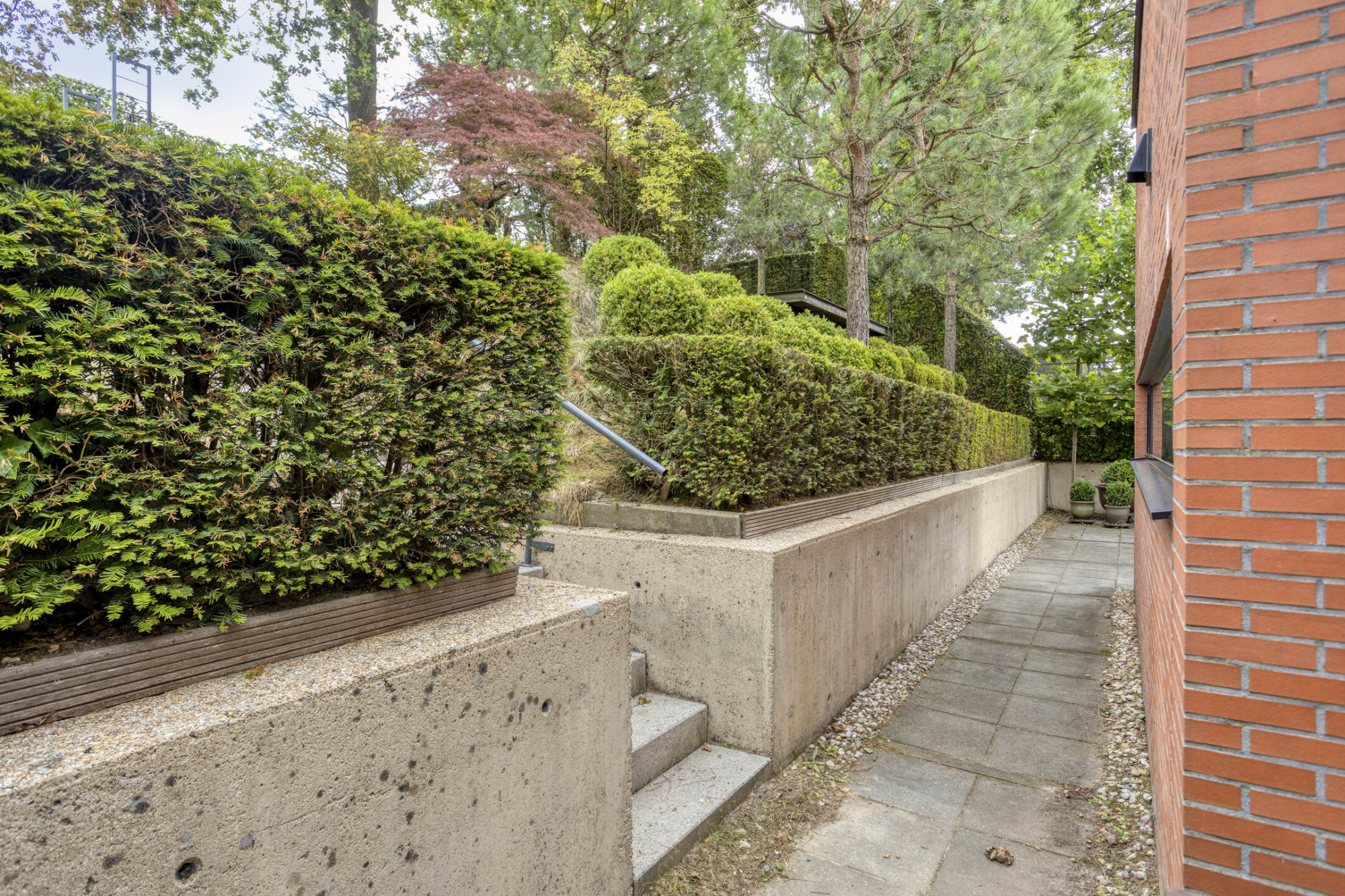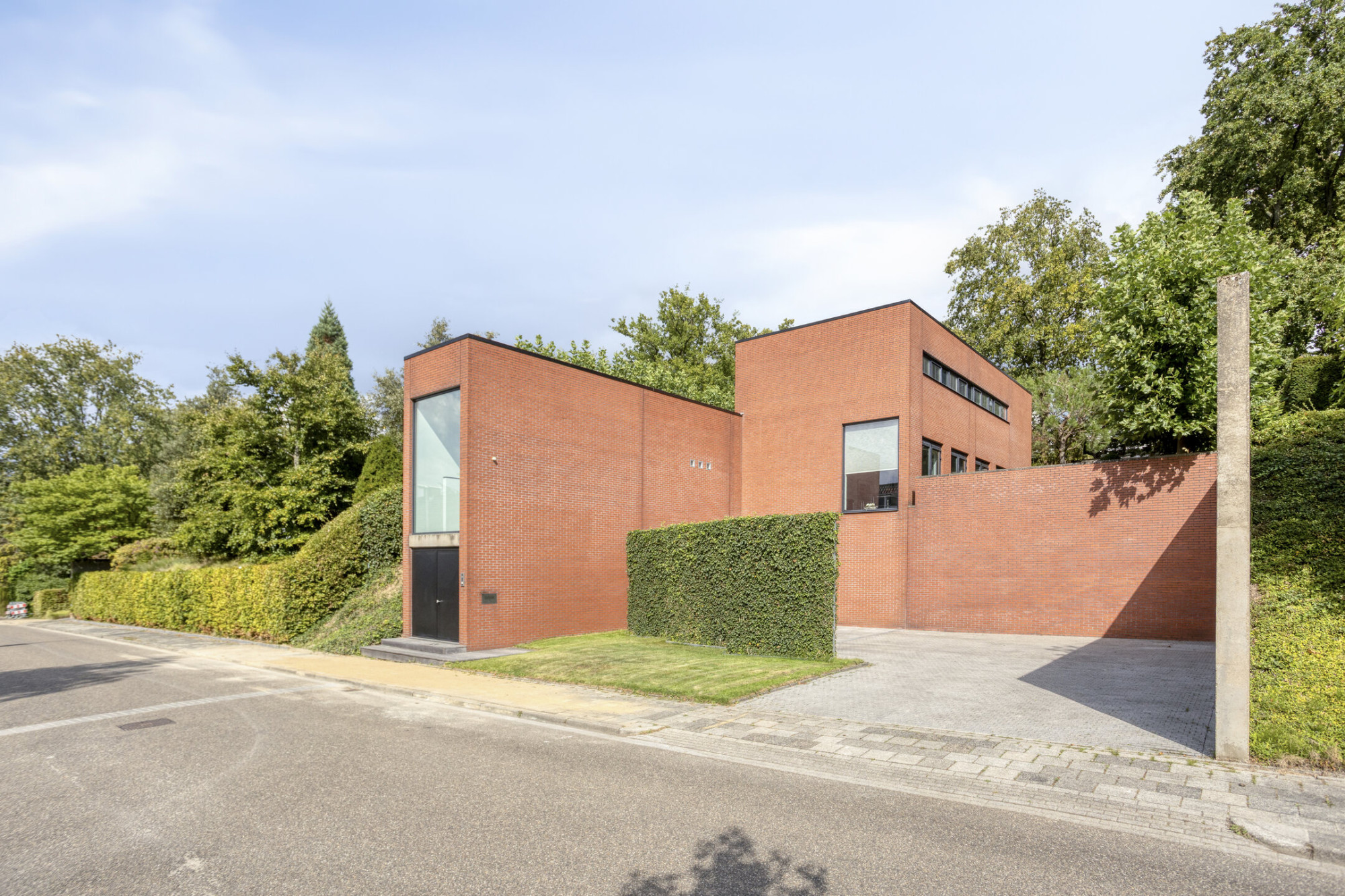 Het exterieur wordt gekenmerkt door robuuste rode baksteen van hoge kwaliteit, betonnen keerwanden, strakke lijnen en royale raampartijen die het geheel een tijdloze uitstraling geven. Achter de indrukwekkende gevel schuilt een woning waarin licht, ruimte en comfort centraal staan.