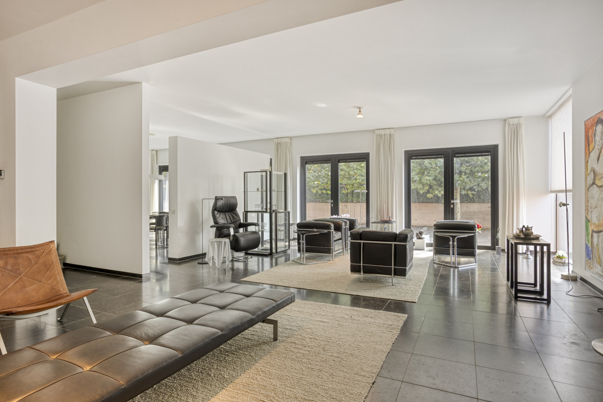 Hal (5.96 x 2.28 m) met doorlopende natuurstenen vloer (Belgische hardsteen) welke is voorzien van vloerverwarming. Middels imposante taatsdeur toegang tot de leefruimte van in totaal 72 m², verdeeld in een woonkamer (8.34 x 5.98 m) en eetkamer (4.76 x 4.67 m) beide gescheiden door 3/4 hoge muur. De woonkamer is eveneens voorzien van een natuurstenen vloer met vloerverwarming en een gashaard, middels een tweemaal dubbele tuindeuren toegang naar het terras; eetkamer eveneens voorzien van tweemaal dubbele tuindeuren met toegang tot het terras.