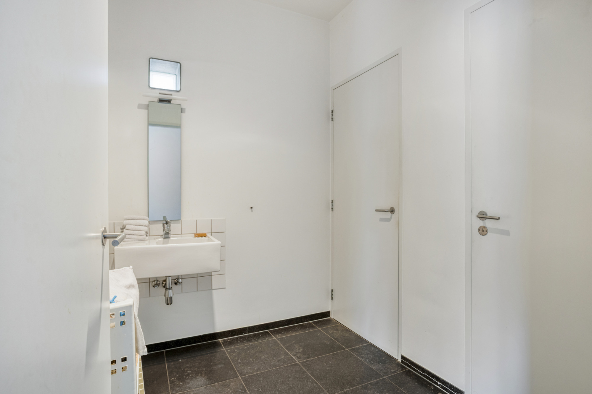 Vanuit de woonkamer toegang tot de sanitaire ruimte met algemene ruimte met vaste wastafel, toiletruimte met wandcloset en techniekruimte alwaar CV installatie.