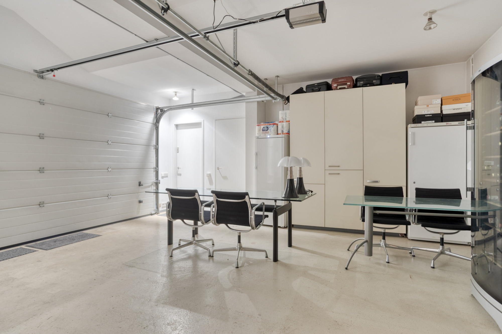 Middels ruime oprit (geschikt voor meerdere voertuigen) en hal (5.34 x 2.31 m) te bereiken inpandige verwarmde dubbele garage (5.89 x 5.82 m) met stortbak voorzien van warm- en koud water, filterinstallatie van de jacuzzi en ruime separate berging (4.16 x 2.31 m).