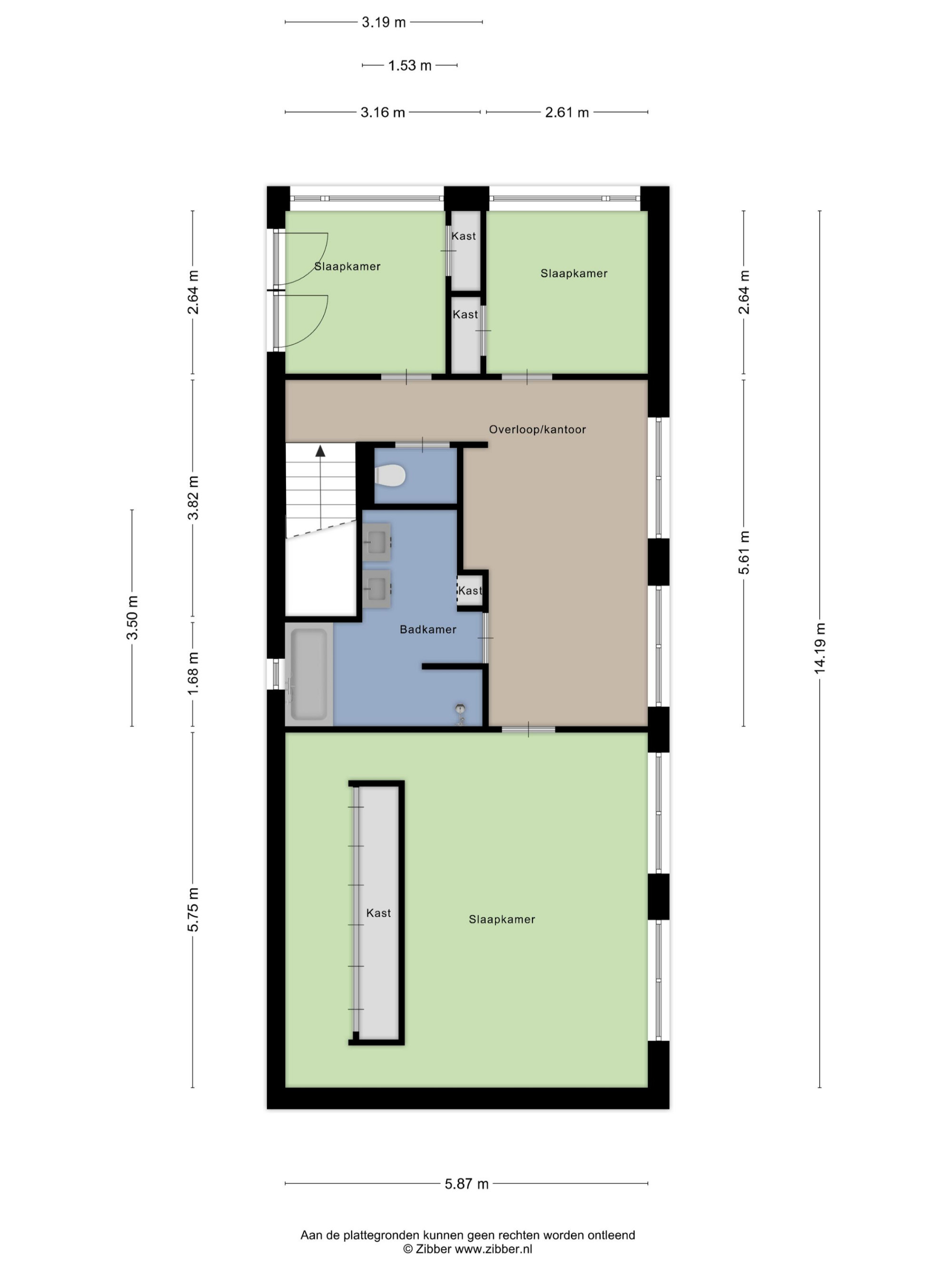 Slaapkamer 3 (2.64 x 2.61 m) met vaste kastenwand.