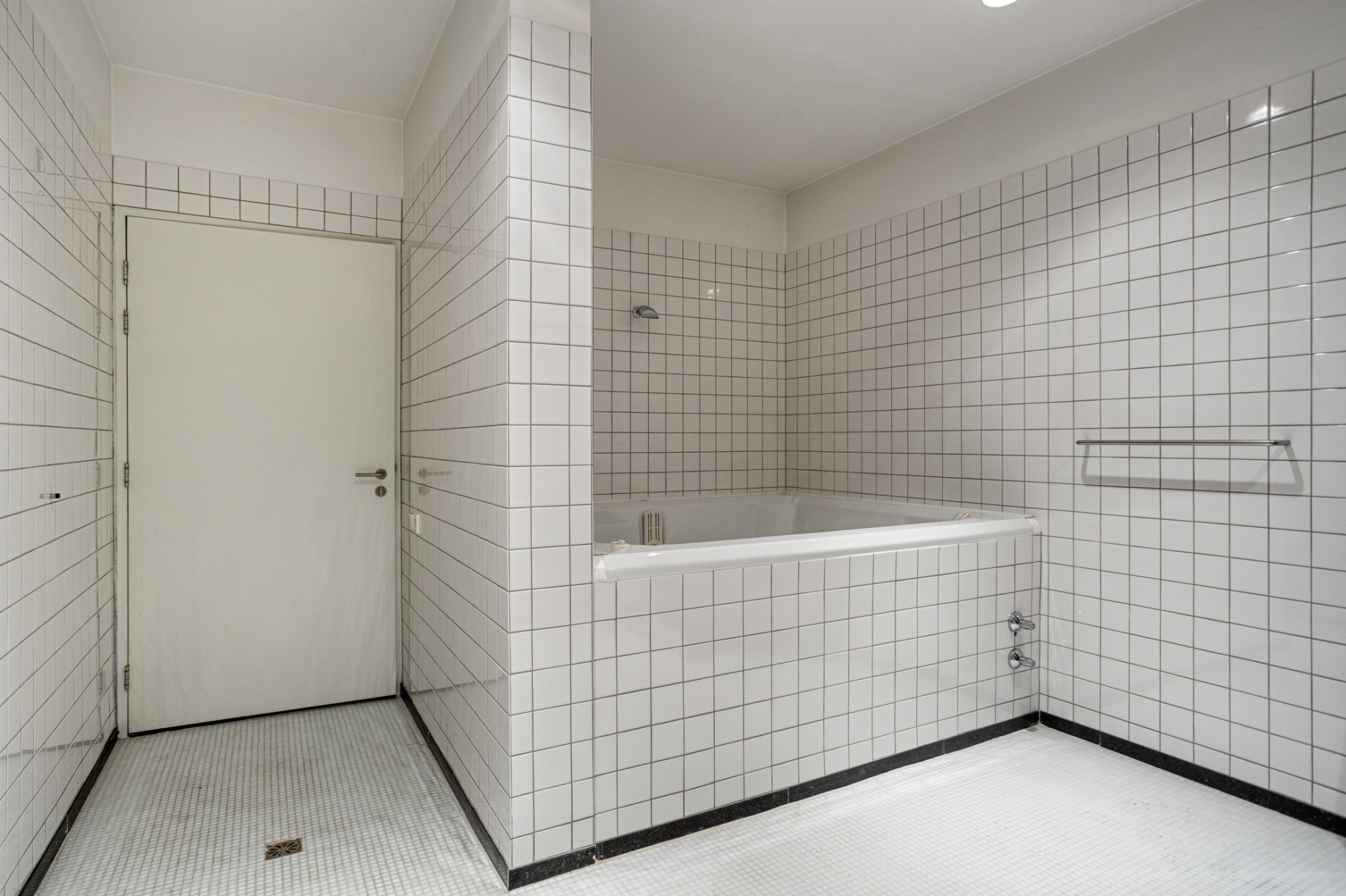 Badkamer met whirlpool, douche en dubbele wastafel.