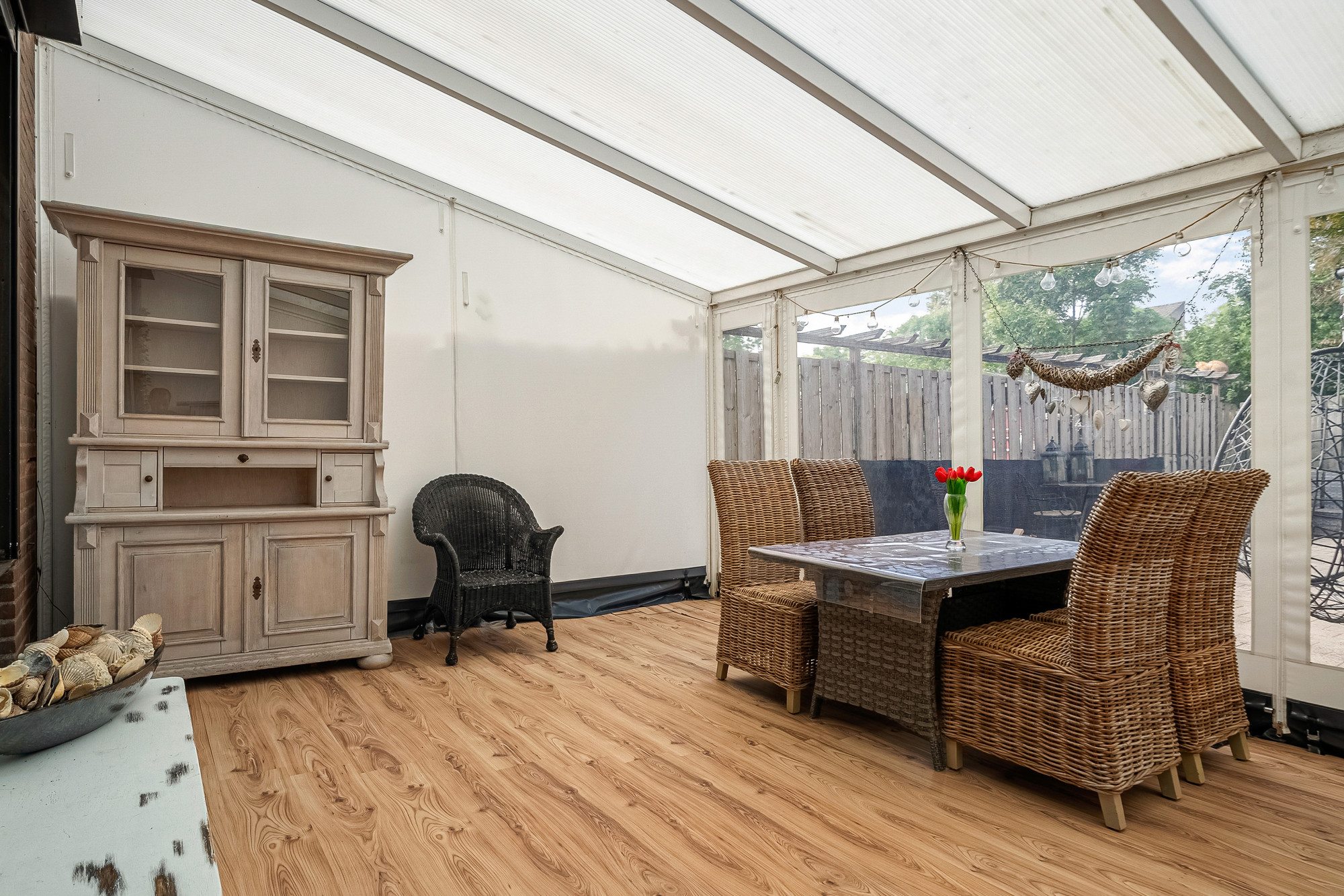 De onderhoudsvriendelijke tuin is gelegen op het zuidwesten en biedt veel privacy. Dankzij de vaste overkapping is het een ideale plek om te ontspannen of gezellig buiten te eten, ongeacht het weer.