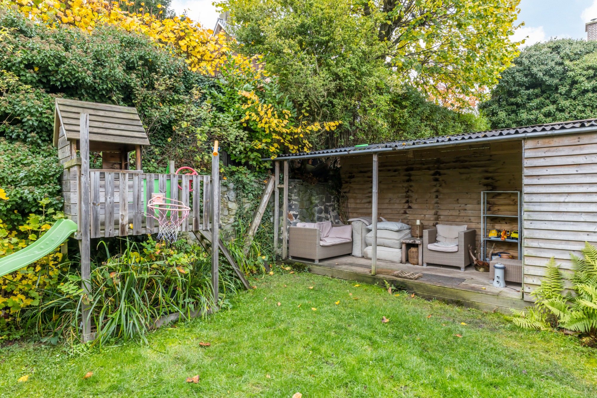 De geheel omsloten en sfeervol ingedeelde tuin is v.v. een terras en overdekt terras met toegang tot separate berging (2,35 m x 2,04 m). Middels een overdekt pad aan de zijkant heeft men toegang tot de berging (3,32 m x 1,90 m) aan de voorzijde gelegen, vanuit deze berging heeft men middels een dubbele poort toegang tot de oprit.