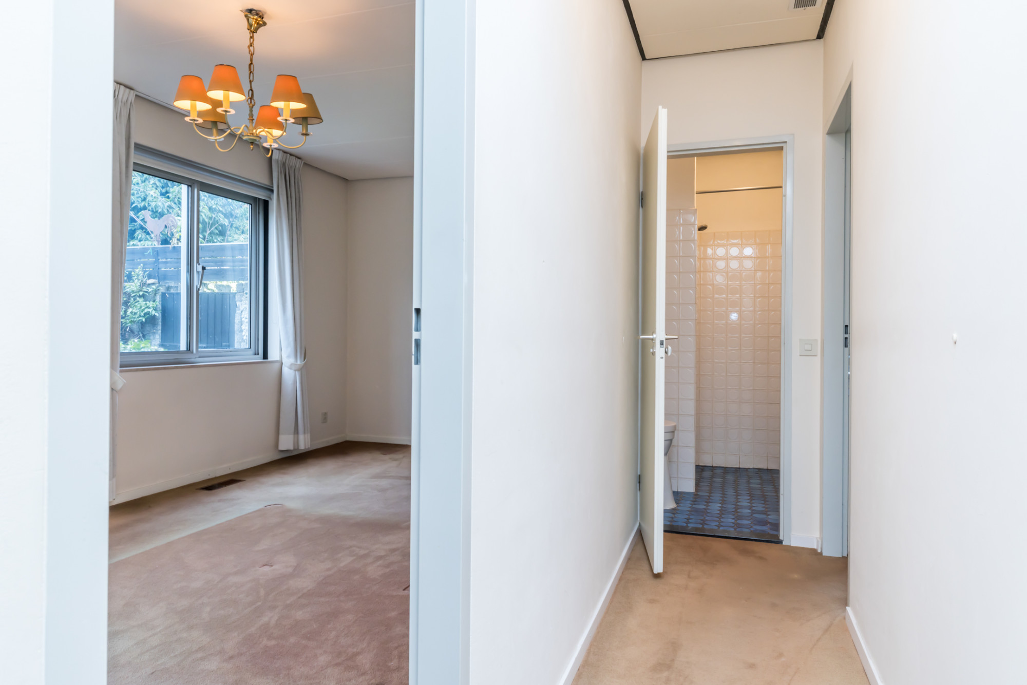 Vanuit de tussenhal heeft men toegang tot 2 slaapkamers, badkamer en berging. Slaapkamer II (6,00 m x 2,93 m) aan tuinzijde gelegen is v.v. een vaste wastafel. De geheel betegelde tweede badkamer (1,90 m x 0,88 m) is uitgerust met een tweede toilet en een inloopdouche. Slaapkamer III (3,02 m x 3,00 m) aan de voorzijde gelegen, is v.v. een dubbele vaste wastafel. De ruime berging (3,02 m x 2,89 m) is v.v. een separate entree en biedt toegang tot kelderruimte.