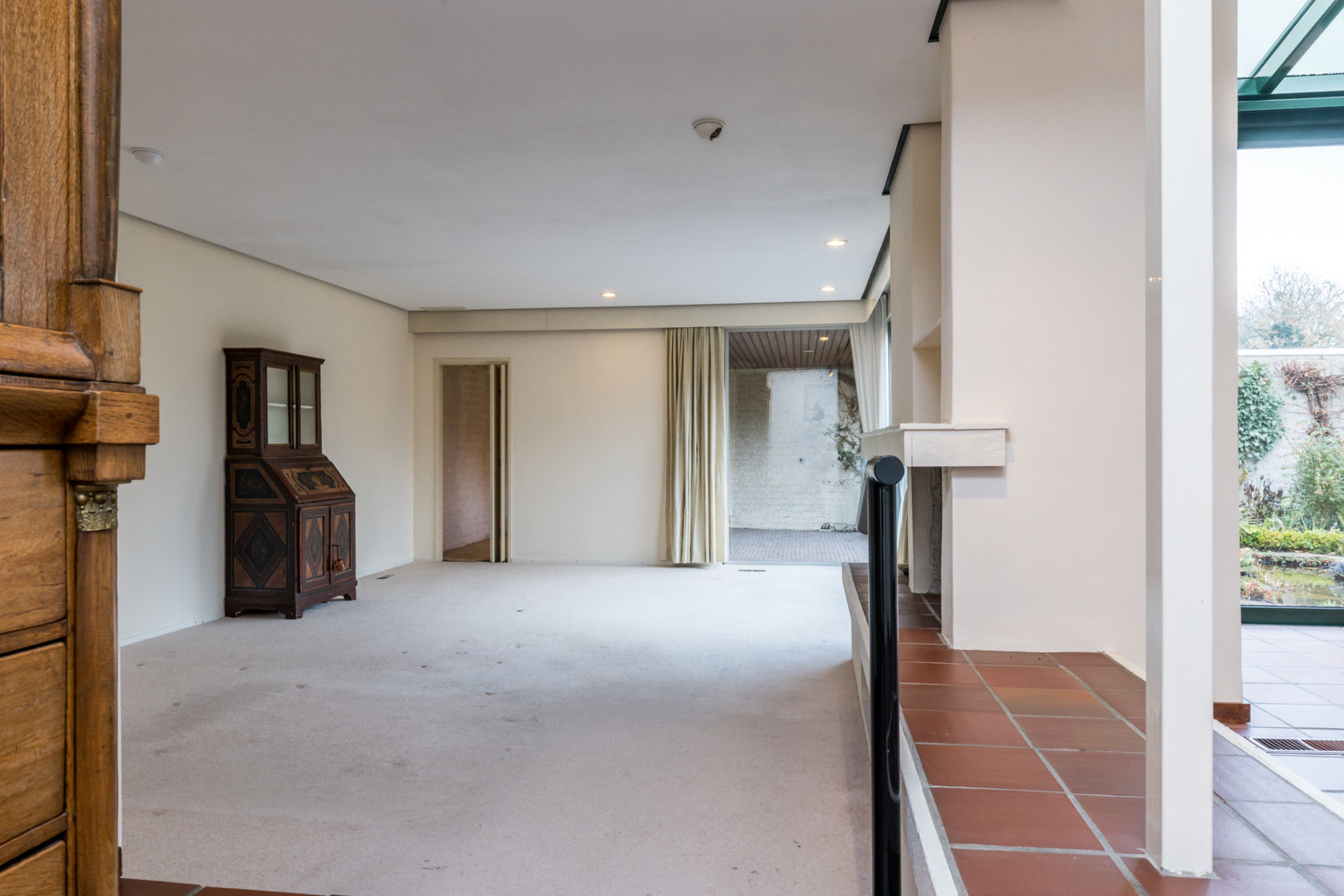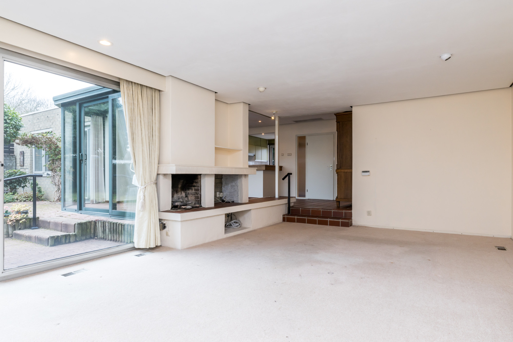 De entree/hal, v.v. separate toiletruimte, meterkast en garderobenis, biedt toegang tot slaapkamer I en living. De ruime living (ca. 53 m2) is verdeeld in woon en eetkamer en kenmerkt zich door de vele daglichttoetreding en het directe tuincontact. Vanuit het eetgedeelte heeft men d.m.v. twee traptredes toegang tot woonkamer, deze is v.v. een haard, schuifpui naar tuin en toegang tot study/ kantoor (3,25 m x 2,52 m).
