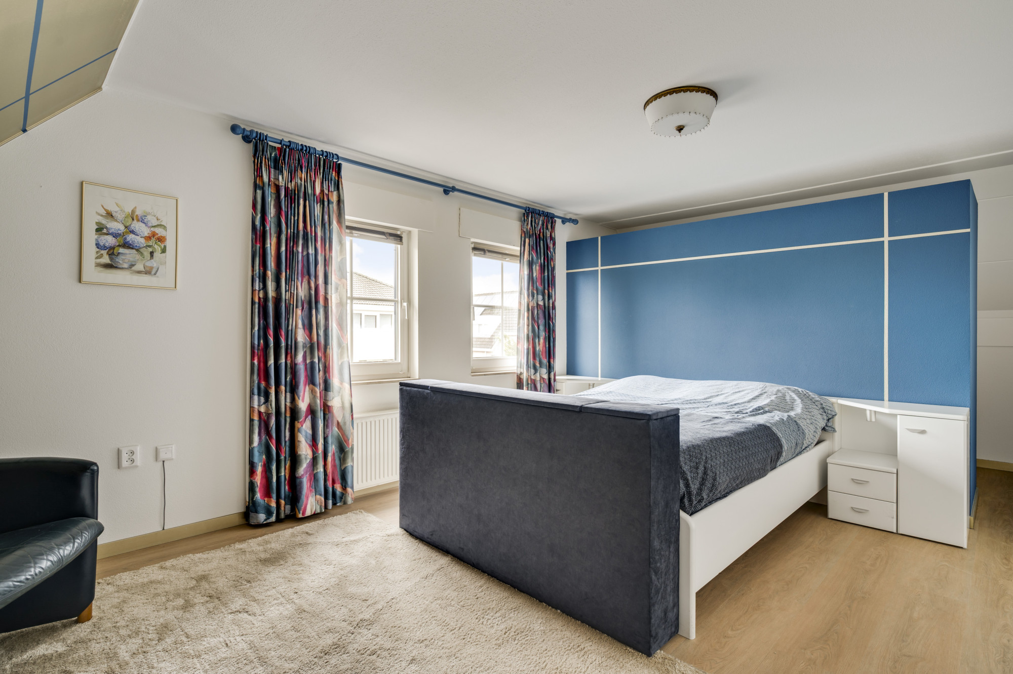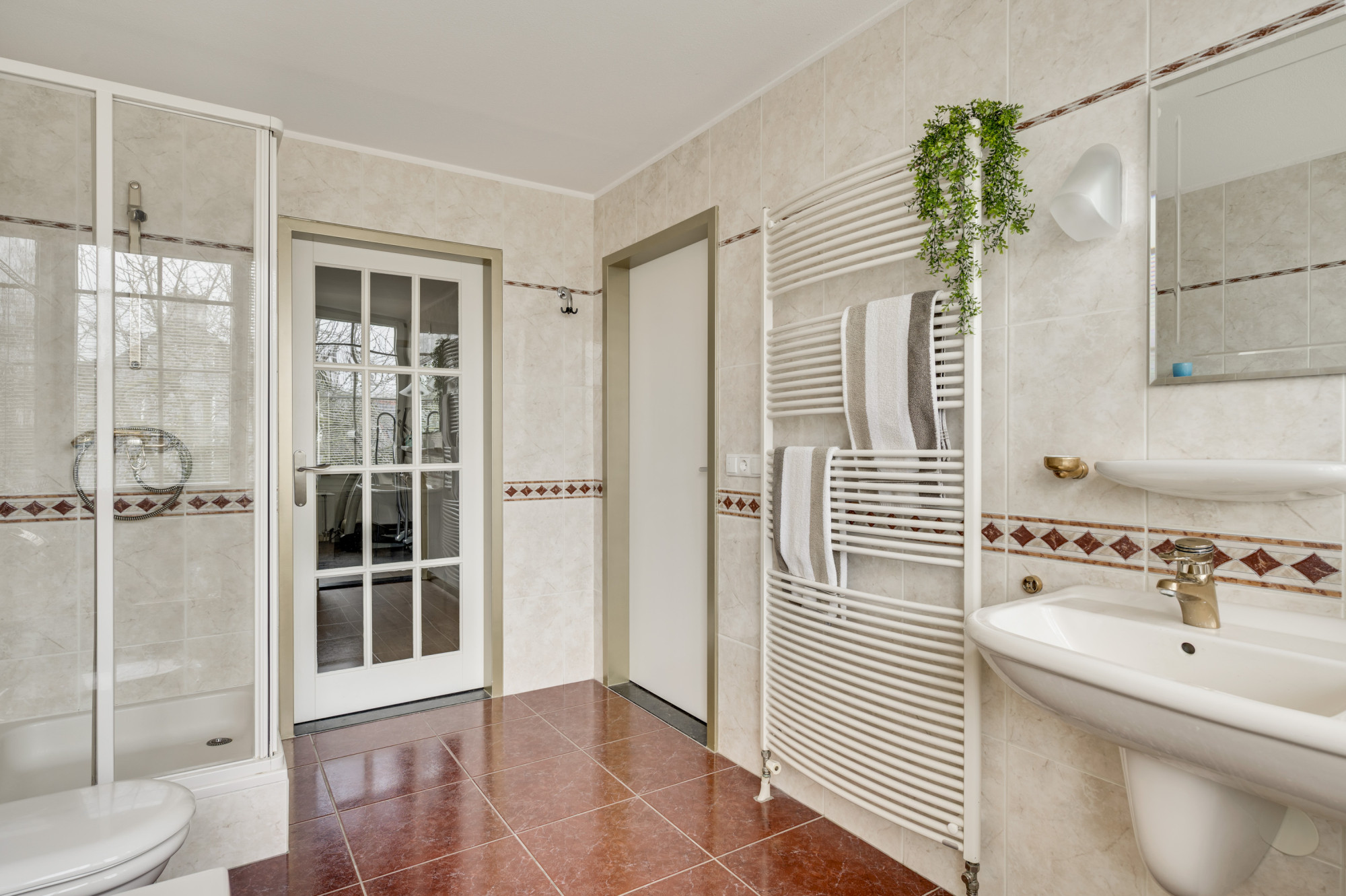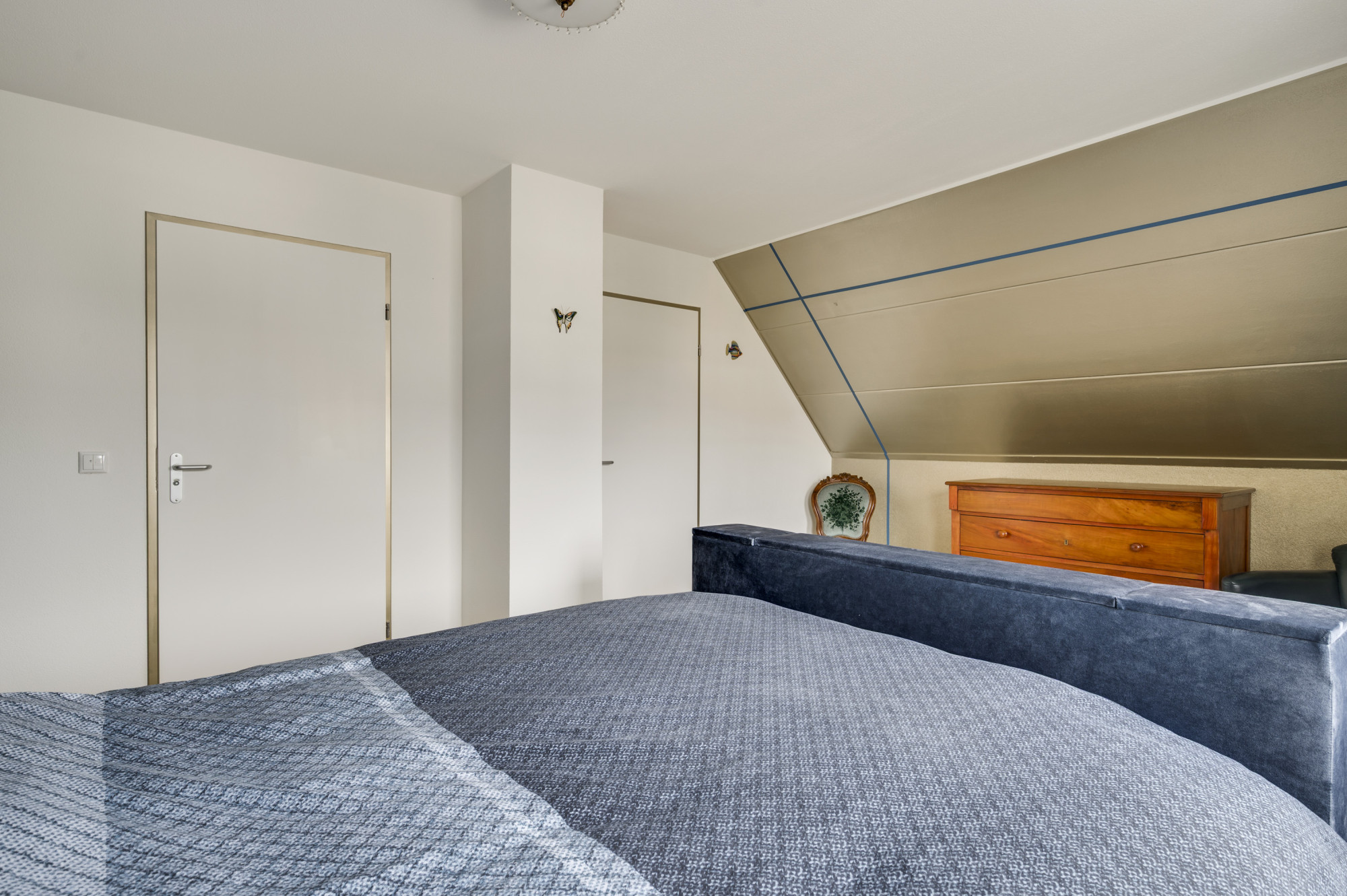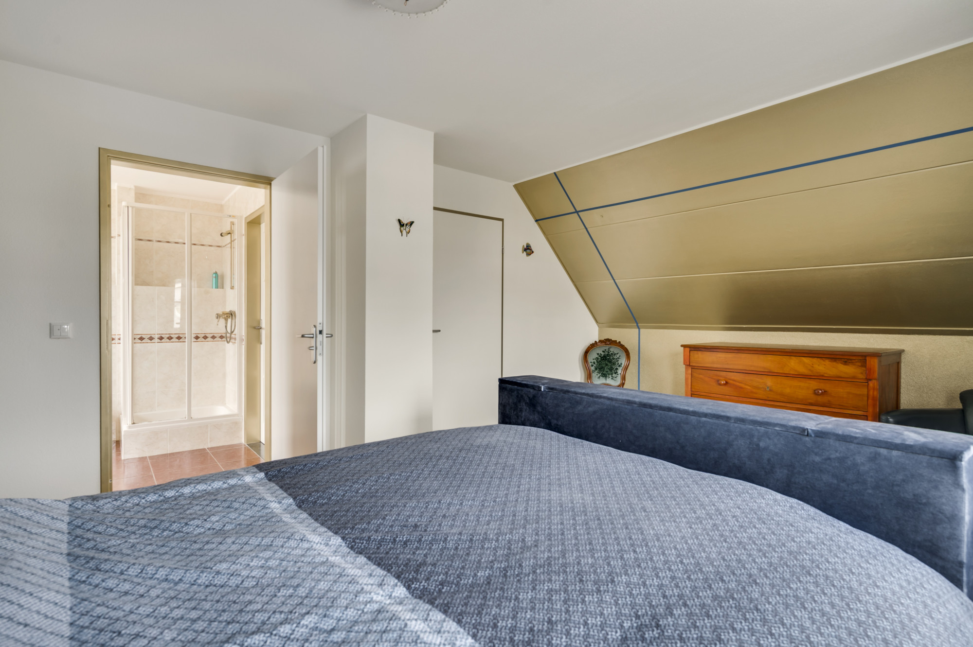 Op de eerste verdieping bevinden zich vier royale slaapkamers (dus 5 in totaal), waaronder een royale ouderslaapkamer met eigen inloopkast. Eén van de slaapkamers is momenteel in gebruik als kleedkamer met schuifkastenwand, doch is ook als volwaardige slaapkamer te gebruiken. De complete badkamer met veel daglichttoetreding door het grote dakkapel is van alle gemakken voorzien met een ligbad, douchecabine, dubbele wastafel en zwevend toilet. Erg praktisch is dat de badkamer niet alleen vanuit de overloop te bereiken is, maar ook via de ouderslaapkamer. De 1e verdieping is grotendeels voorzien van een mooie pvc vloer.