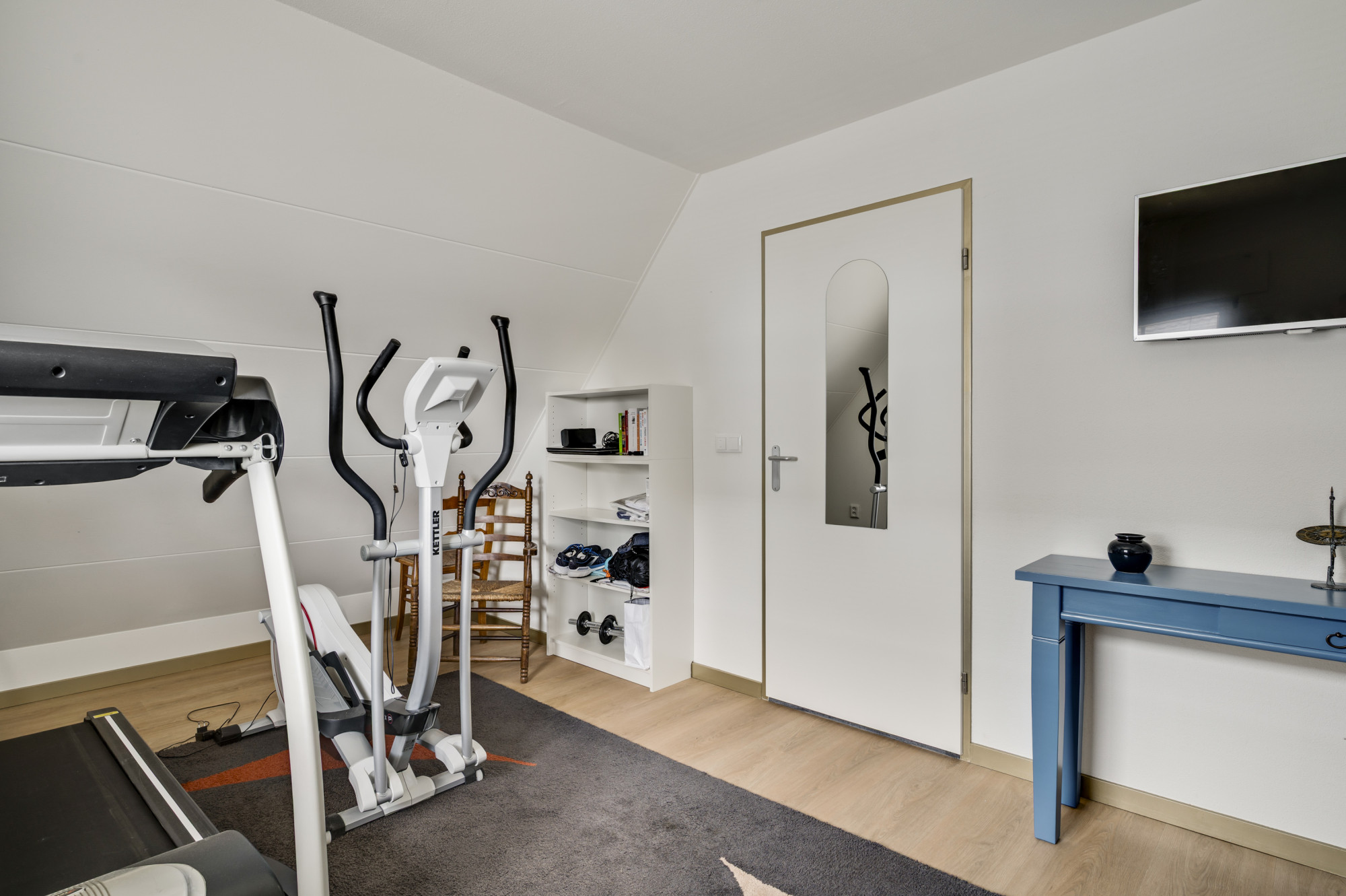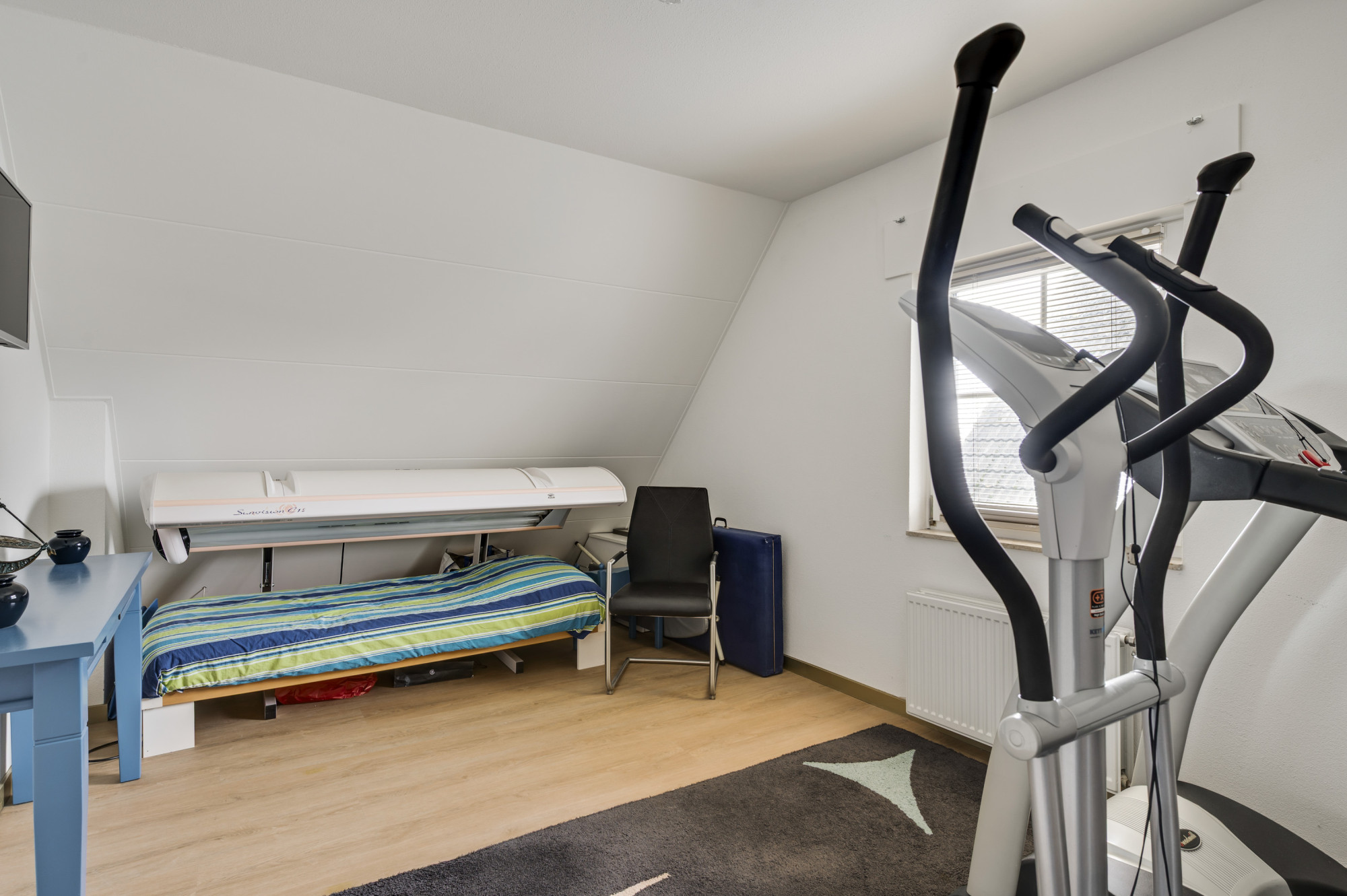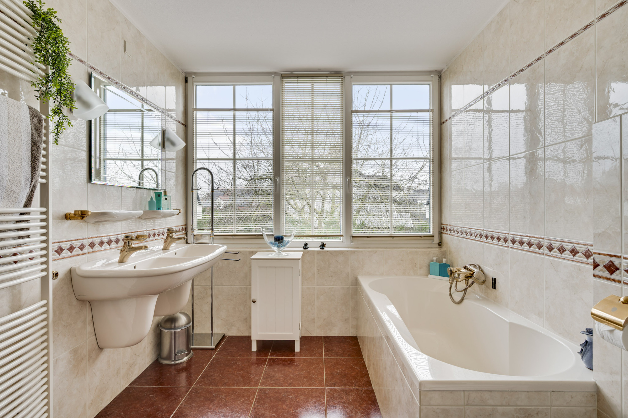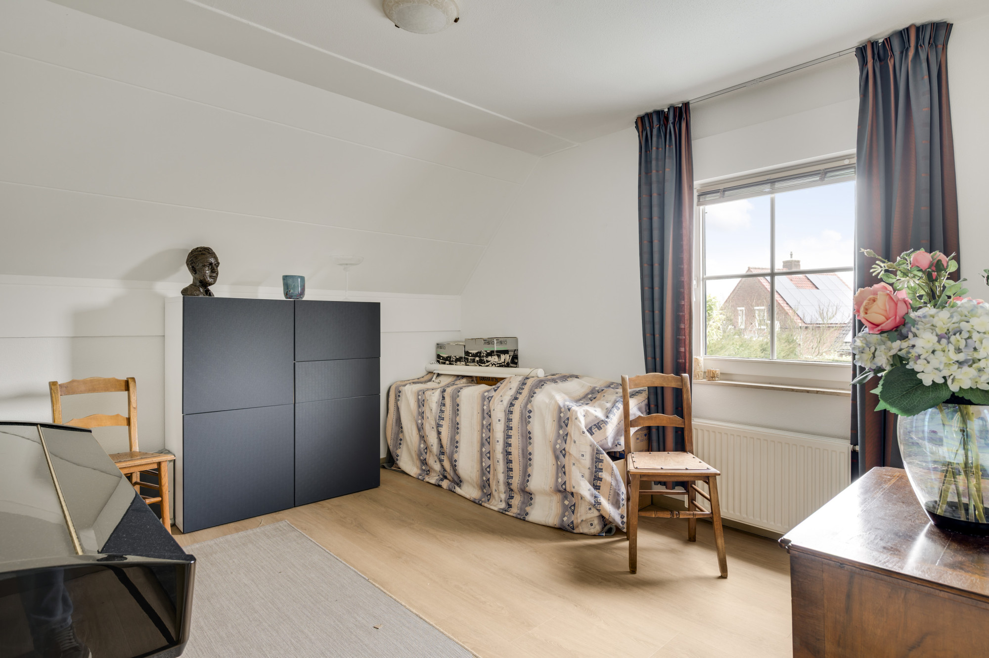 Op de eerste verdieping bevinden zich vier royale slaapkamers (dus 5 in totaal), waaronder een royale ouderslaapkamer met eigen inloopkast. Eén van de slaapkamers is momenteel in gebruik als kleedkamer met schuifkastenwand, doch is ook als volwaardige slaapkamer te gebruiken. De complete badkamer met veel daglichttoetreding door het grote dakkapel is van alle gemakken voorzien met een ligbad, douchecabine, dubbele wastafel en zwevend toilet. Erg praktisch is dat de badkamer niet alleen vanuit de overloop te bereiken is, maar ook via de ouderslaapkamer. De 1e verdieping is grotendeels voorzien van een mooie pvc vloer.