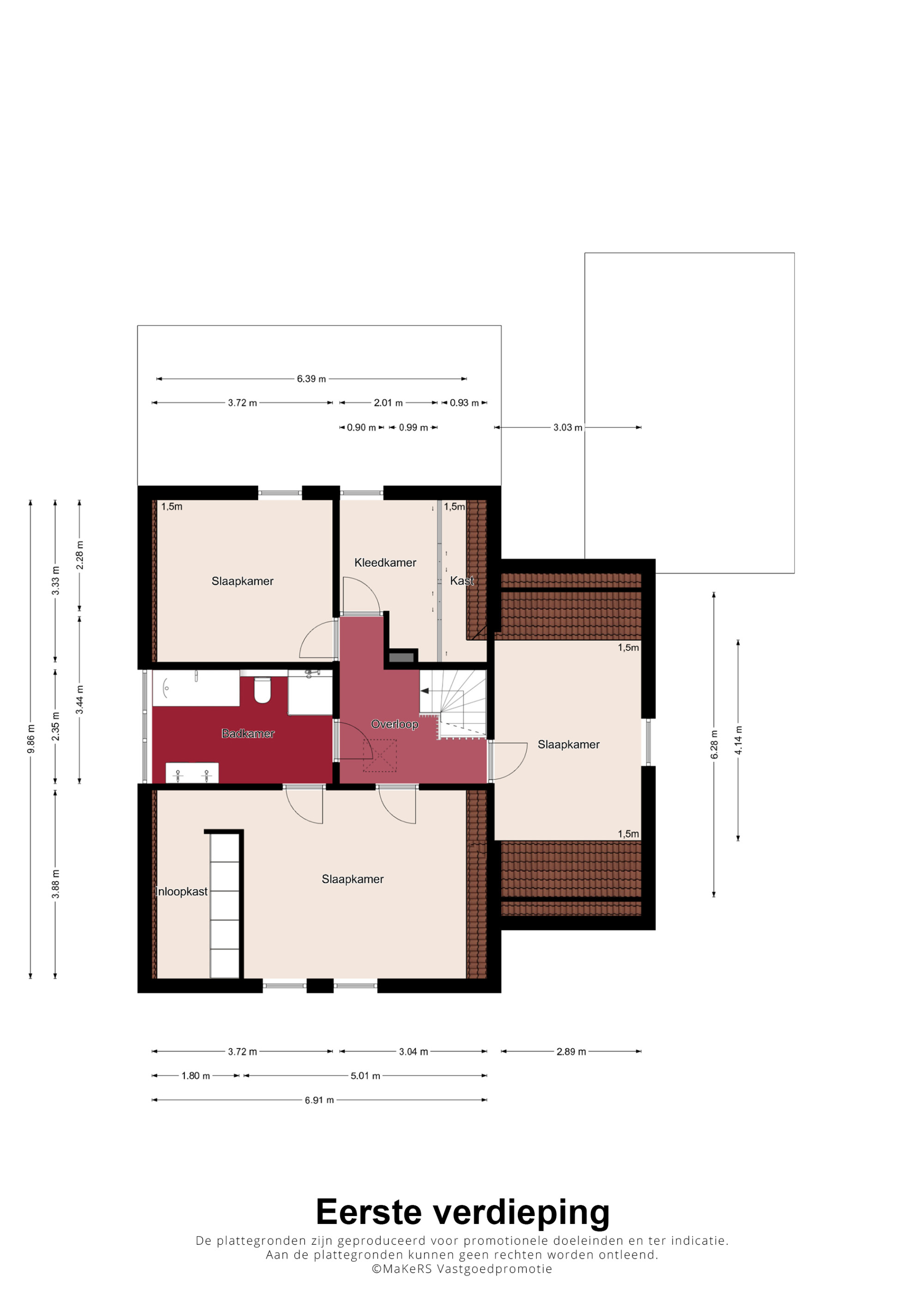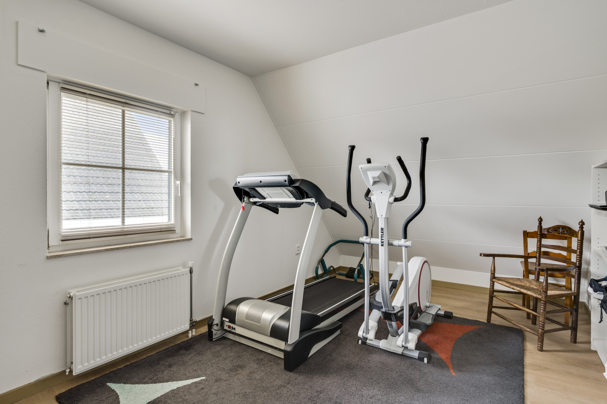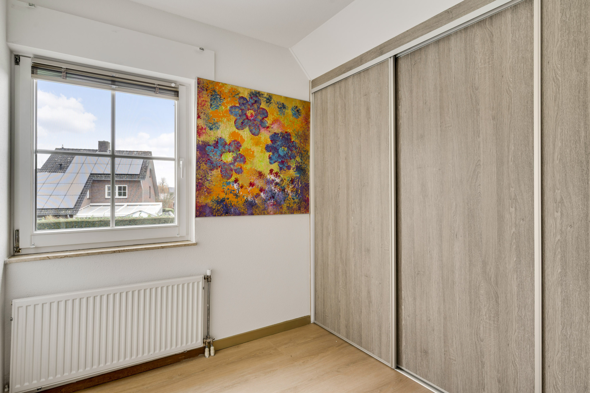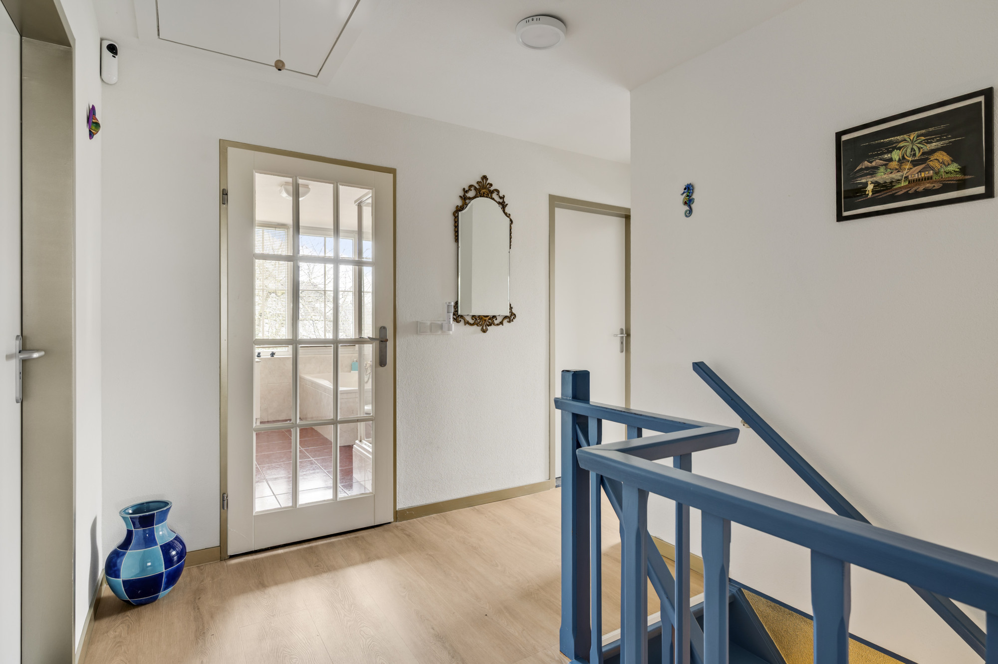 Op de eerste verdieping bevinden zich vier royale slaapkamers (dus 5 in totaal), waaronder een royale ouderslaapkamer met eigen inloopkast. Eén van de slaapkamers is momenteel in gebruik als kleedkamer met schuifkastenwand, doch is ook als volwaardige slaapkamer te gebruiken. De complete badkamer met veel daglichttoetreding door het grote dakkapel is van alle gemakken voorzien met een ligbad, douchecabine, dubbele wastafel en zwevend toilet. Erg praktisch is dat de badkamer niet alleen vanuit de overloop te bereiken is, maar ook via de ouderslaapkamer. De 1e verdieping is grotendeels voorzien van een mooie pvc vloer.