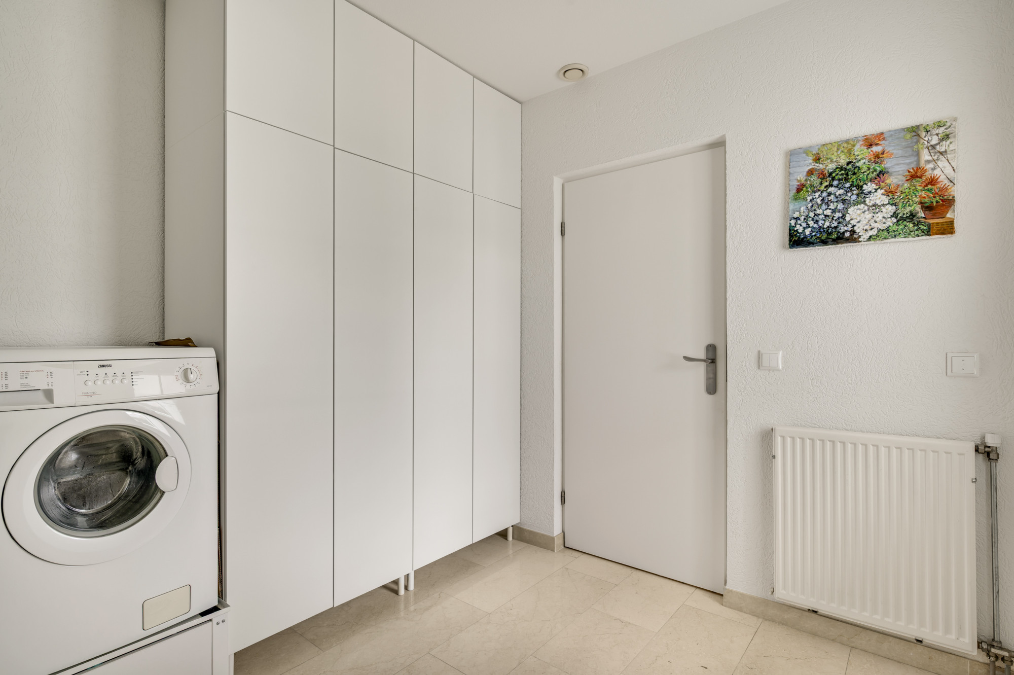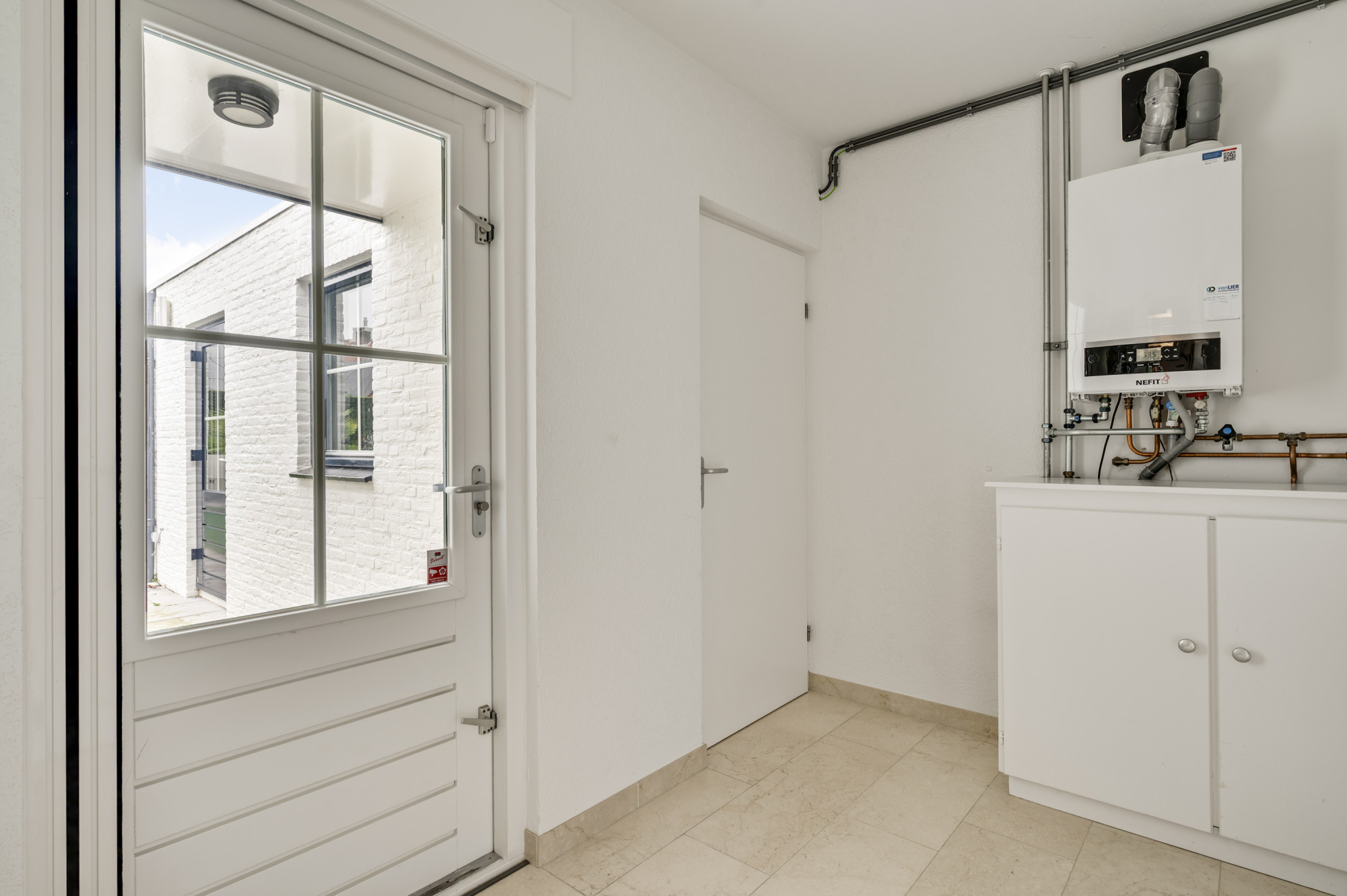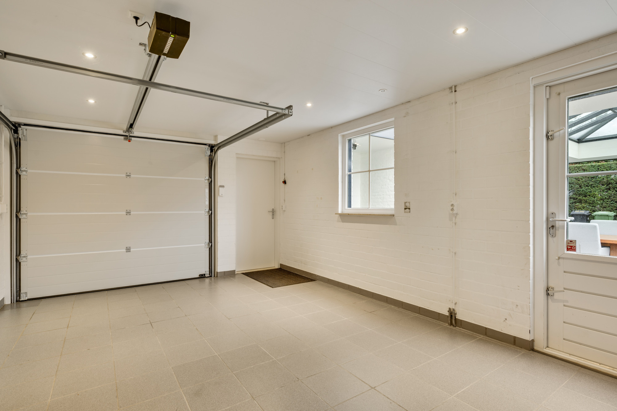Vanuit de keuken is de bijkeuken bereikbaar, voorzien van witgoedaansluitingen, de cv-ketel (Nefit Trendline HRC, eigendom ca. 2017) en extra bergruimte. Vanuit de bijkeuken zijn zowel de tuin als de inpandige garage toegankelijk. De garage beschikt over een elektrische poort en een loopdeur naar de achtertuin, waardoor gemak en veiligheid hier optimaal zijn gecombineerd.