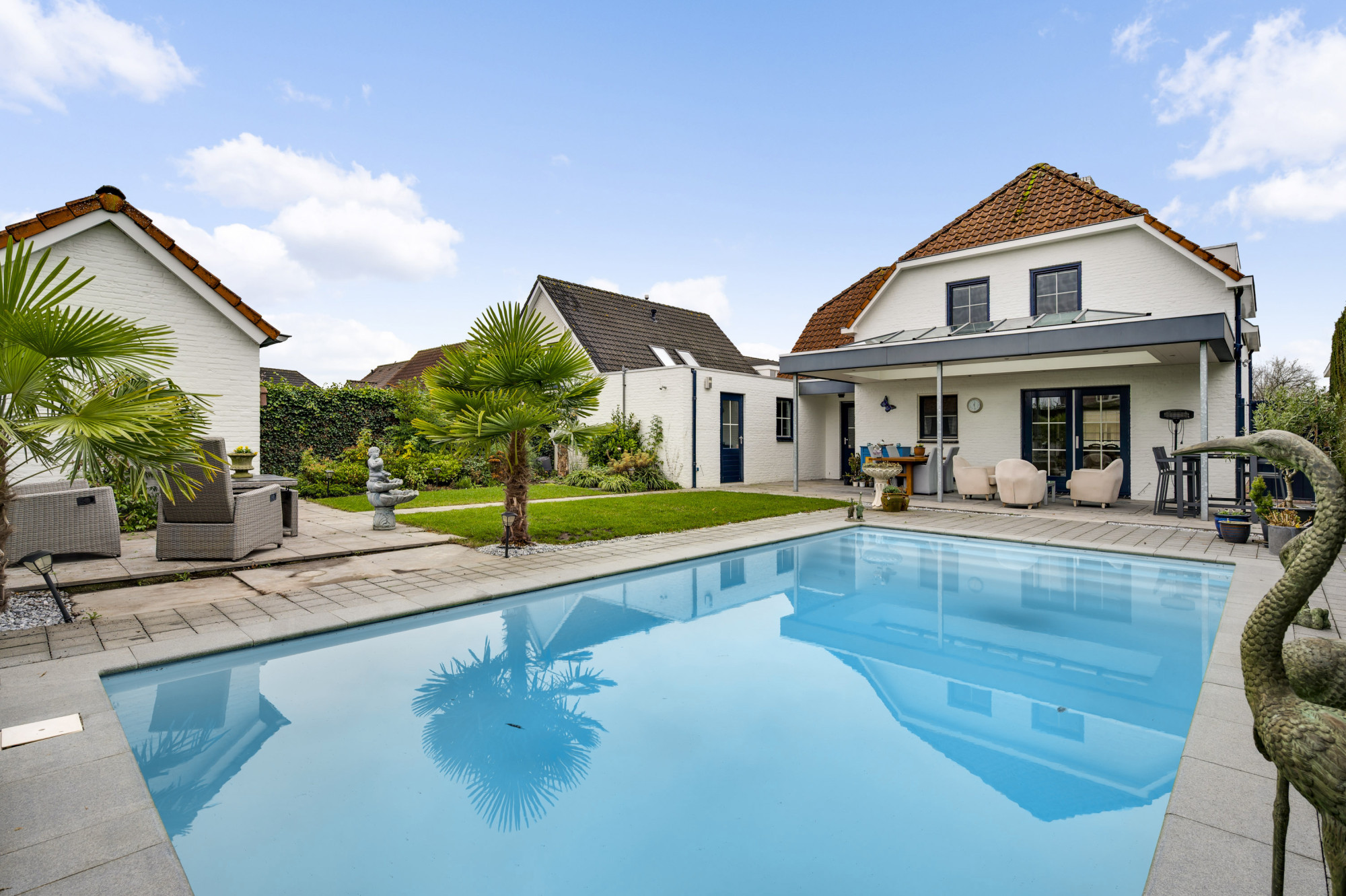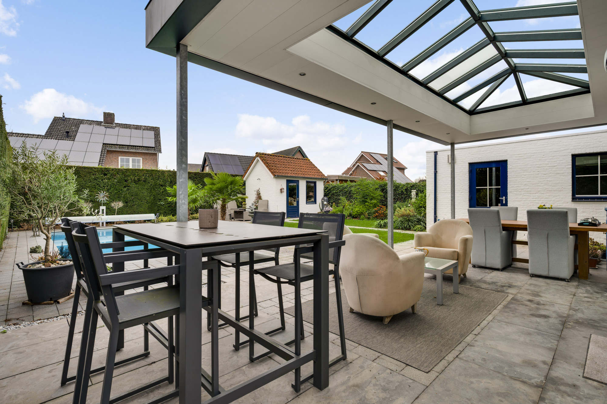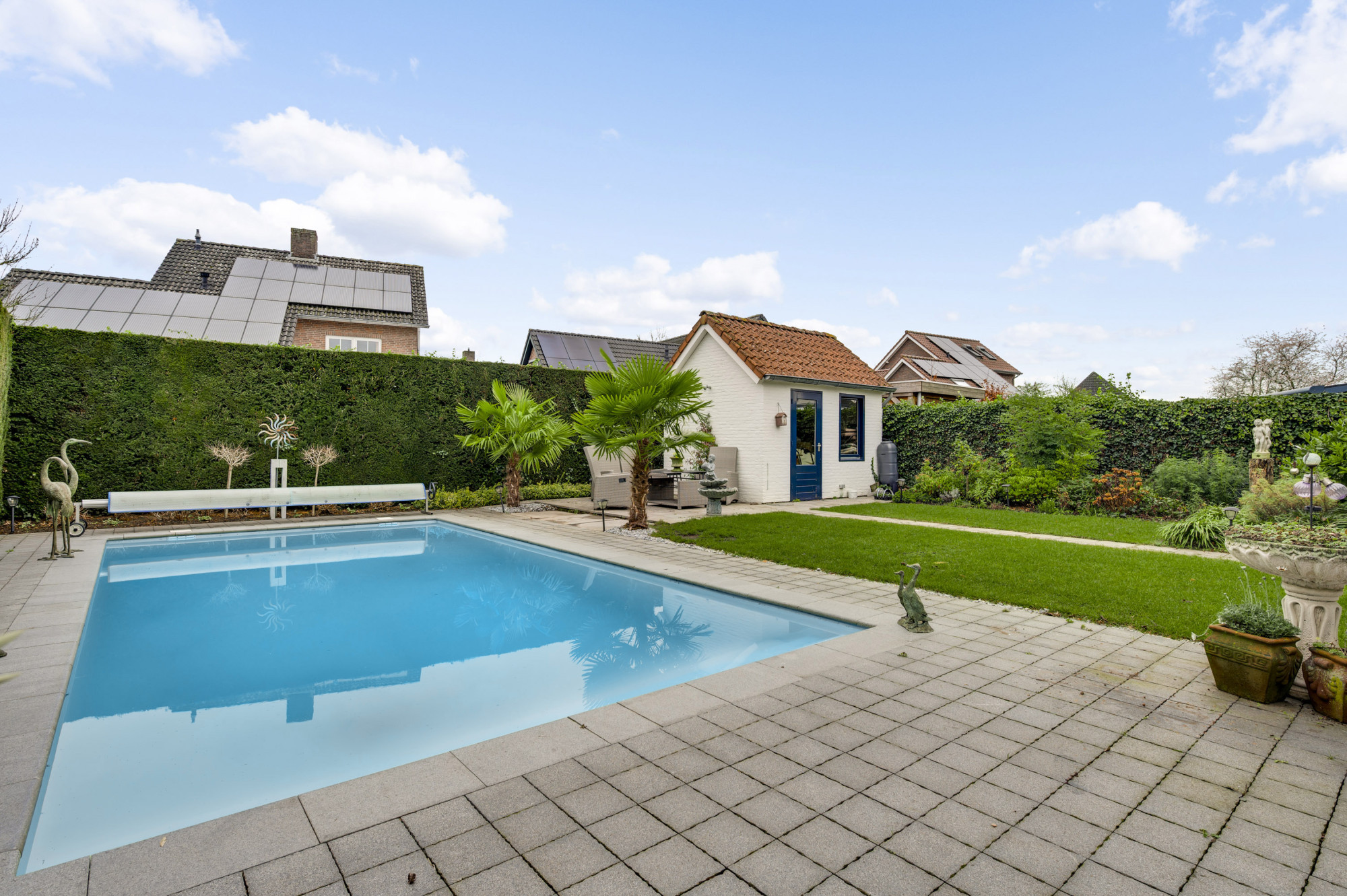 Er is een verzorgde voortuin met een diepe oprit die plaats biedt aan meerdere voertuigen en toegang biedt tot de inpandige garage. Een vrije achterom leidt naar de achtertuin, die royaal van opzet is en veel privacy biedt. De tuin is fraai aangelegd met een riante terrasoverkapping, een terras, een stenen buitenberging, gazon, diverse borders en – als absolute eyecatcher – een prachtig verwarmd zwembad. Het zwembad wordt verwarmd middels zonnecollectoren en biedt een luxe en duurzame manier om volop van het buitenleven te genieten.