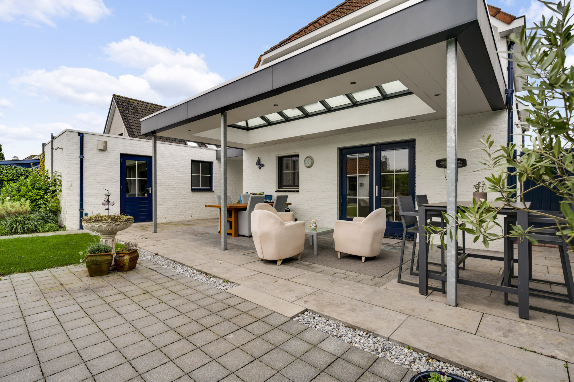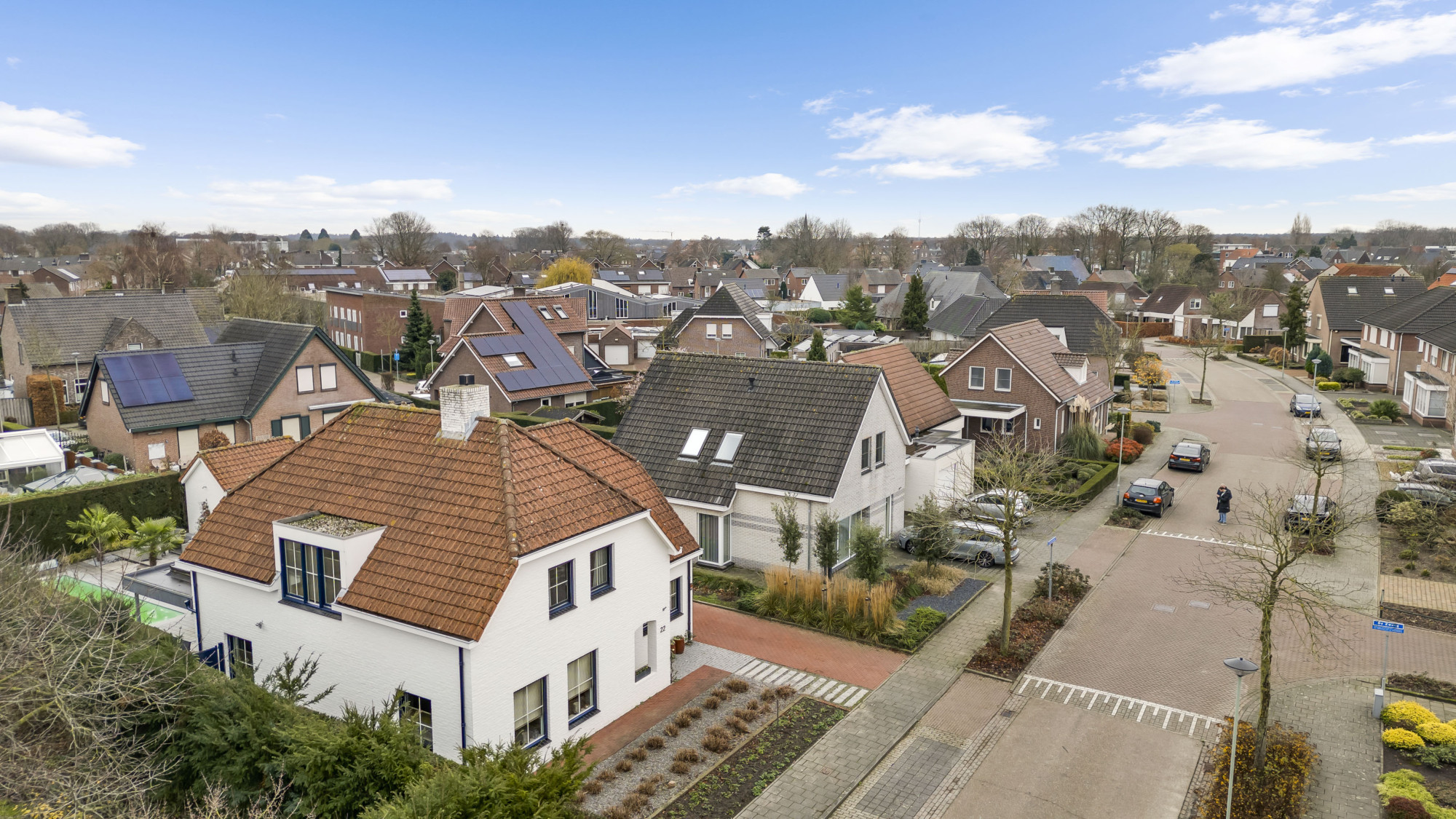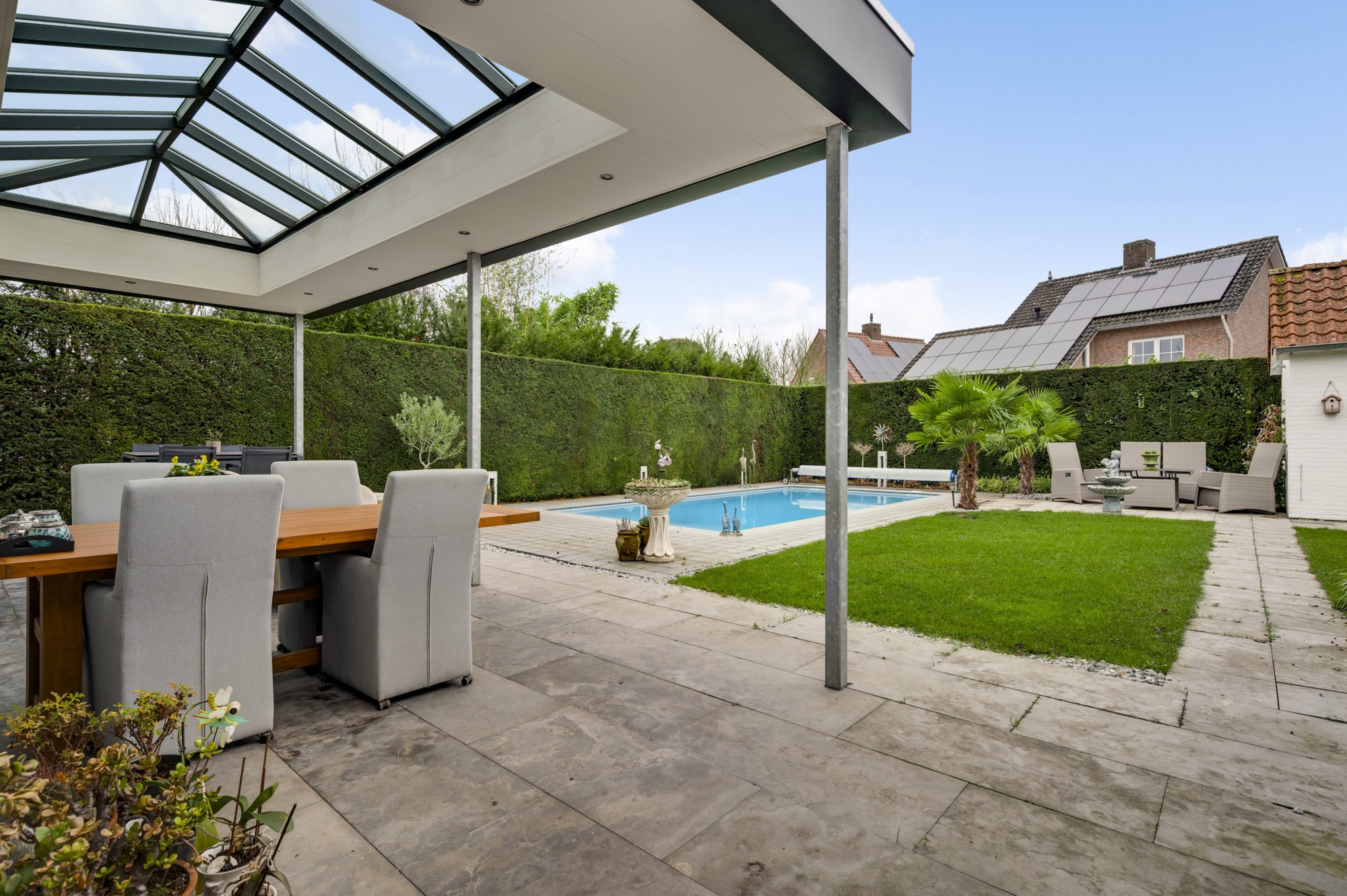 Er is een verzorgde voortuin met een diepe oprit die plaats biedt aan meerdere voertuigen en toegang biedt tot de inpandige garage. Een vrije achterom leidt naar de achtertuin, die royaal van opzet is en veel privacy biedt. De tuin is fraai aangelegd met een riante terrasoverkapping, een terras, een stenen buitenberging, gazon, diverse borders en – als absolute eyecatcher – een prachtig verwarmd zwembad. Het zwembad wordt verwarmd middels zonnecollectoren en biedt een luxe en duurzame manier om volop van het buitenleven te genieten.