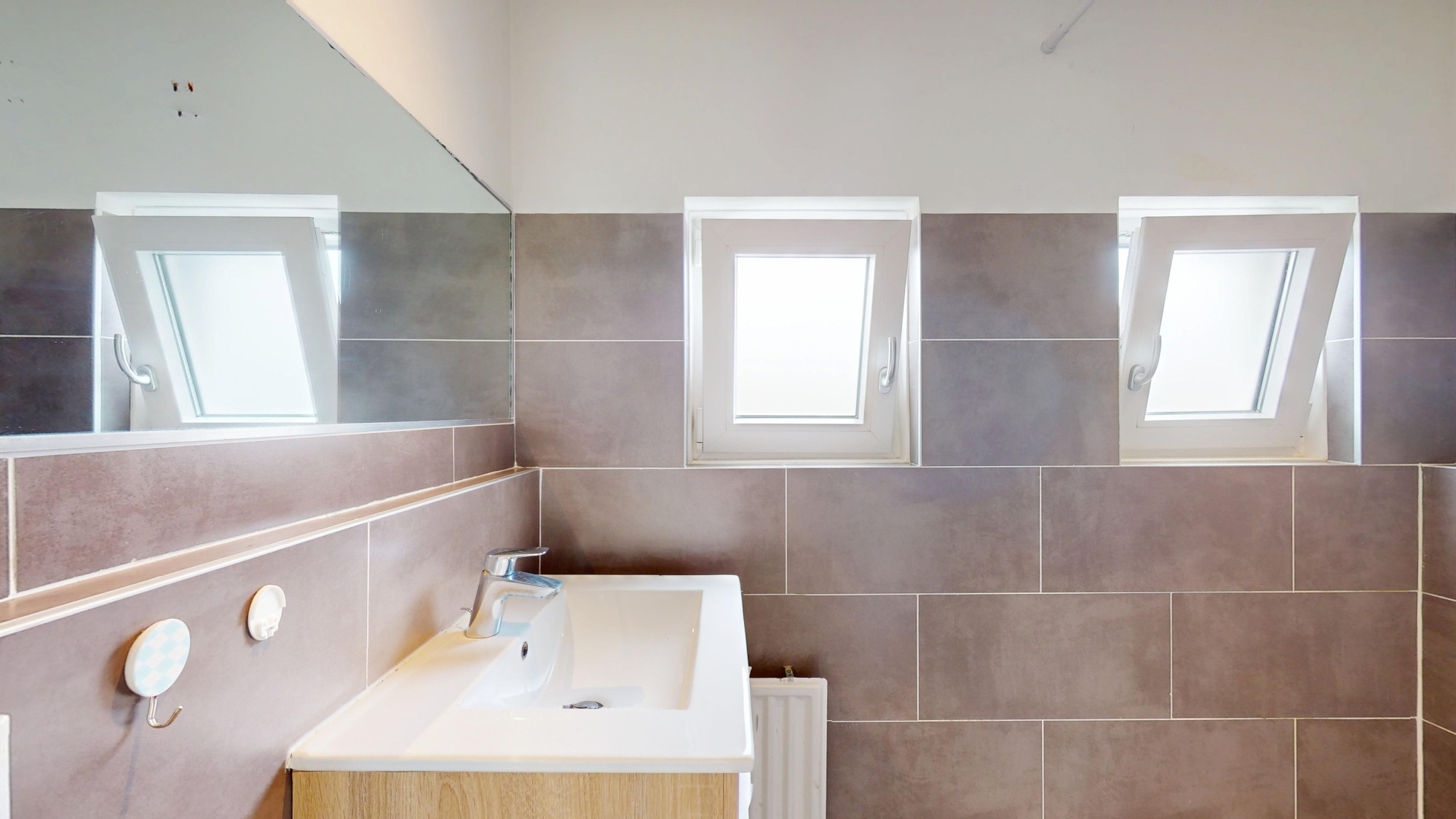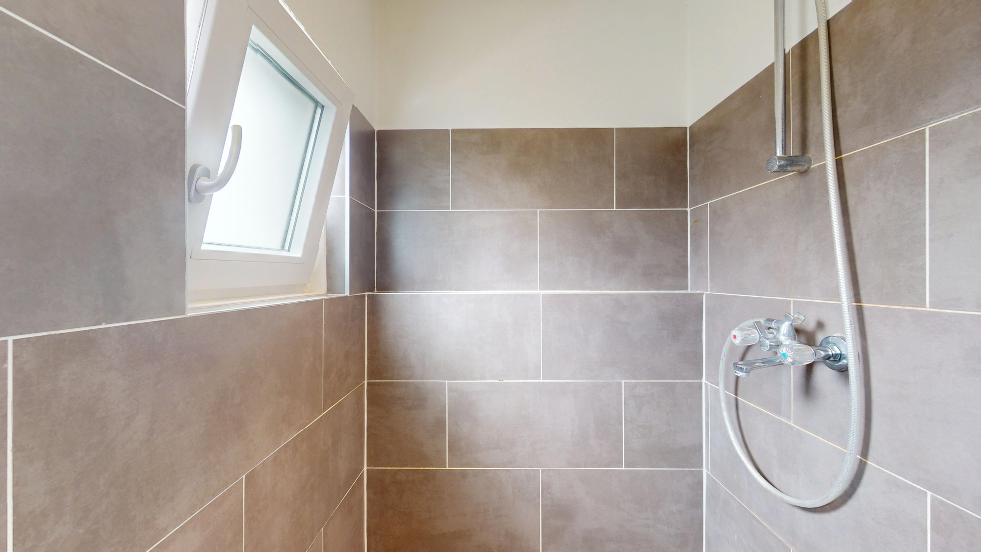 Half betegelde badkamer (2,2 x 1,2 m) voorzien van inloopdouche en wastafel met ombouw.
