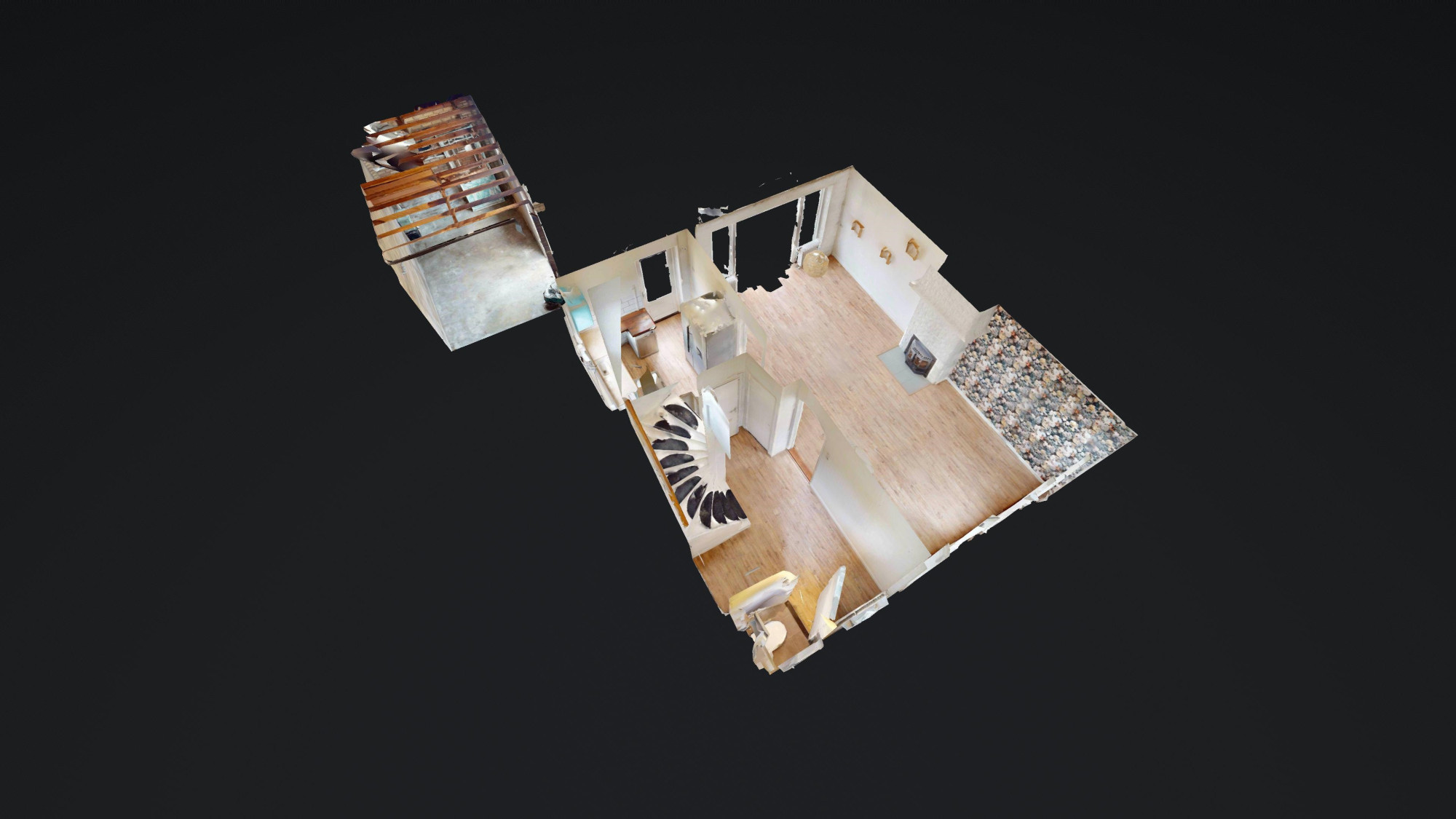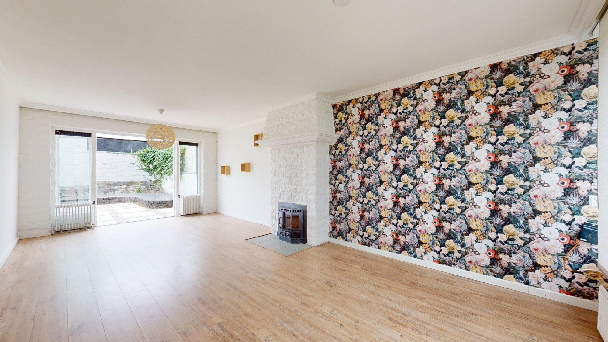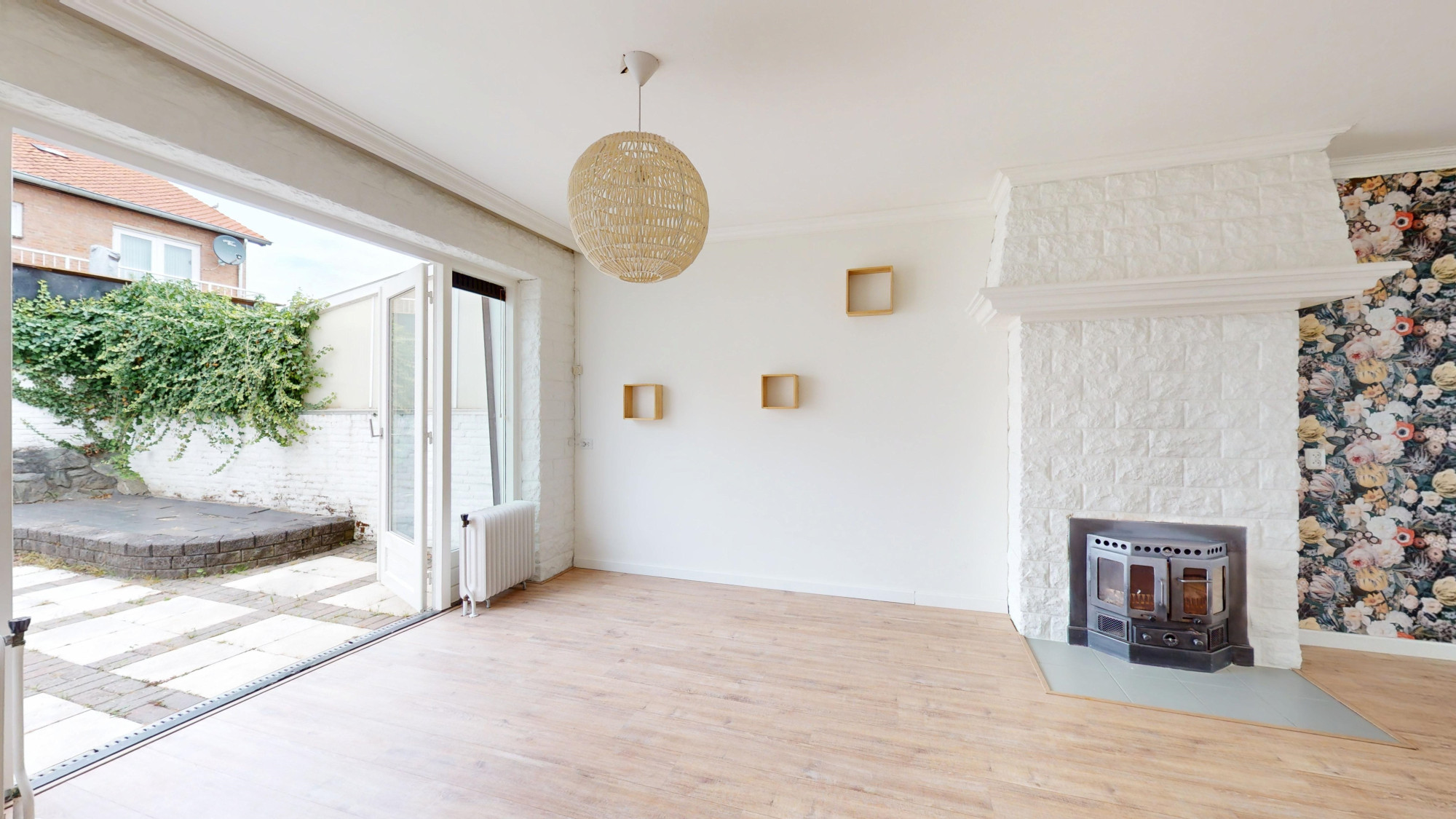 Woonkamer (7,4 x 3,8 m) voorzien van laminaatvloer en uitgerust met een houtkachel. Vanuit de woonkamer zijn er openslaande deuren naar de achtertuin.