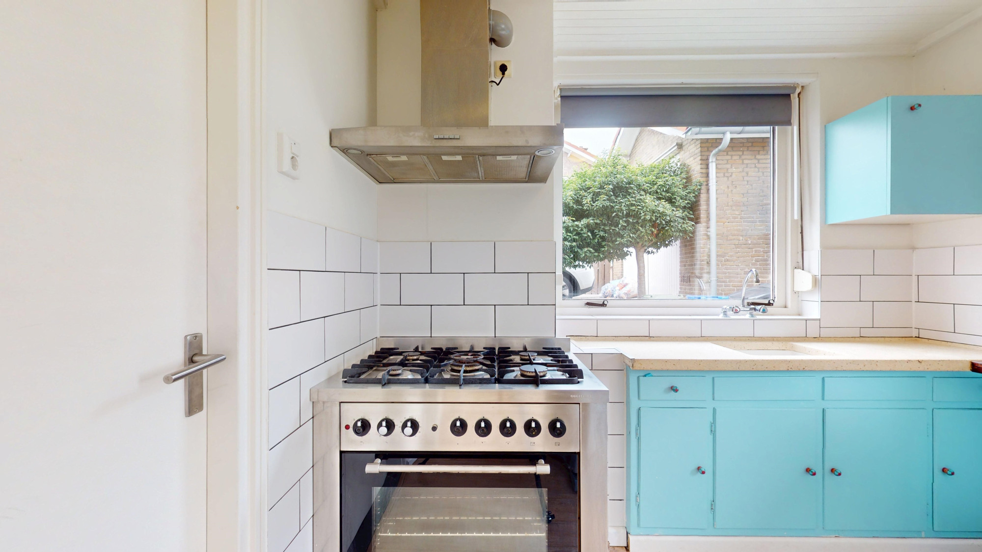 Gesloten keuken (3 x 2,7 m) voorzien van laminaatvloer en uitgerust met de originele Bruynzeel opstelling met de volgende apparatuur: Amerikaanse koel-/viriescombinatie, oven, 5-pits gas gasfornuis, vaatwasser en rvs schouwmodel afzuigkap.