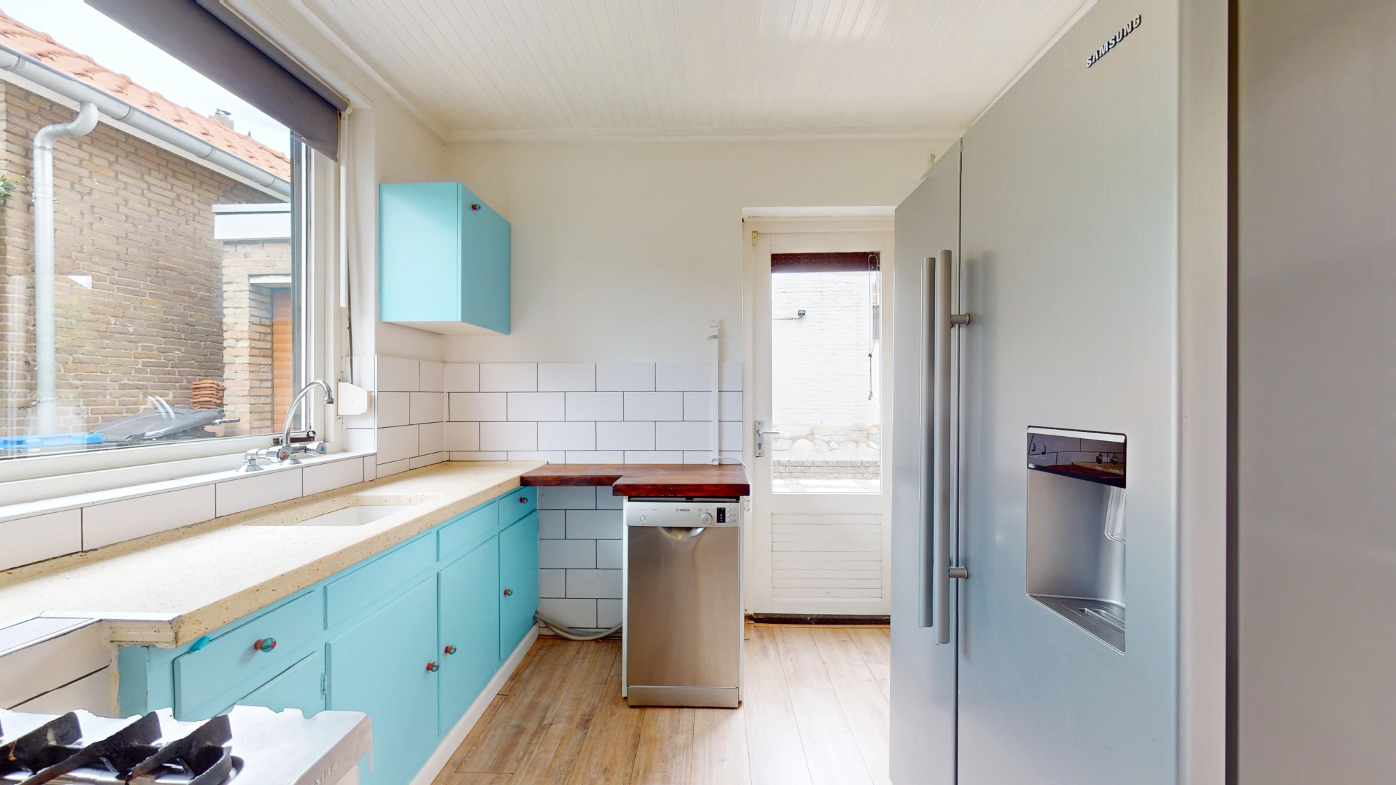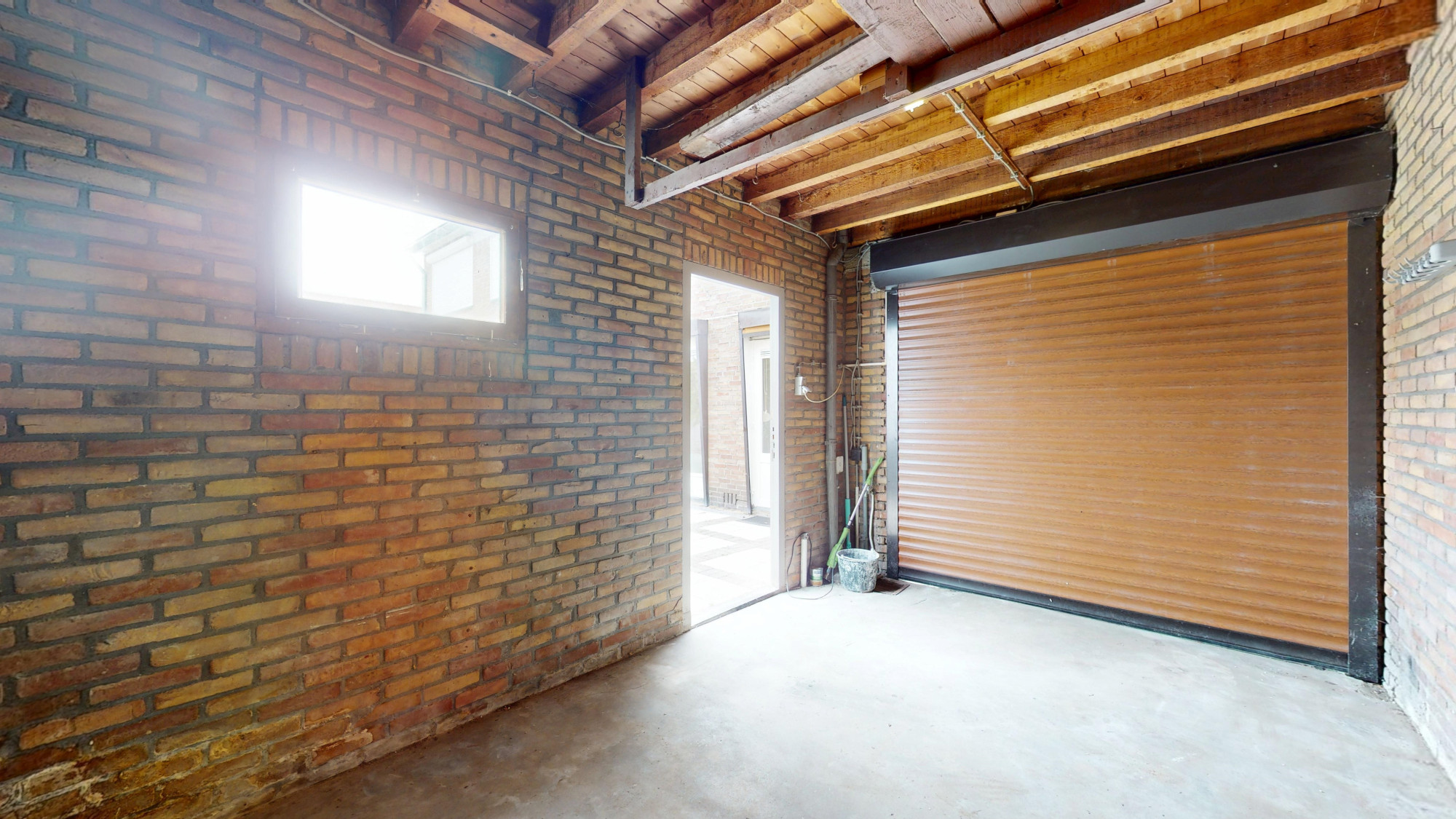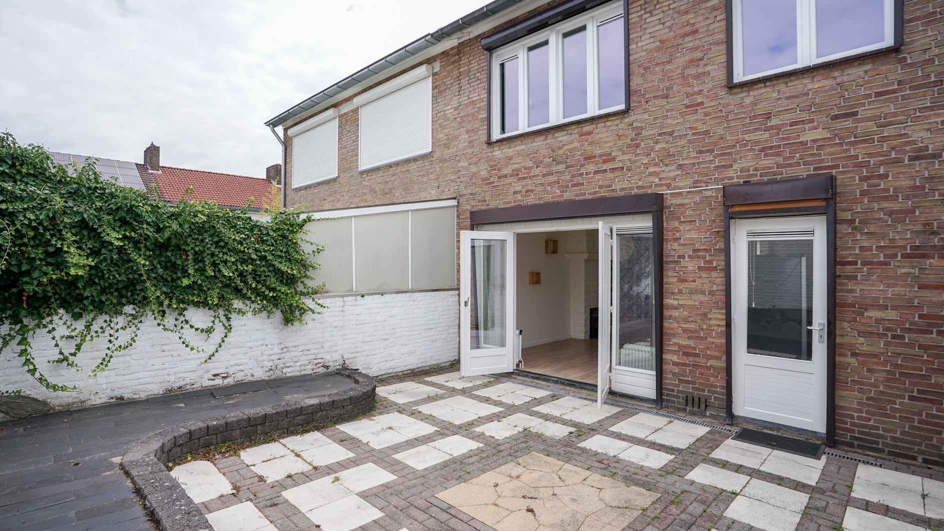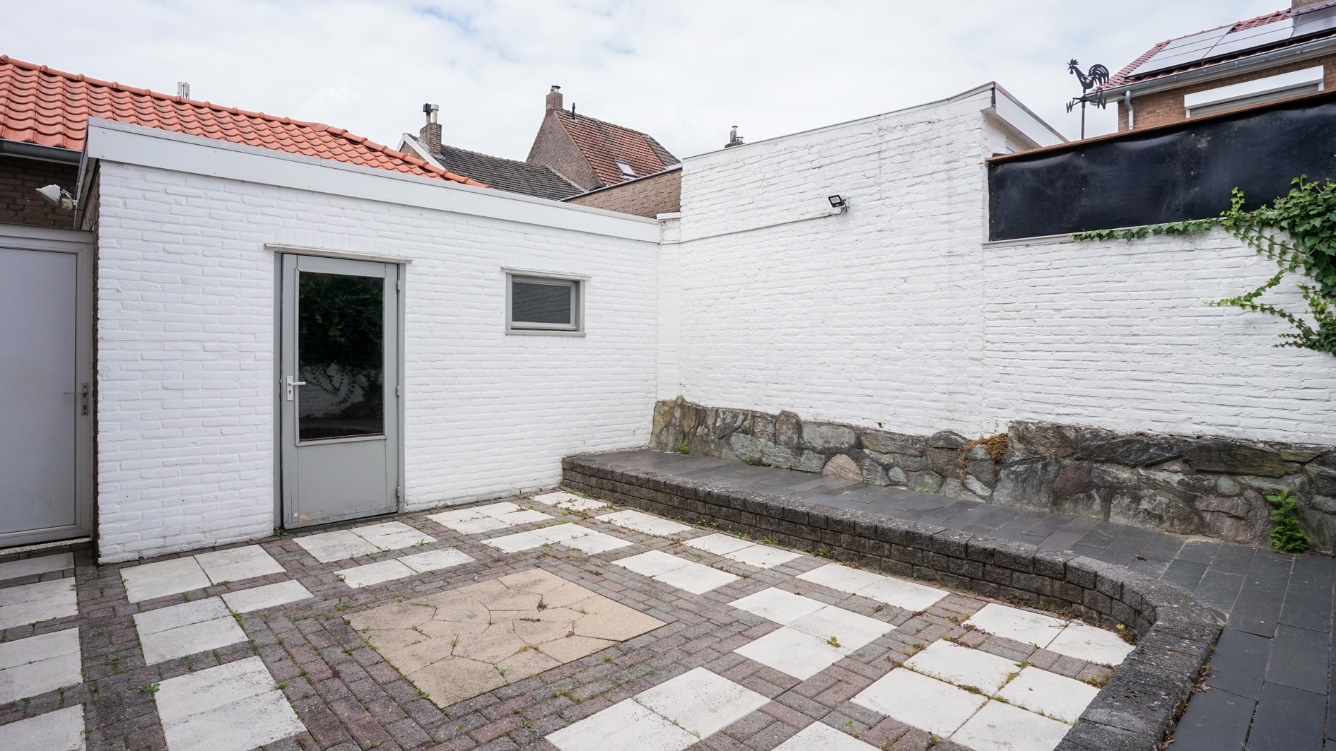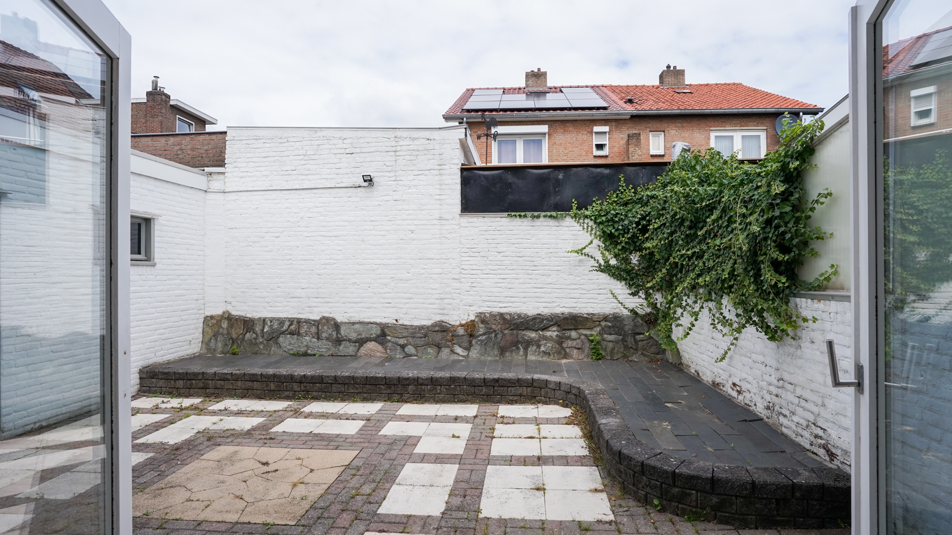 Vanuit de keuken is de geheel bestrate en geheel omsloten achtertuin (6,5 x 6 m) bereikbaar.