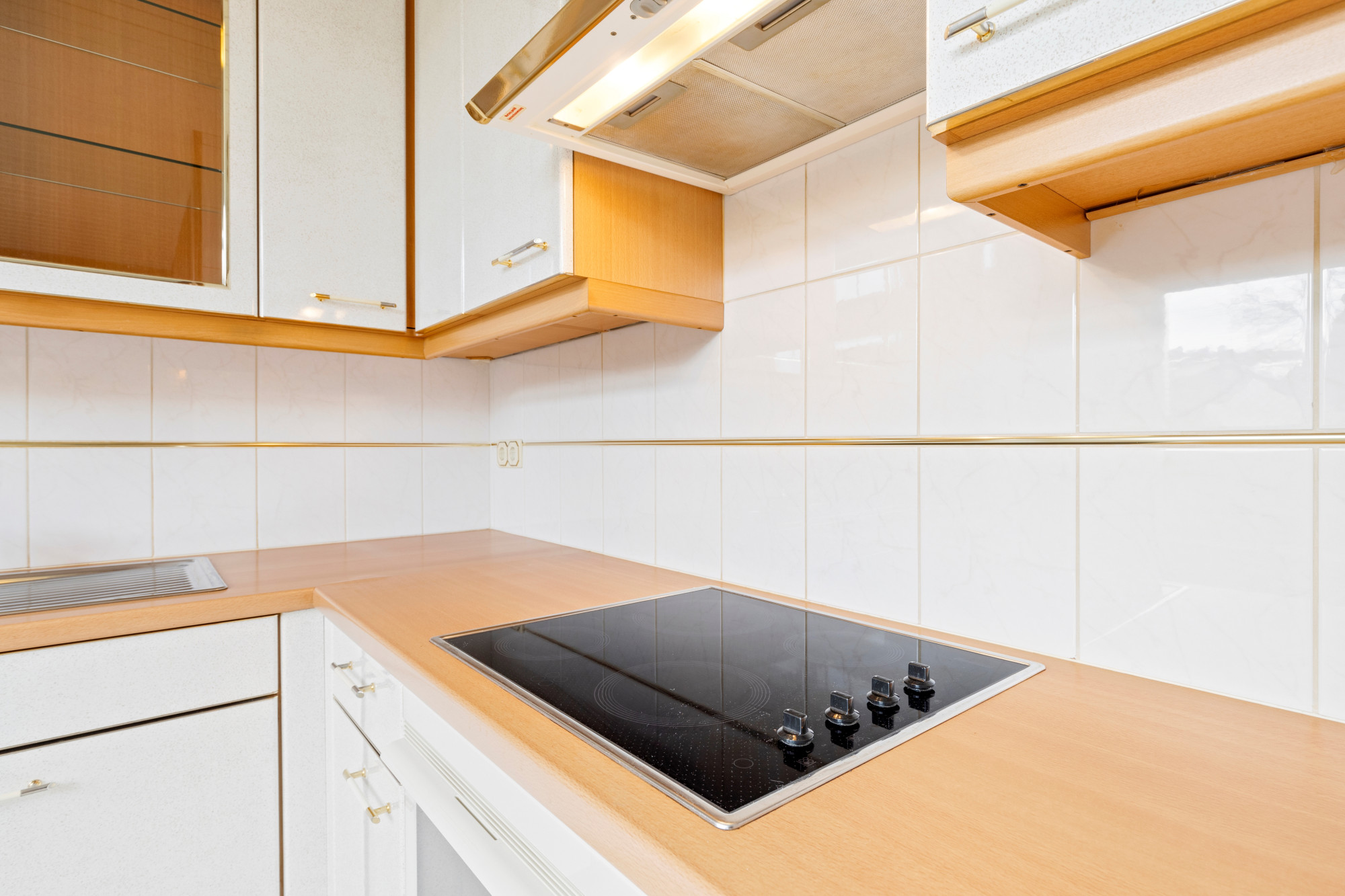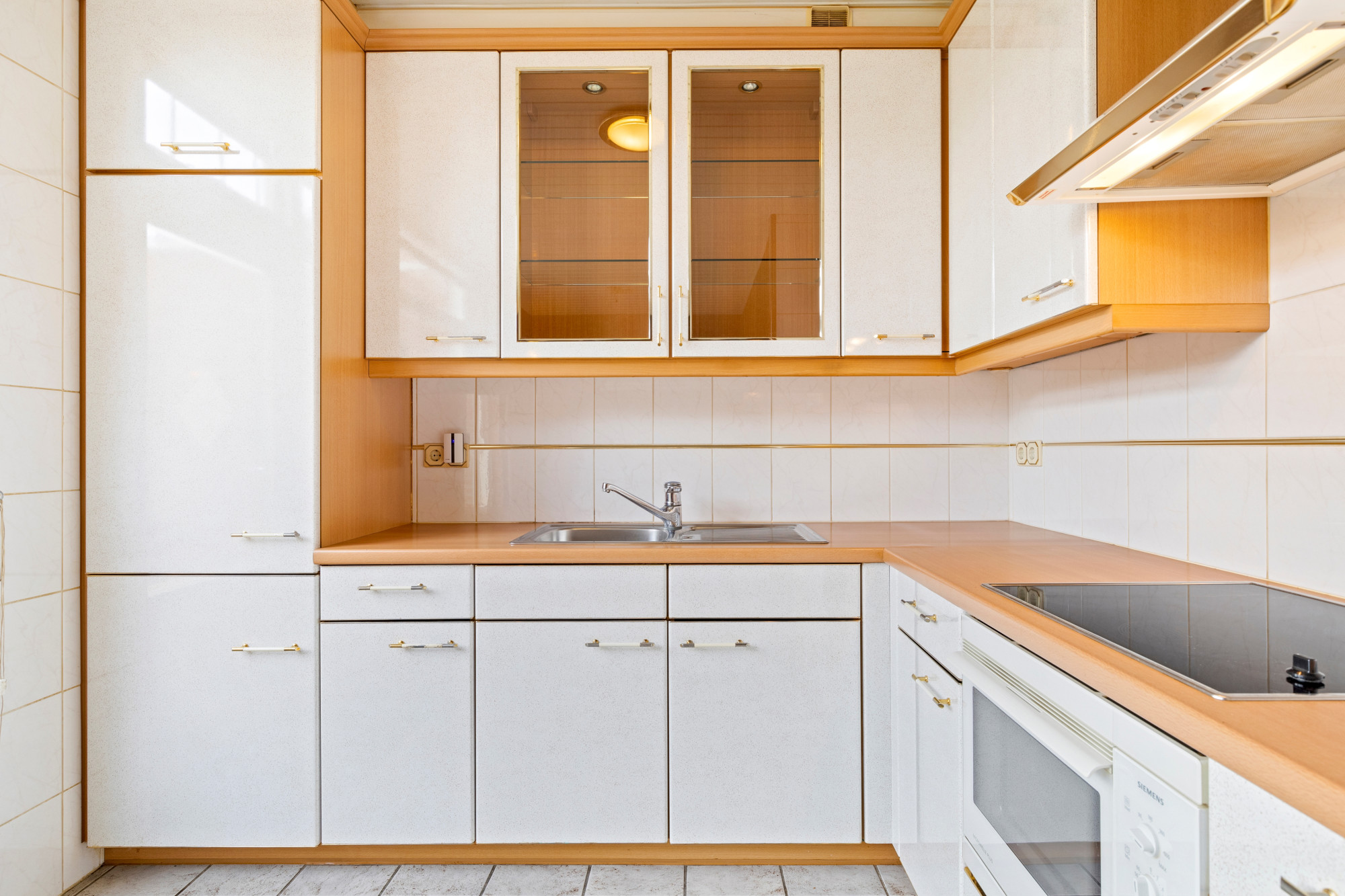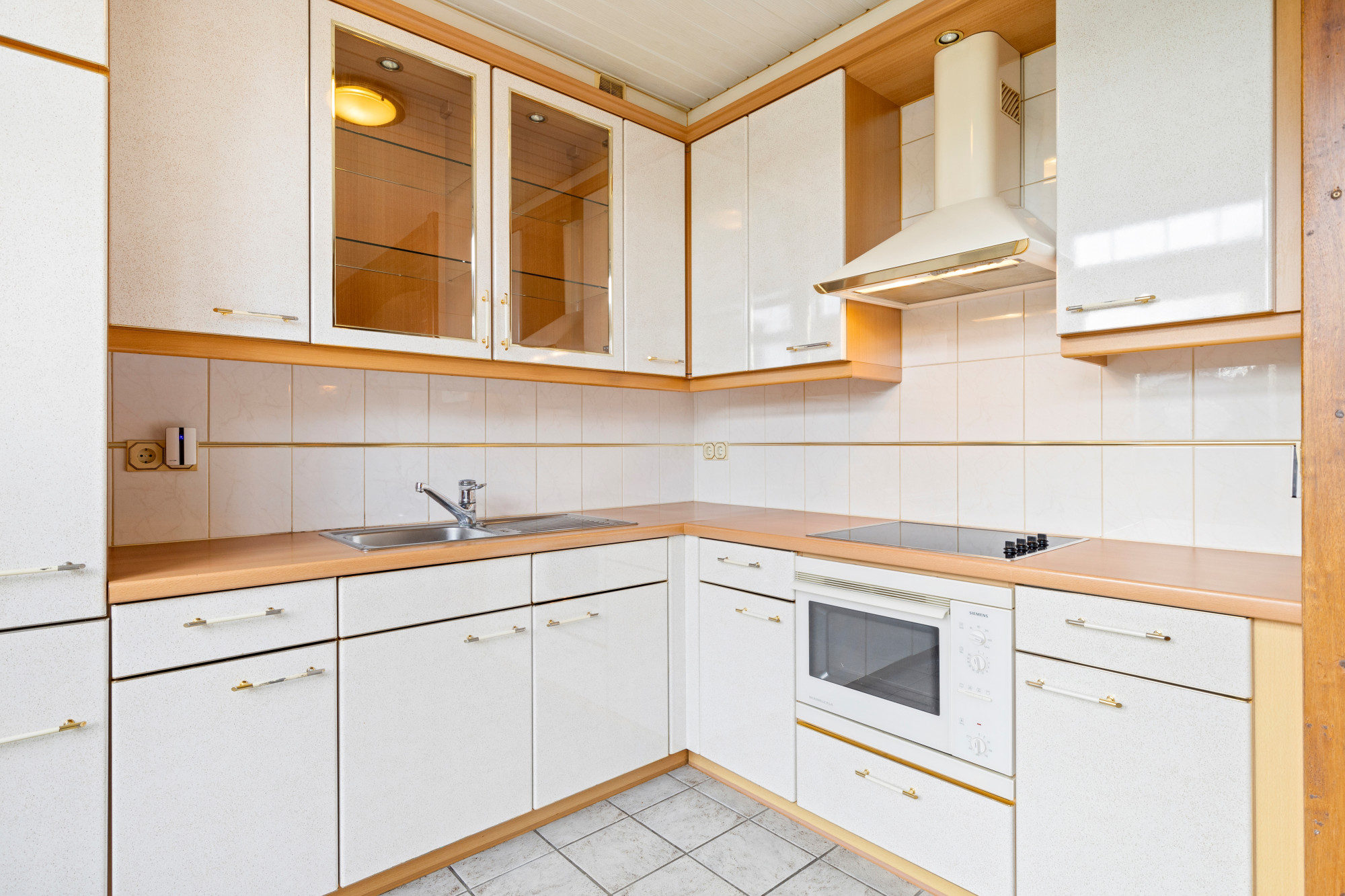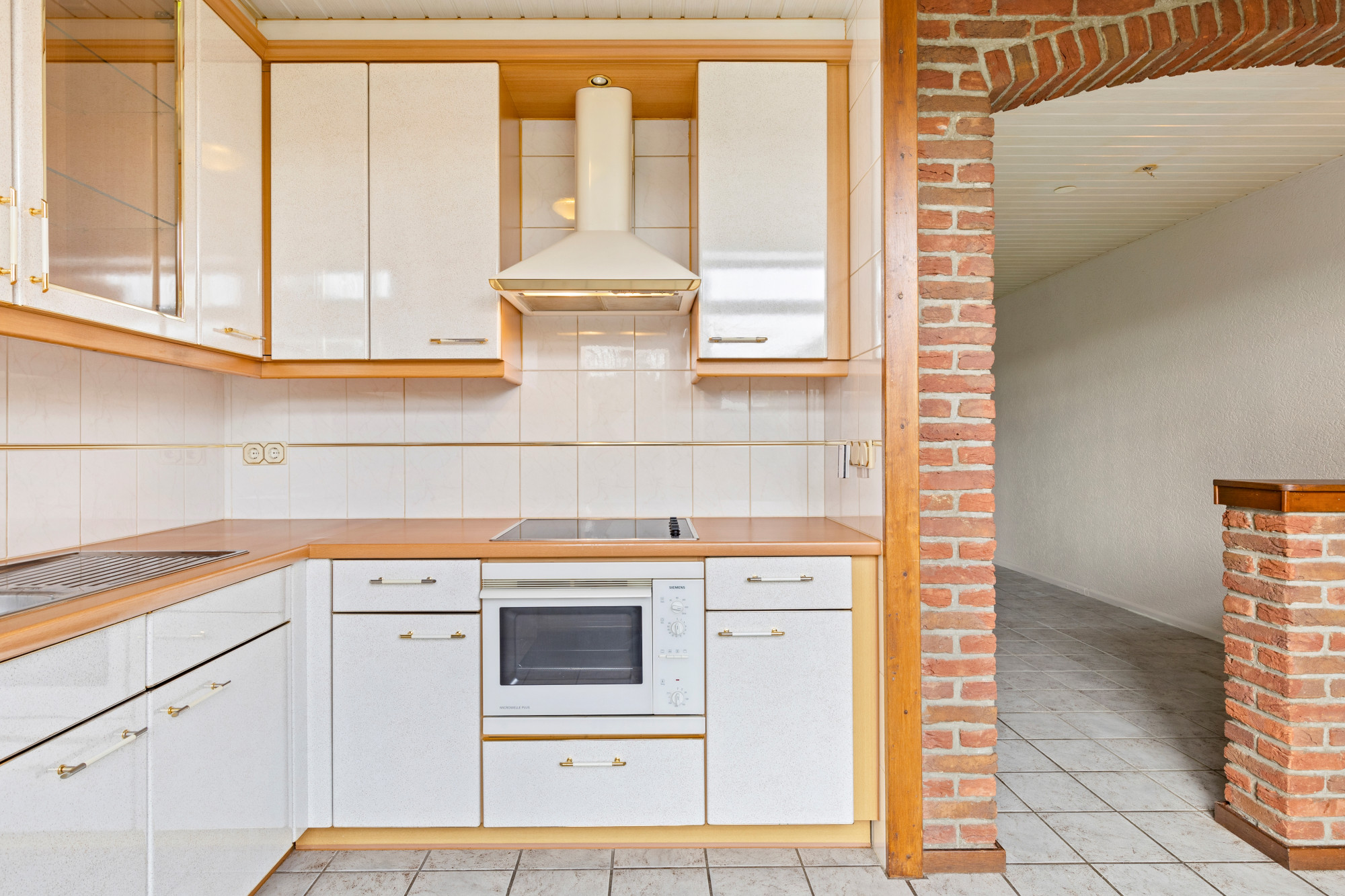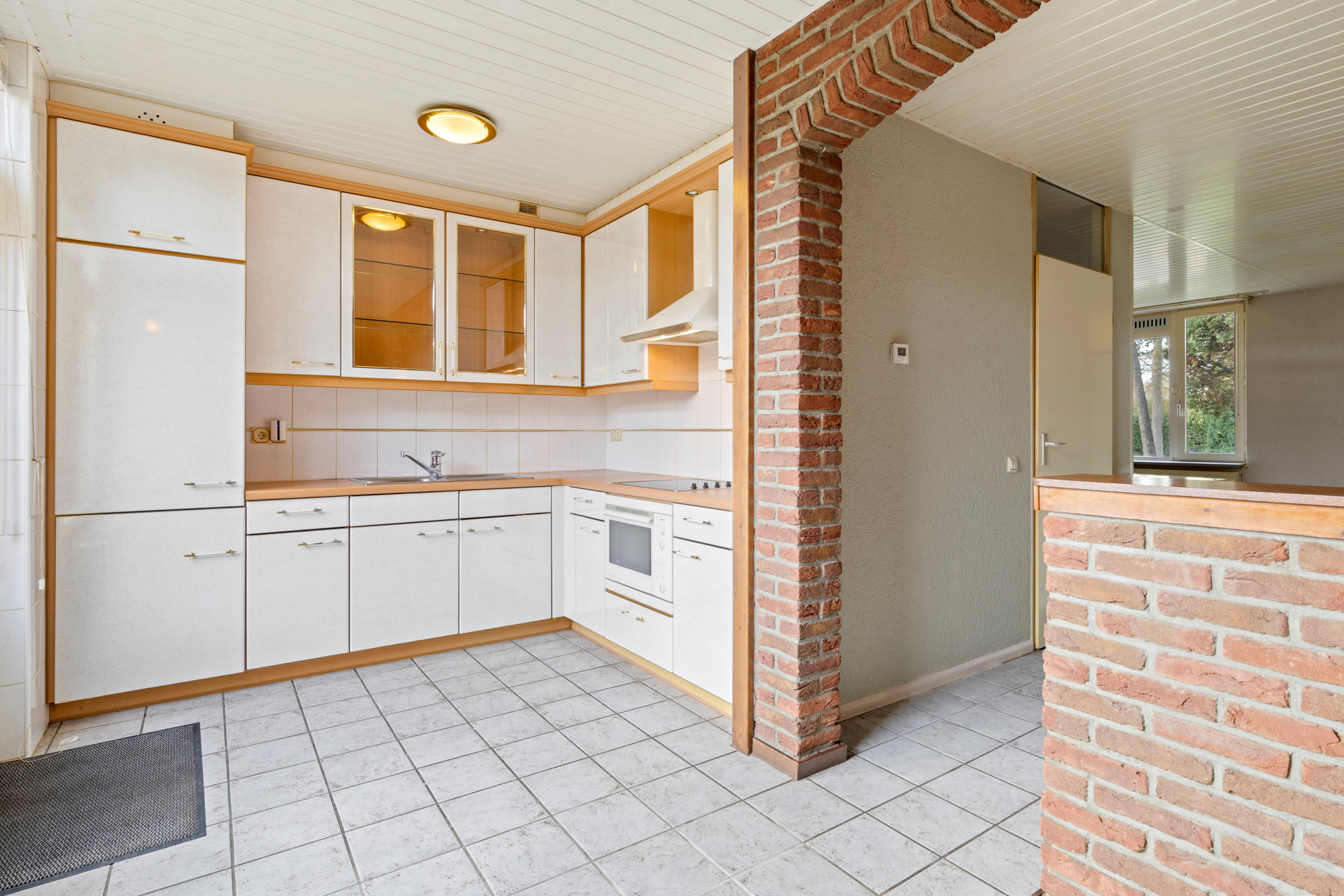 Ruime half open keuken v.v. plavuizenvloer en aanbouwkeuken in hoekopstelling v.v. koel/vriescombinatie, keramische kookplaat, wasemkap en combi-oven.