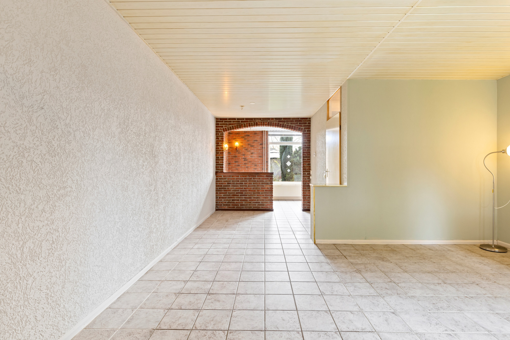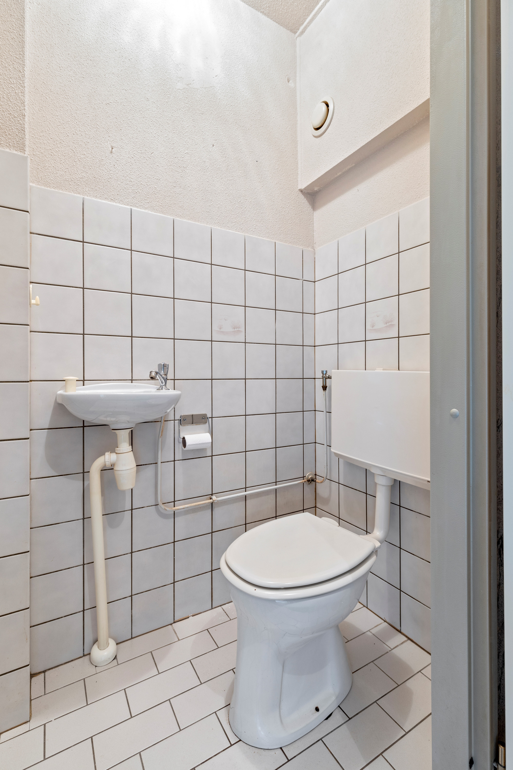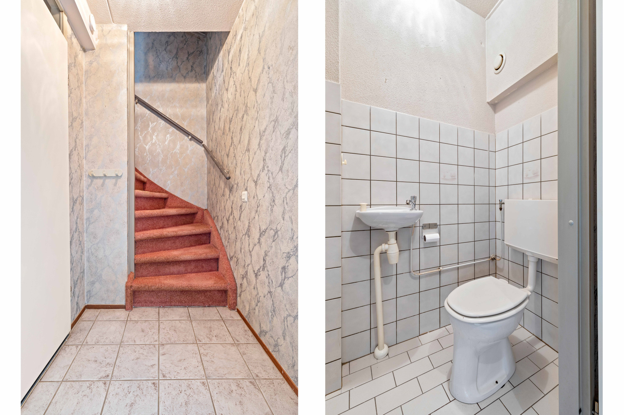 L-woonkamer v.v. een plavuizenvloer, verdeelportaal v.v. plavuizenvloer alwaar trap naar de 1e verdieping alsmede toegang naar de half betegelde toiletruimte met fonteintje.