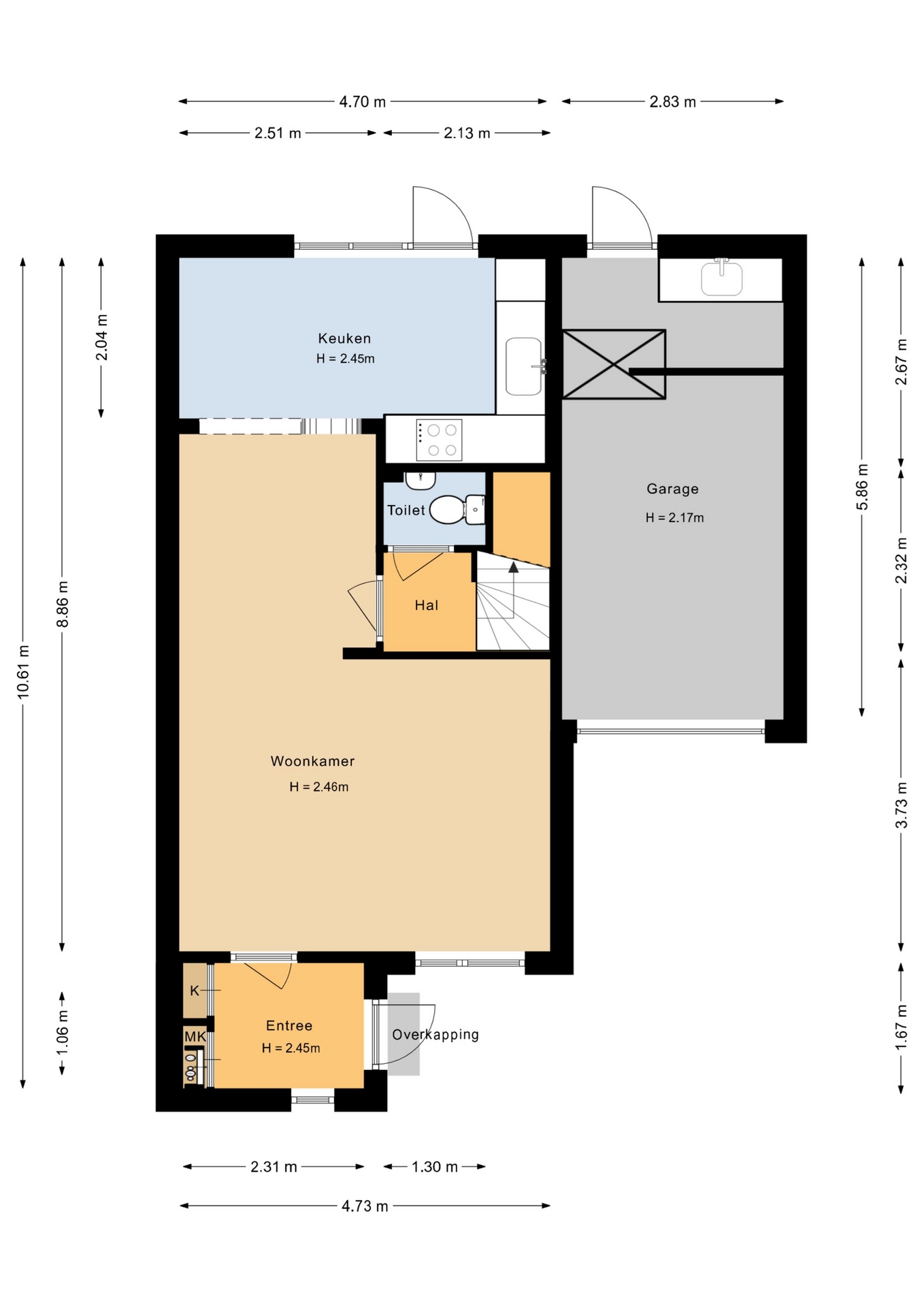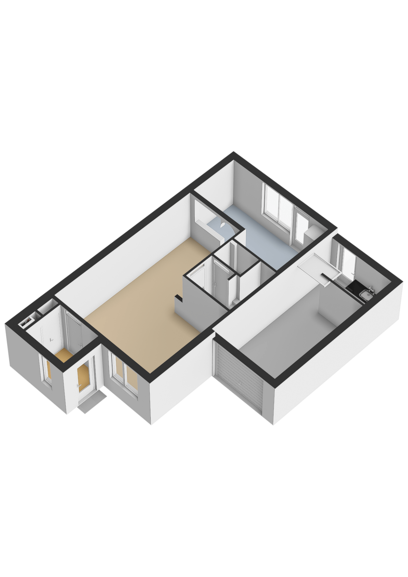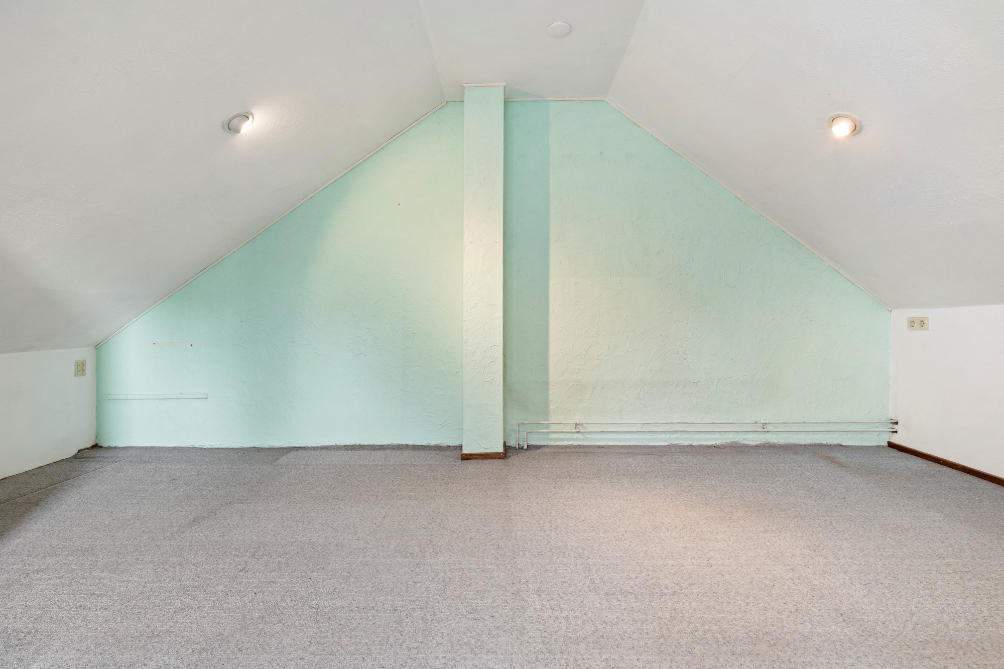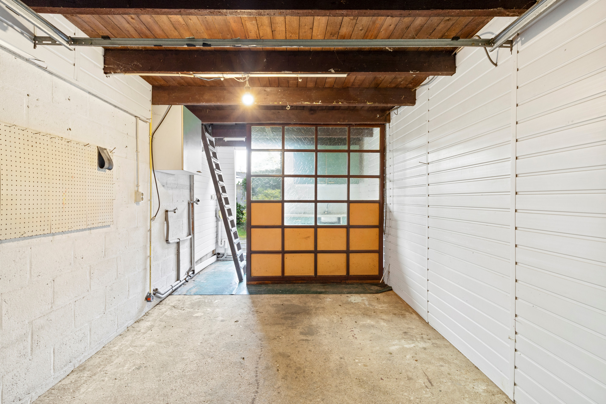 Royale garage met aansluitpunt voor wasmachine en droger en stalen kantelpoort. De garage beschikt eveneens over een zolderverdieping die middels een losse trap bereikbaar is.