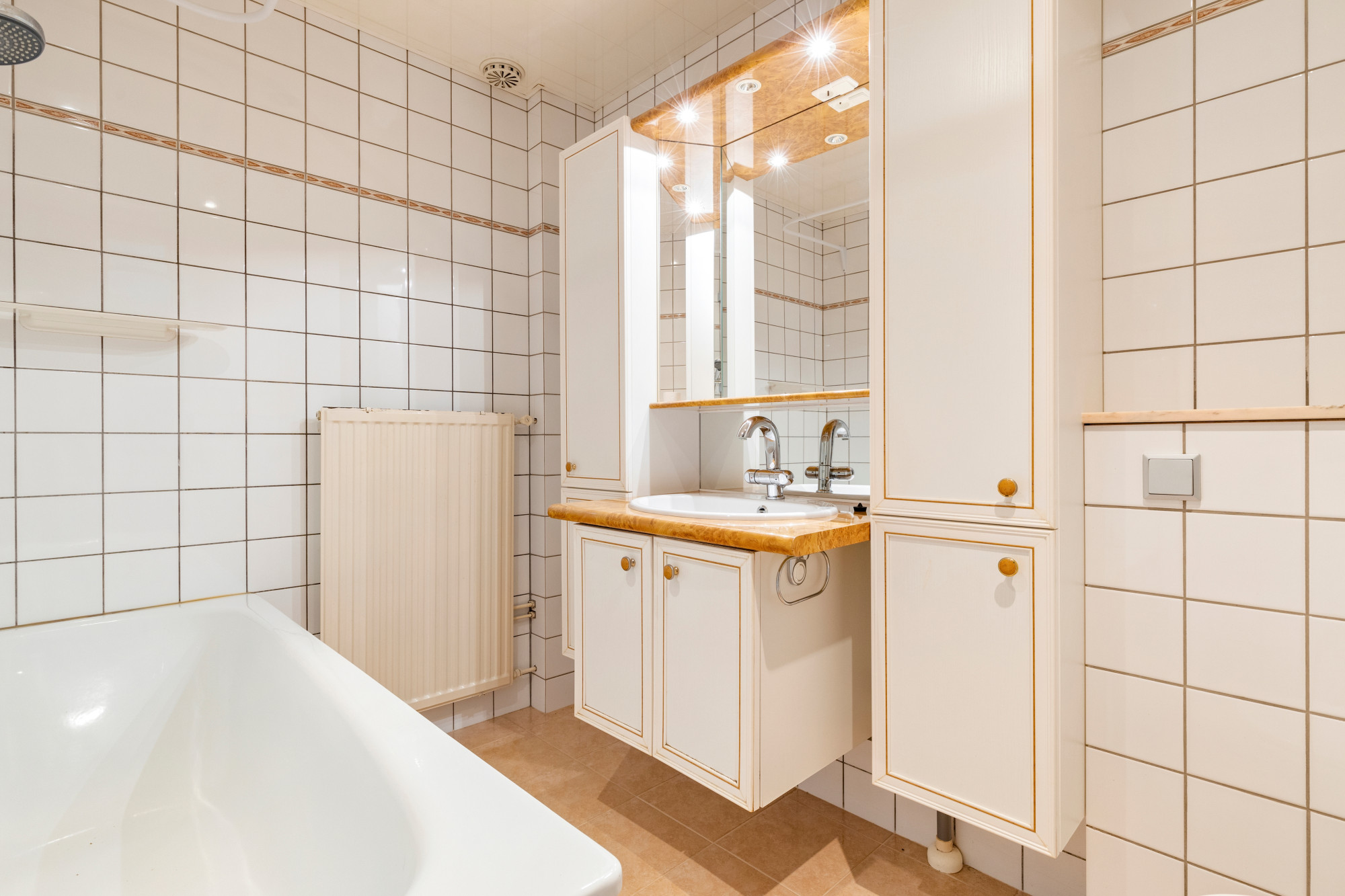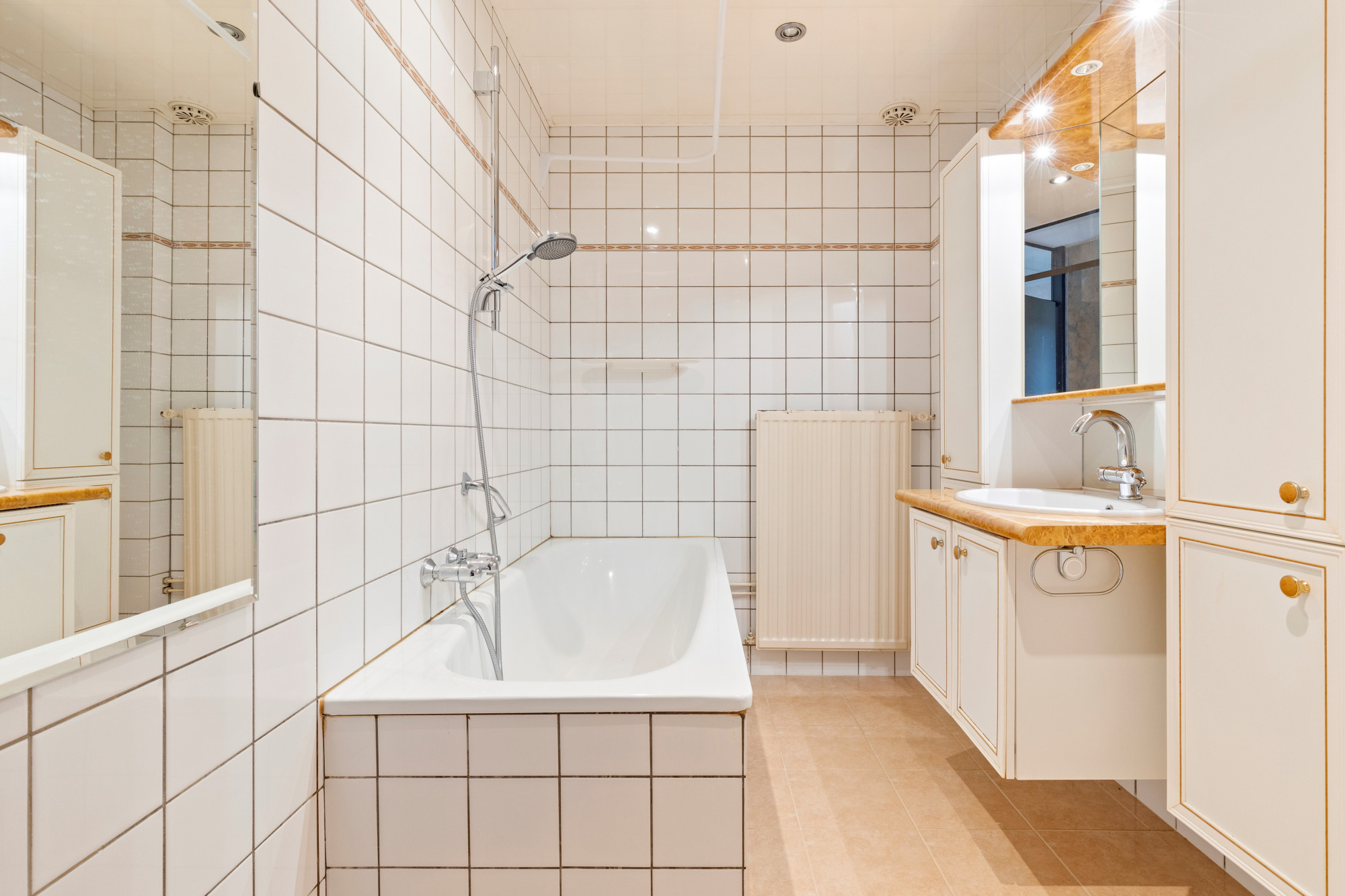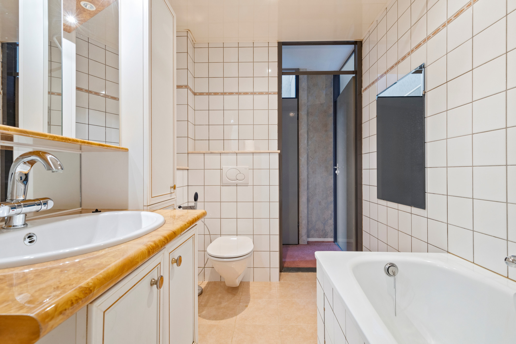 Geheel betegelde badkamer v.v. 2e toilet (inbouw), badkamermeubel, ligbad en radiator.