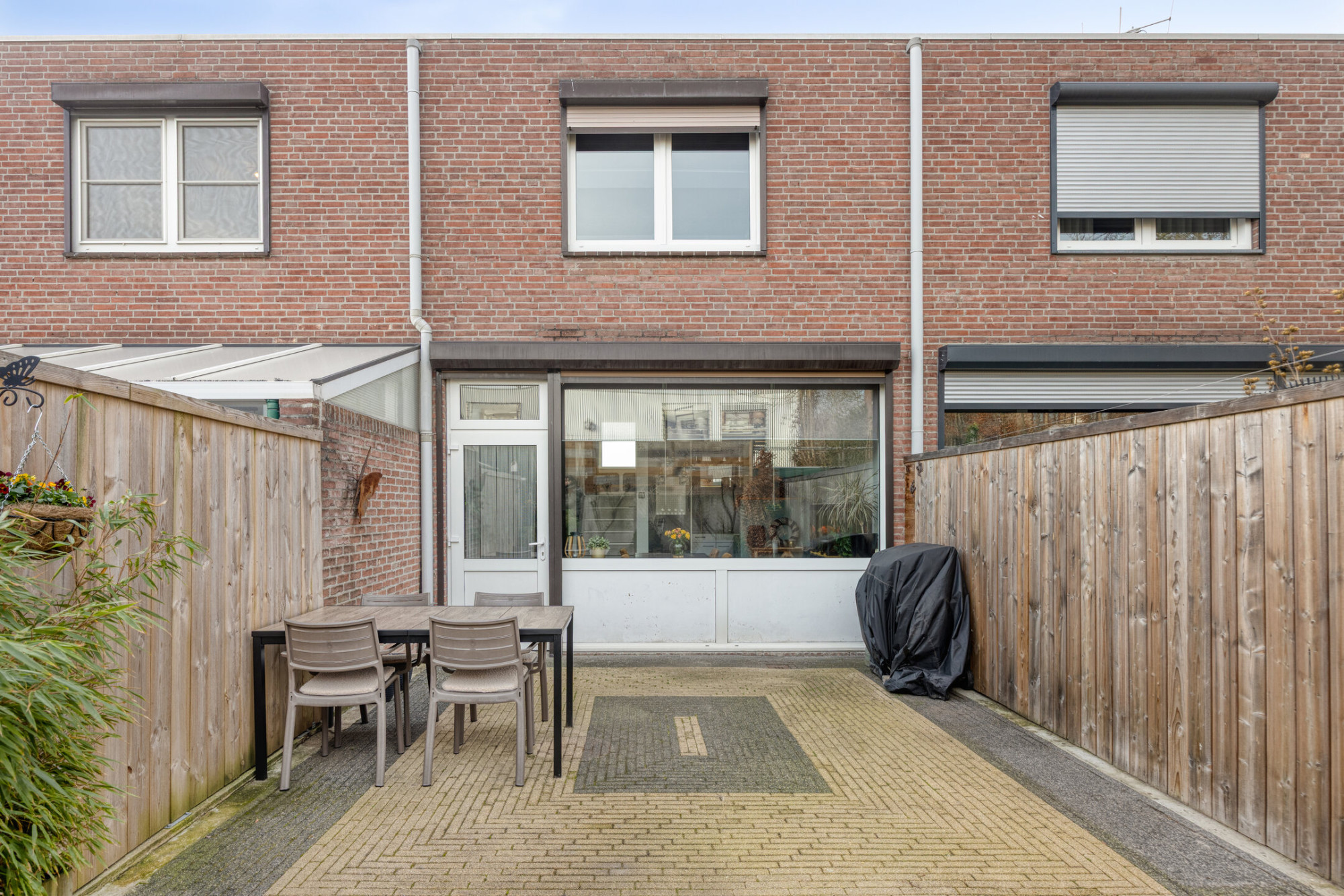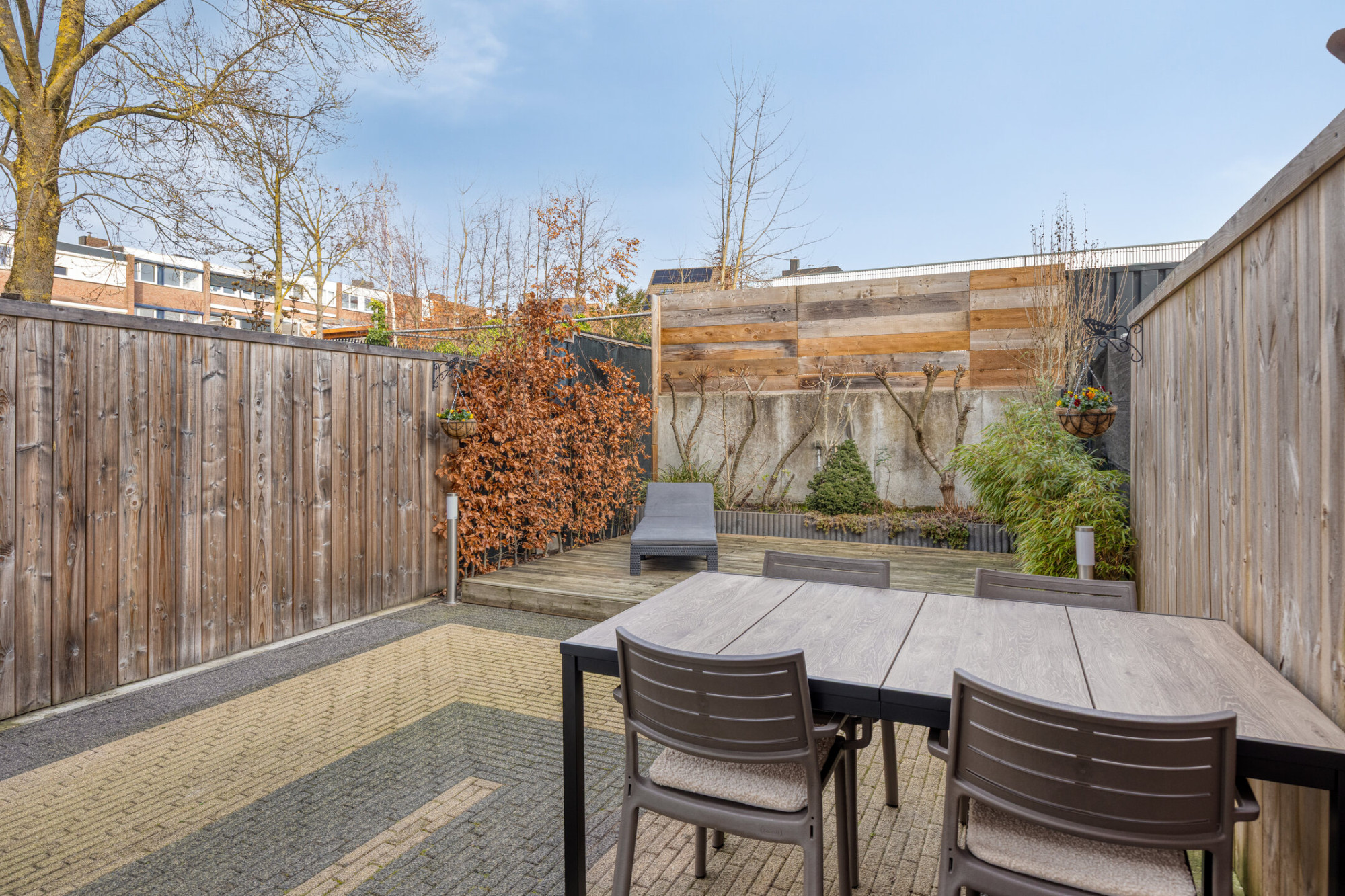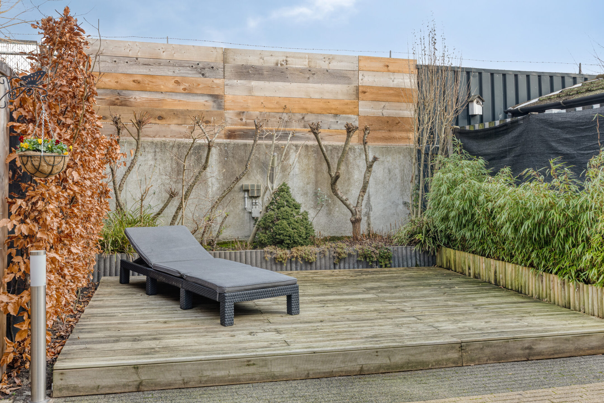 De geheel omsloten achtertuin, gelegen op het noordoosten, is verzorgd aangelegd met een ruim beklinkerd terras, borders met aanplanting en een vlonder met zithoek – een fijne plek om in alle rust buiten te genieten.