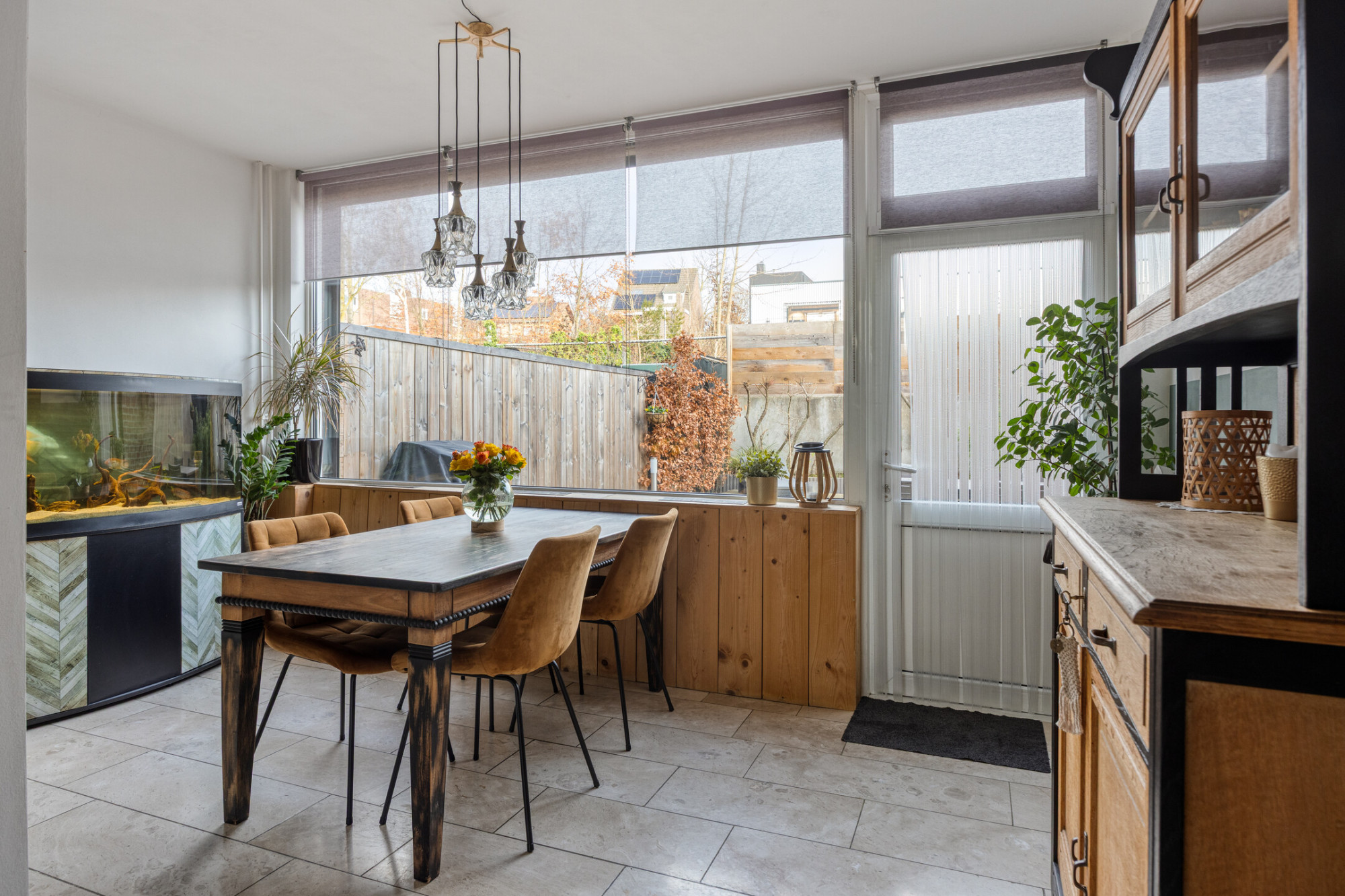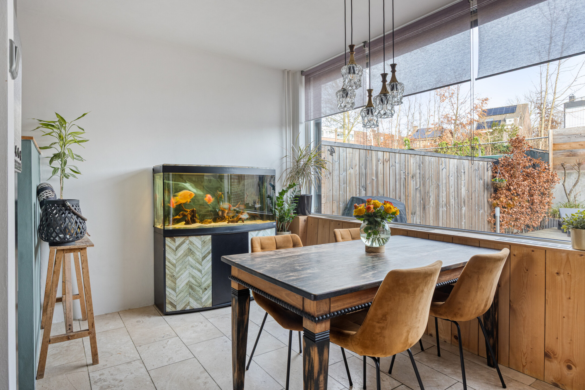Eethoek met loopdeur naar de geheel omsloten onderhoudsvriendelijke achtertuin met terras, borders met aanplanting en en vlonder met zithoek.