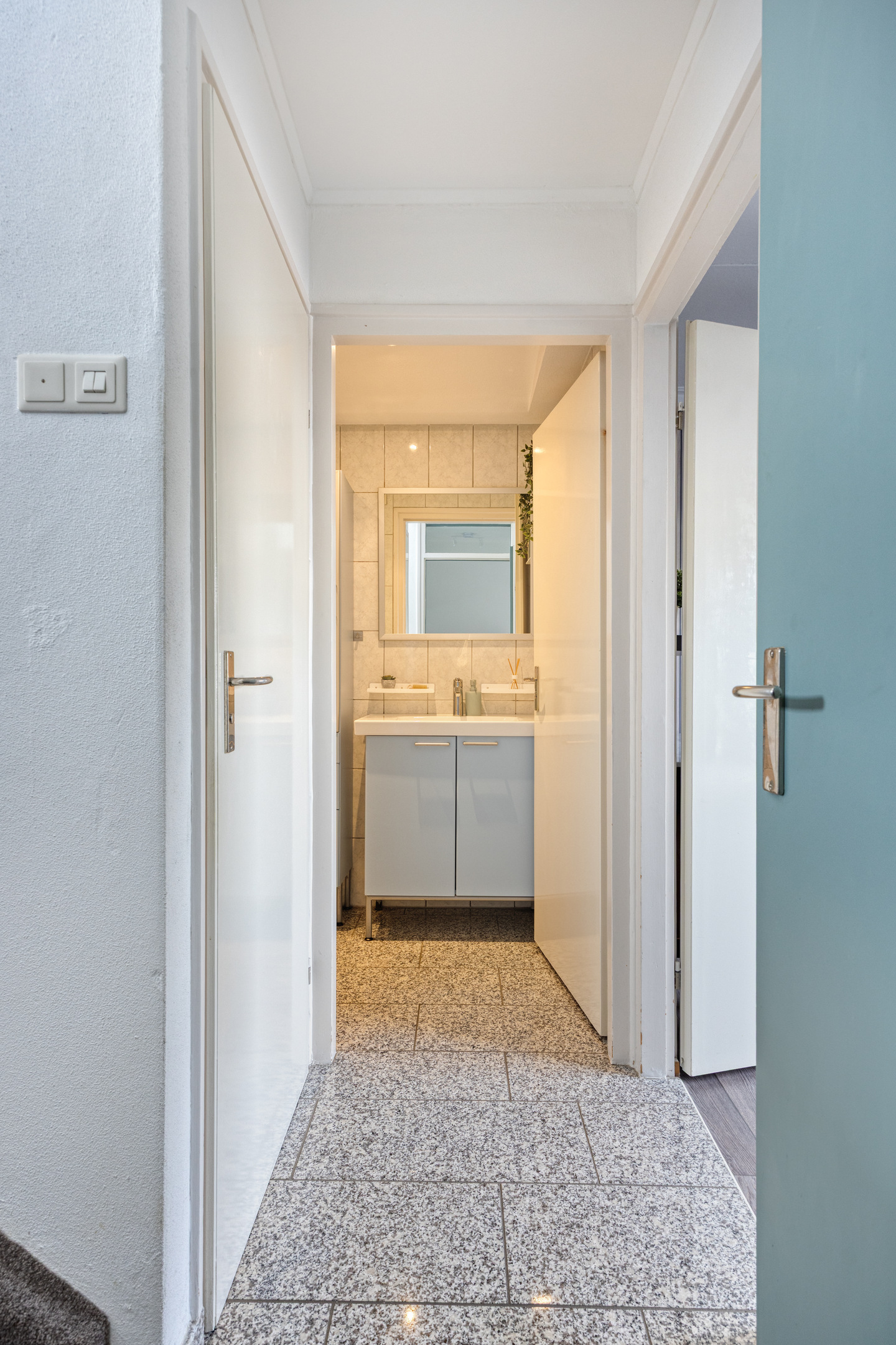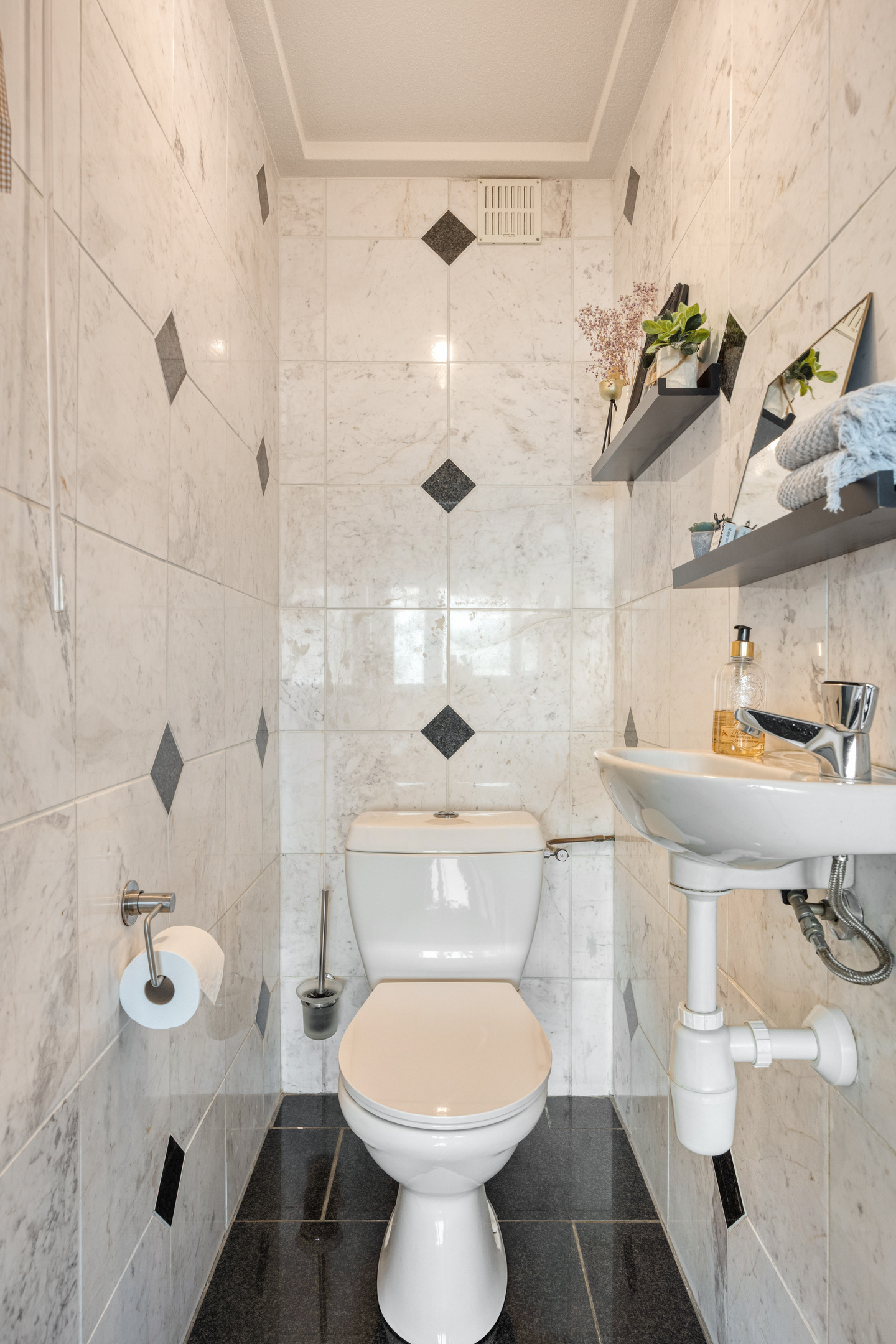 Separaat modern afgewerkt gastentoilet met zwevend wandcloset en een waskom. Toegang tot een wandkast en de kruipruimte.